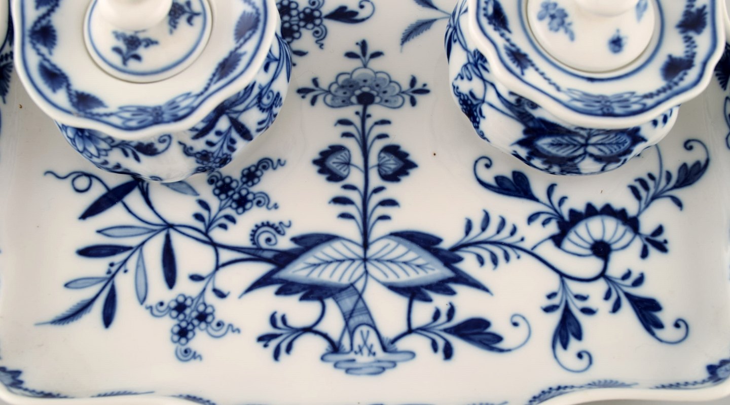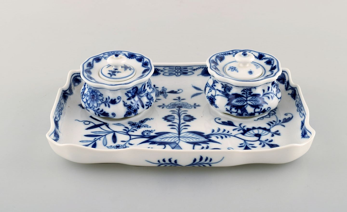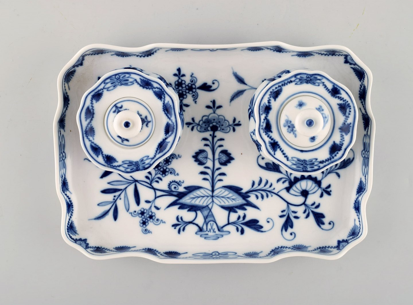 Meissen Blue Onion ink well in hand painted porcelain. 1930-50's. Measures: 22.5 x 15.5 cm. In very good condition. Stamped. 2nd factory quality.