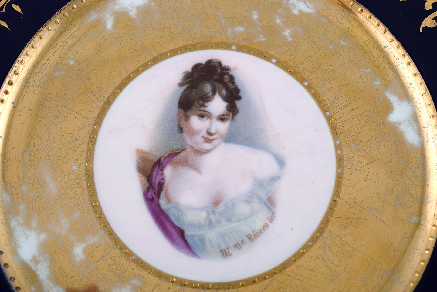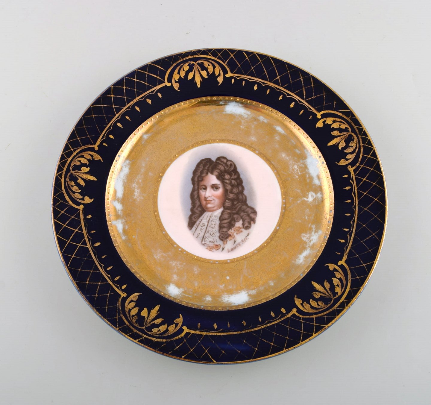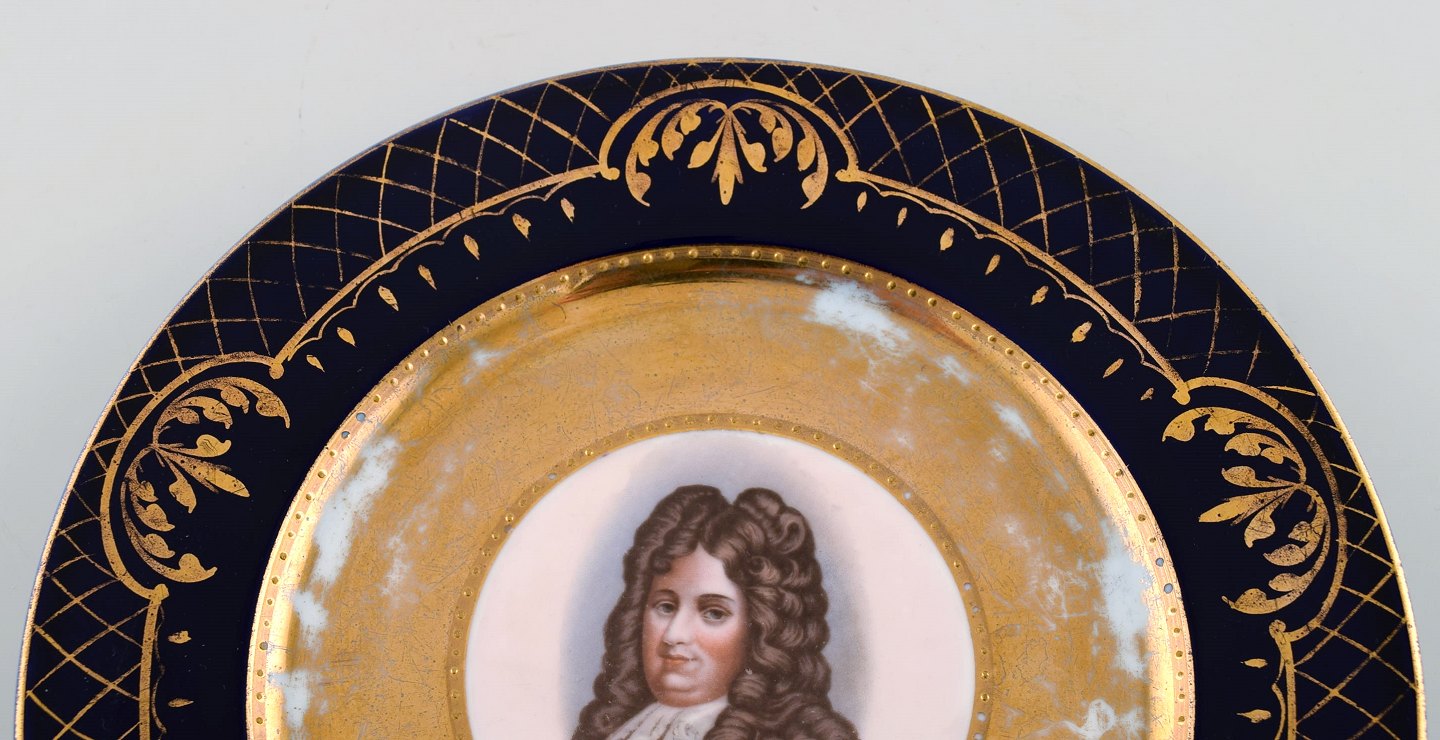 To dekorationstallerkener i håndmalet porcelæn med gulddekoration. Motiver af Louis XIV og Madame Récamier. Wien, ca 1900. I flot stand med brugspræg. Diameter: 24 cm. Stemplet.
