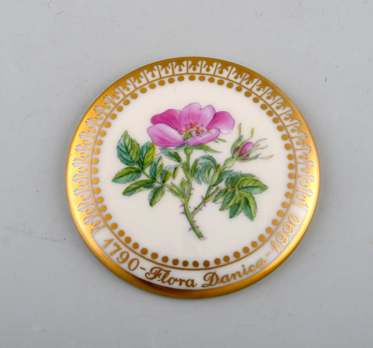 Royal Copenhagen Flora Danica sminkespejl i håndmalet porcelæn. Blomstermotiv og gulddekoration. 200-års jubilæum. Dateret 1990. Diameter: 6,5 cm. I flot stand.