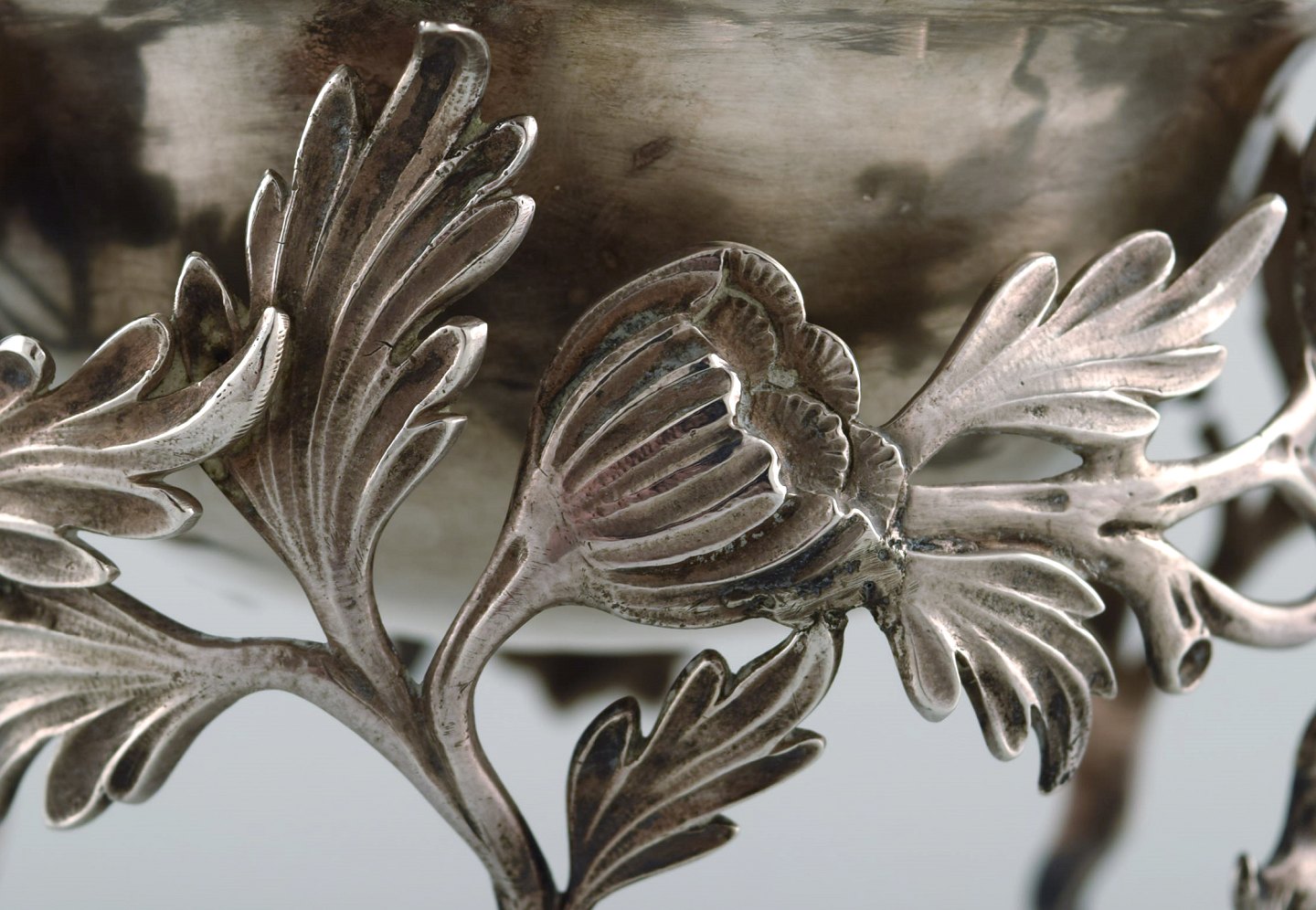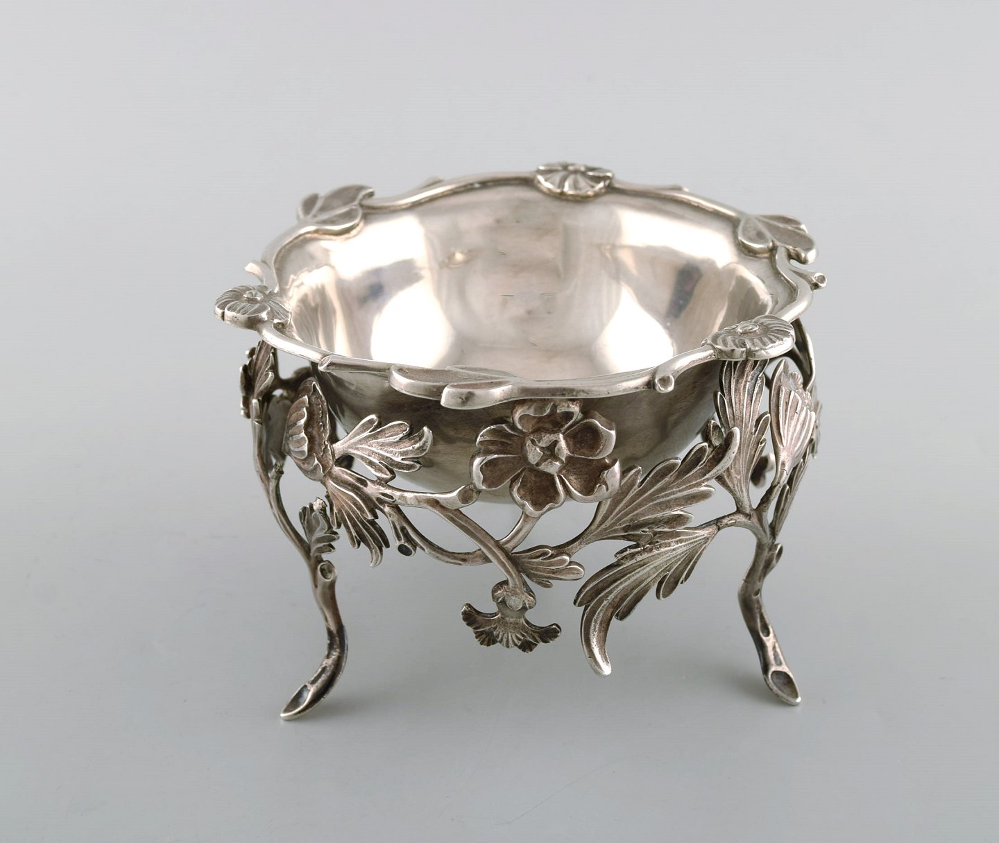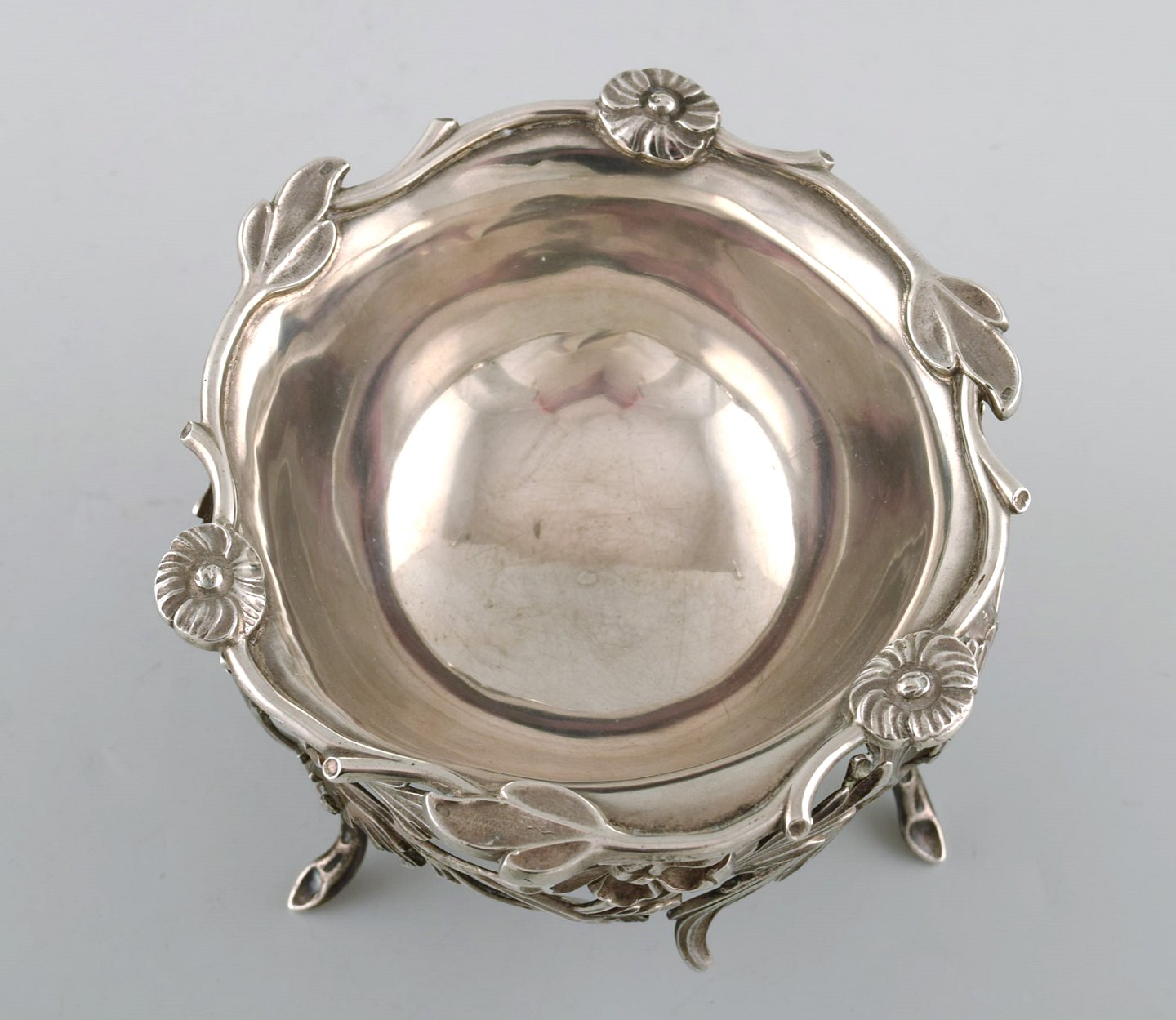 Antique bowl in plated silver decorated with flowers and foliage. Southern Europe, late 19th century. Measures: 14 x 9.5 cm. In good condition. Stamped.