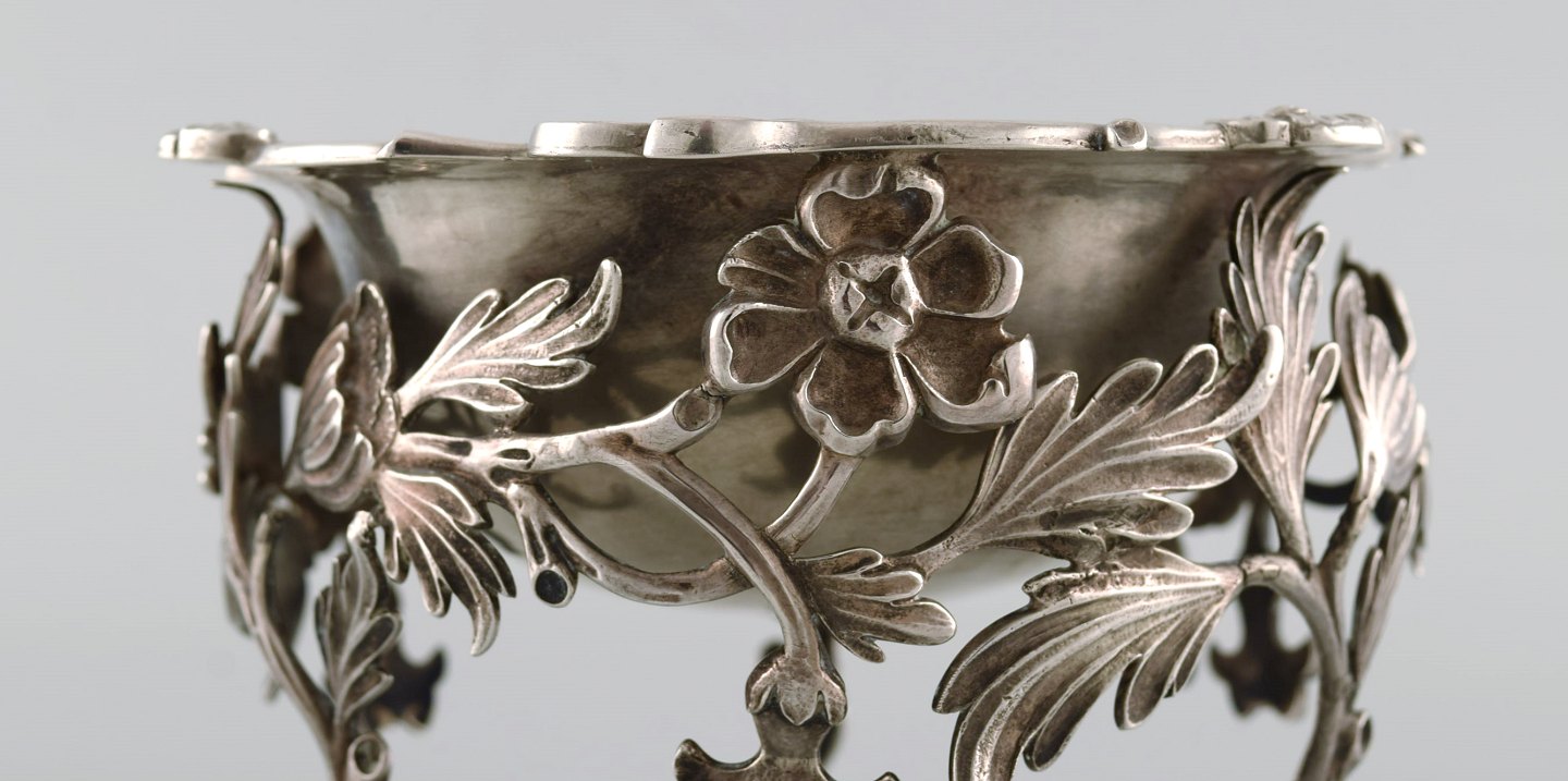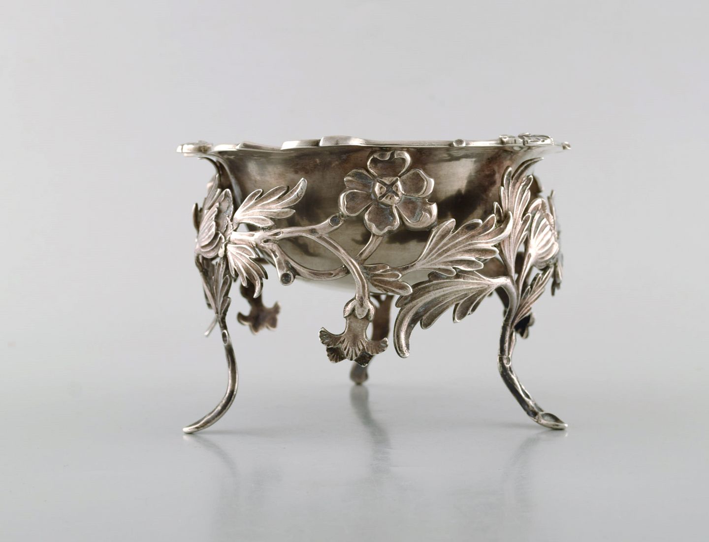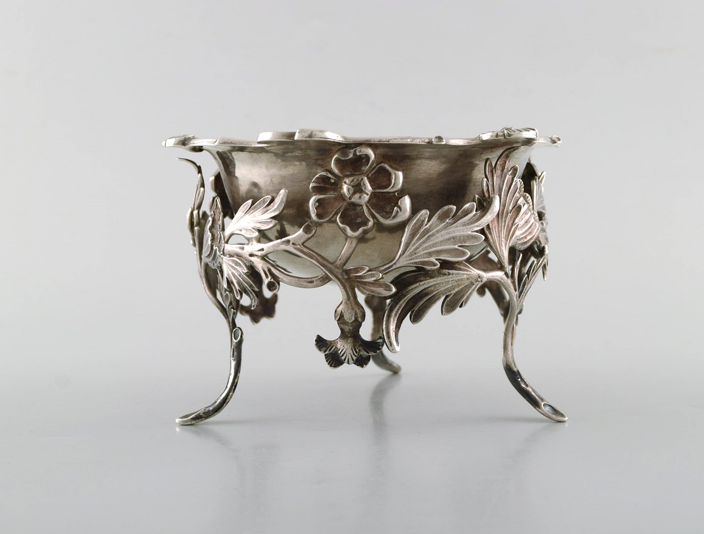 Antique bowl in plated silver decorated with flowers and foliage. Southern Europe, late 19th century. Measures: 14 x 9.5 cm. In good condition. Stamped.