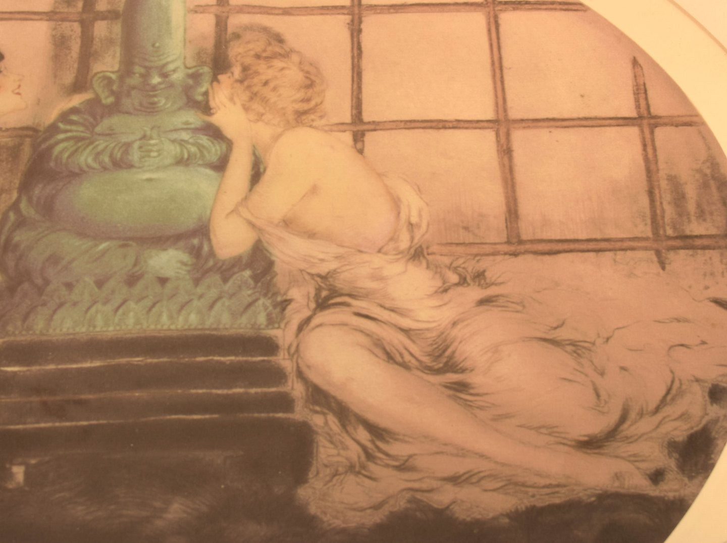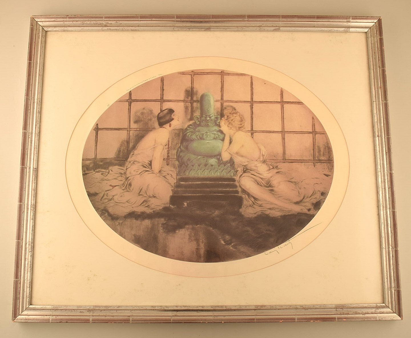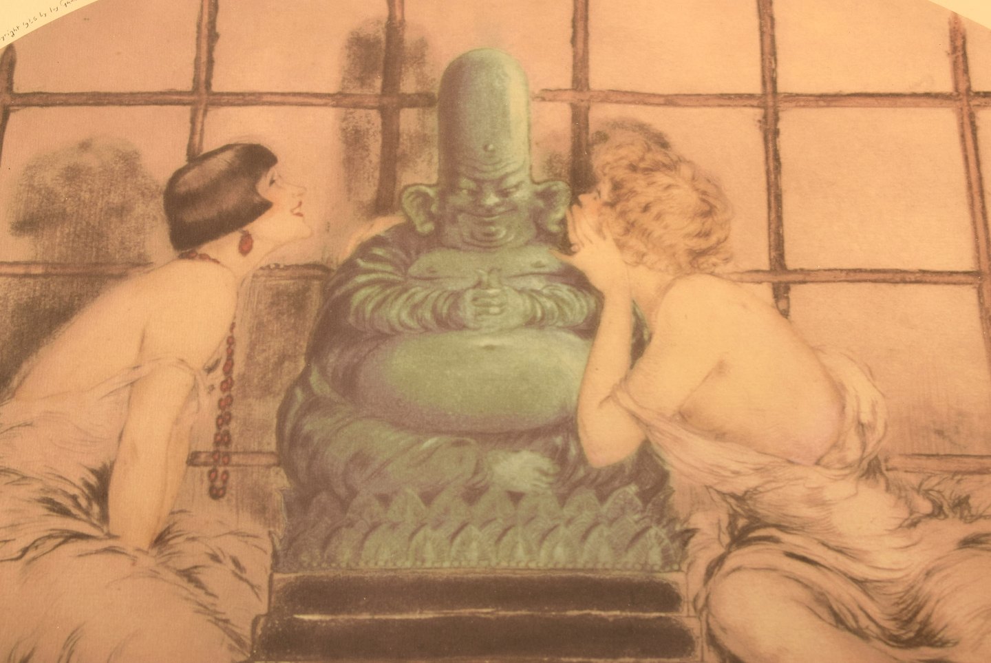 Louis Icart (1888-1950). Etching on paper. Women and buddha. 1920 / 30's. Signed with pencil. In very good condition. Measures: 52 x 41 cm. The frame measures: 3,5 cm.