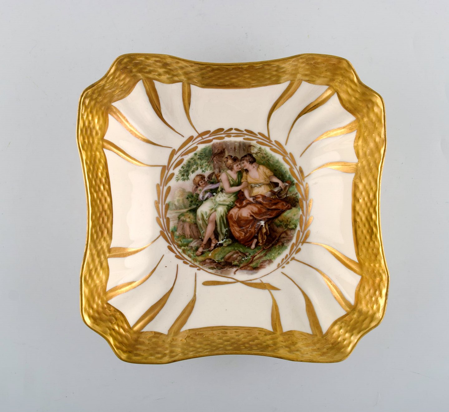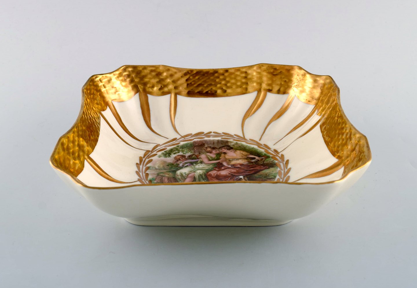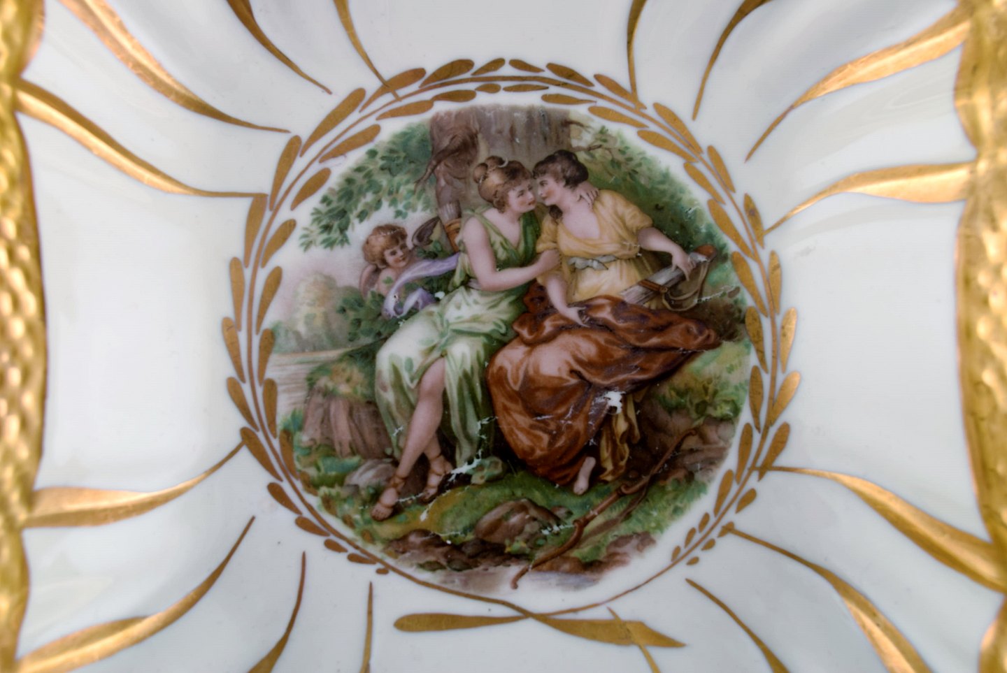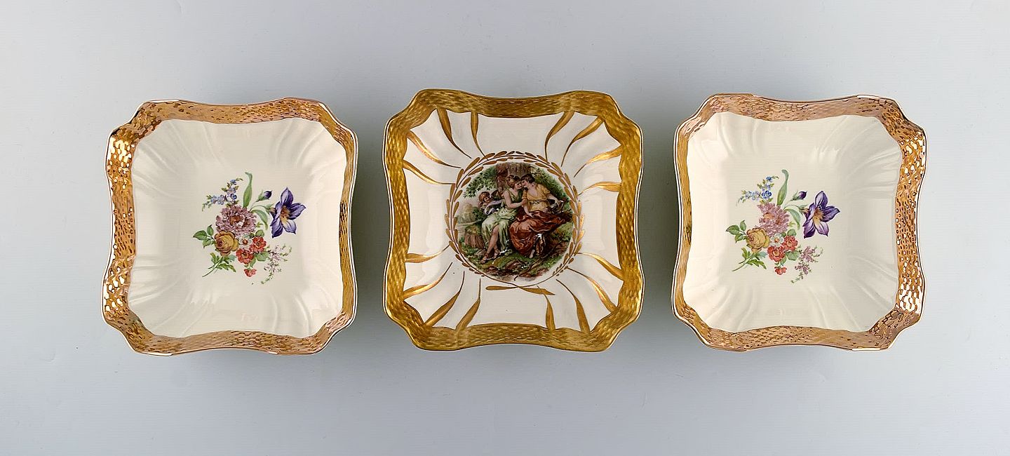 Royal Copenhagen. Tre skåle med blomster og romantiske scenerier. Gulddekoration. 20 årh. Måler: 25 x 6 cm. I flot stand. Stemplet.