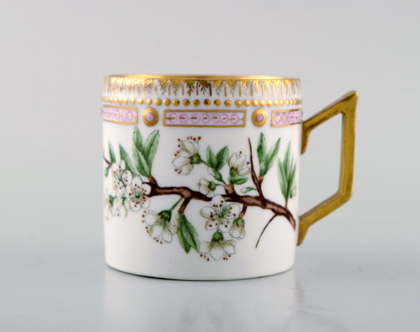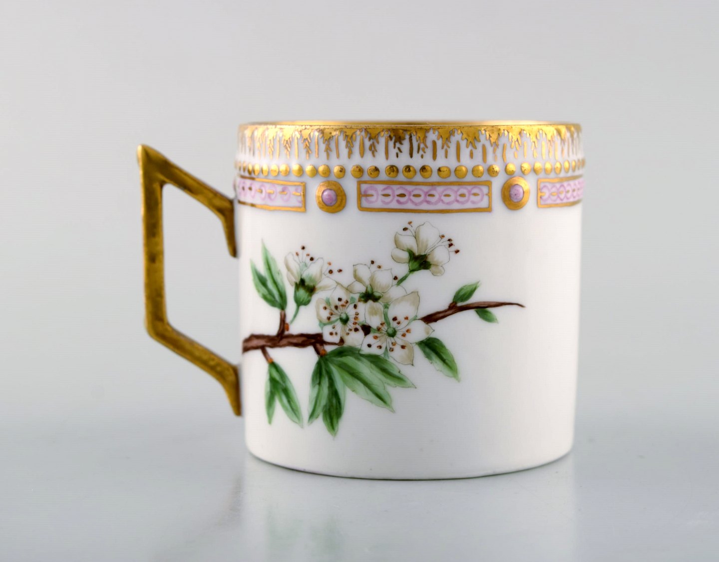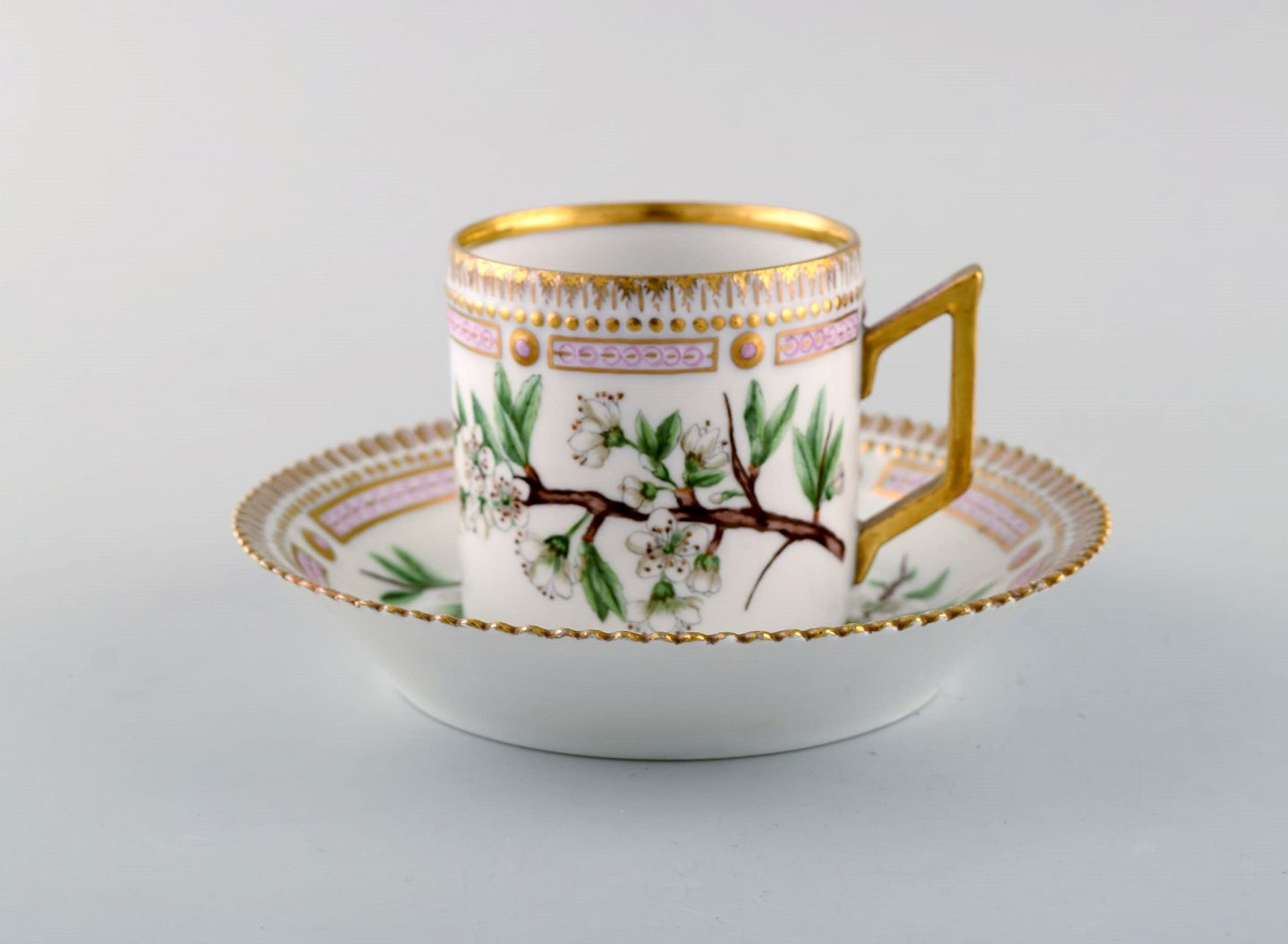 Royal Copenhagen flora danica chocolate cup with saucer. Decorated with blackthorn. The cup measures: 6.5 x 6.5 cm. The saucer measures: 14 x 3 cm. 2nd factory quality. In perfect condition. Stamped.