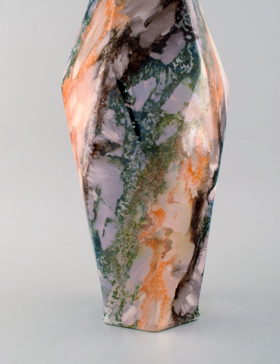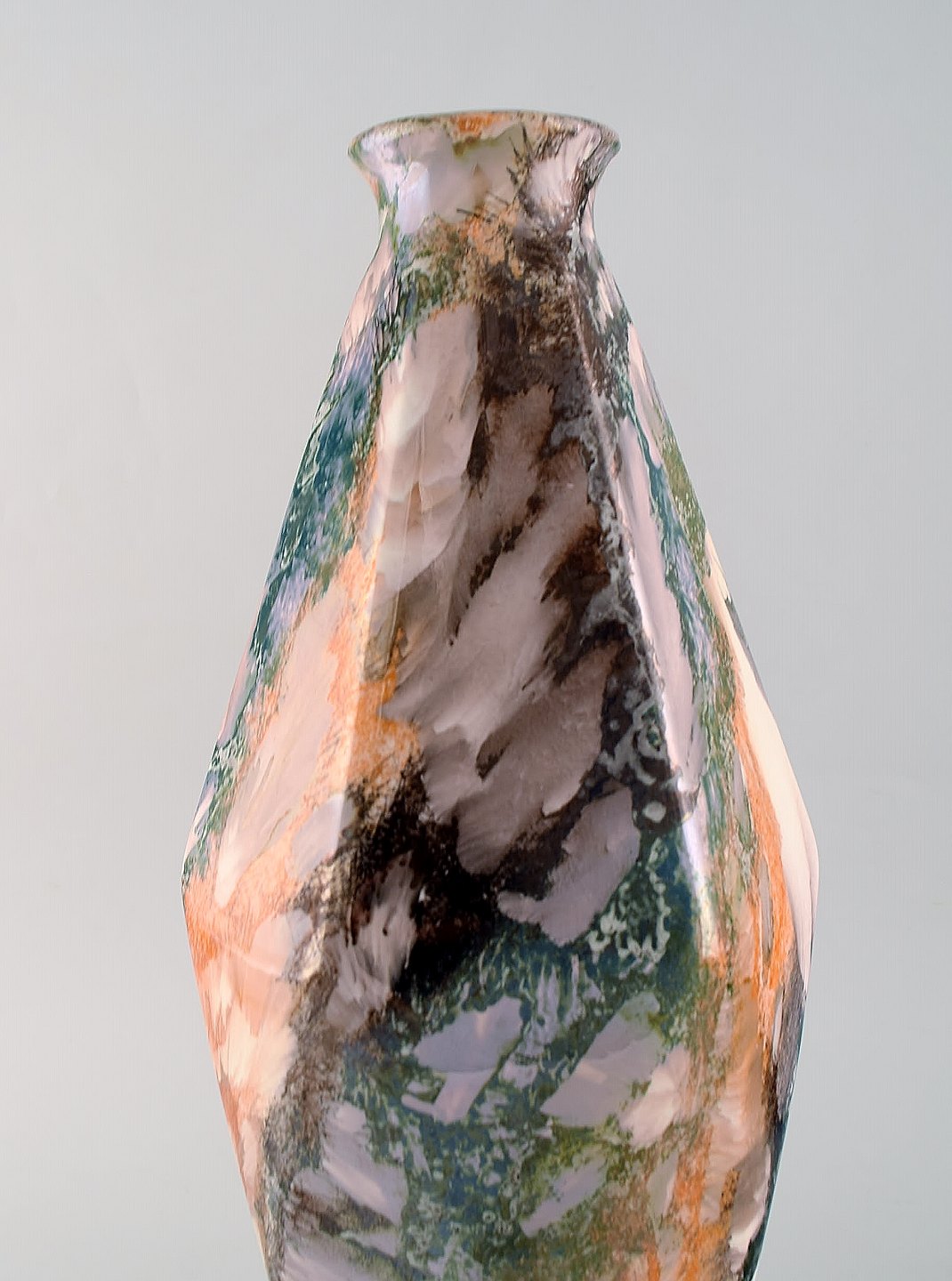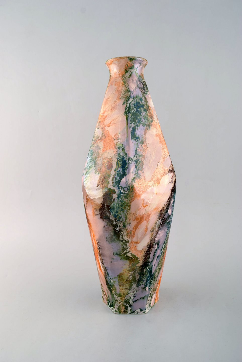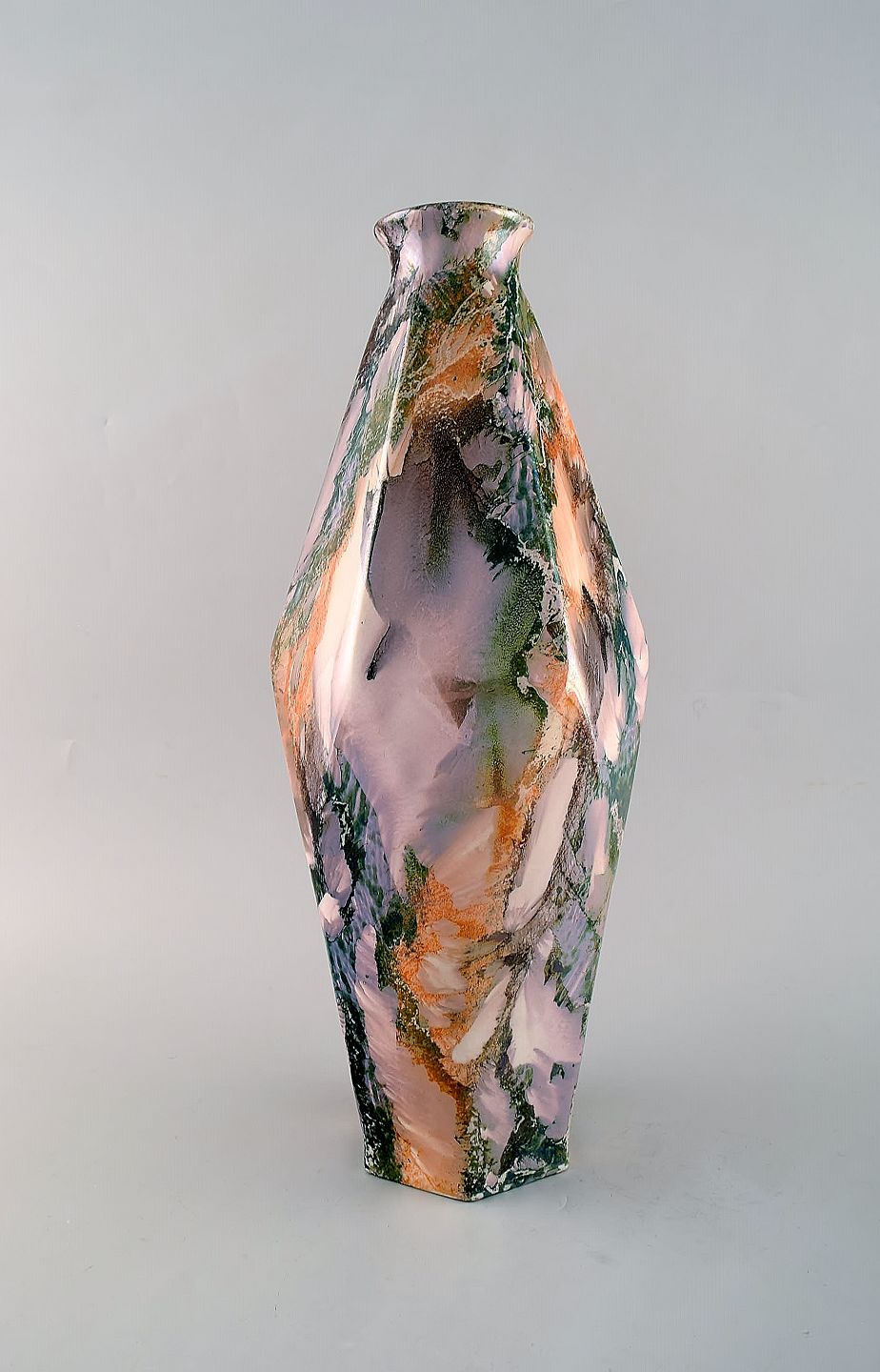 Tidlig art deco Rörstrand vase i glaseret fajance. Glasur med smuk flerfarvet marmor effekt. Kantet form. Ca. 1920. Måler: 41 x 17cm. I flot stand. Signeret.