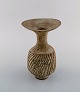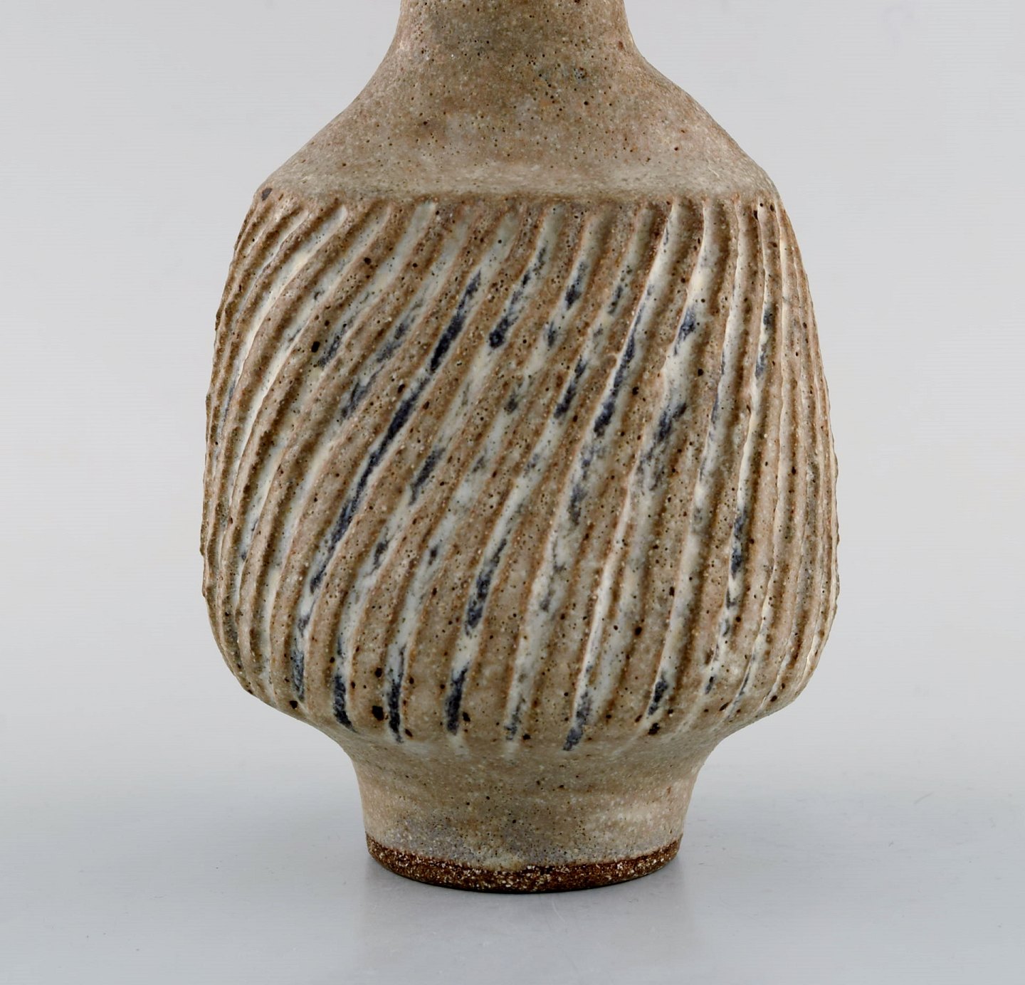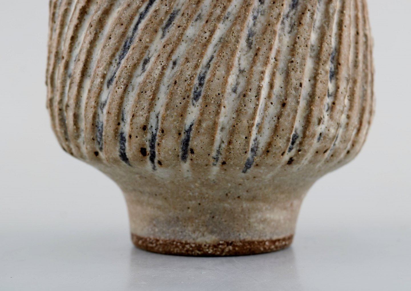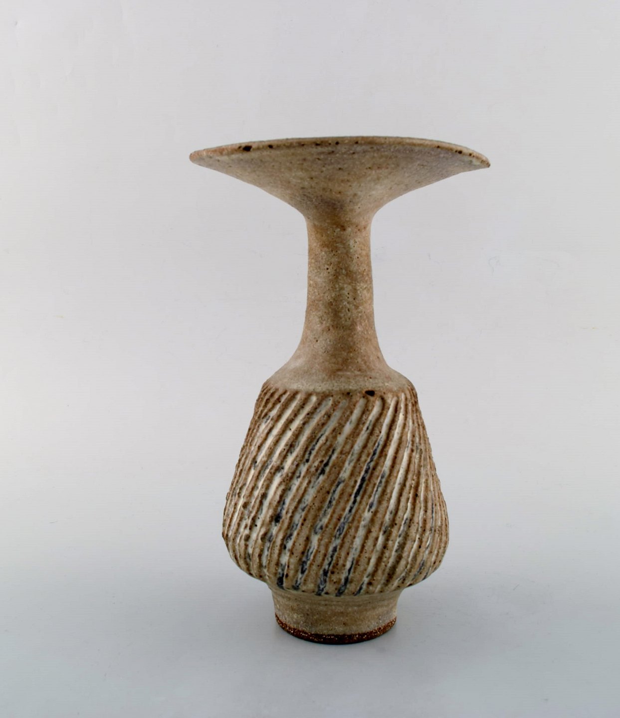 Lucie Rie (b. 1902, 1995), Austrian-born British potter. Large modernist unique vase in glazed ceramics / stoneware. Beautiful glaze in bright earth shades. Fluted body. Trumpet shaped mouth. Own workshop, ca. 1970.
