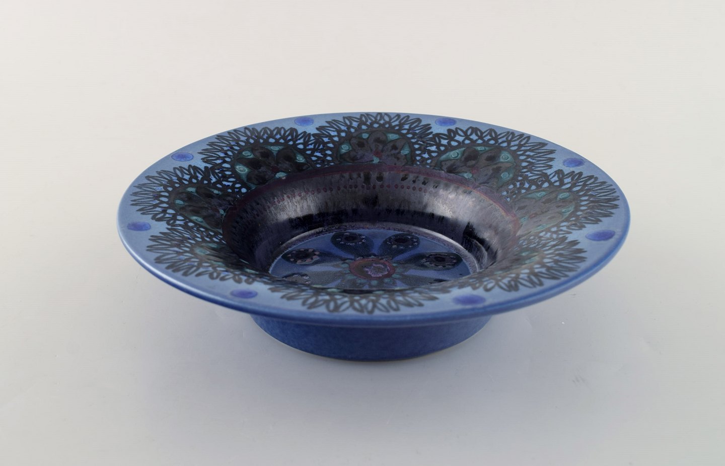 Friedl Holzer Kjellberg for Arabia. Skål i glaseret keramik. Blomster og smuk glasur i blå nuancer. Finsk design, 1950'erne. Måler: 20 x 4,7 cm. I flot stand. Stemplet.
