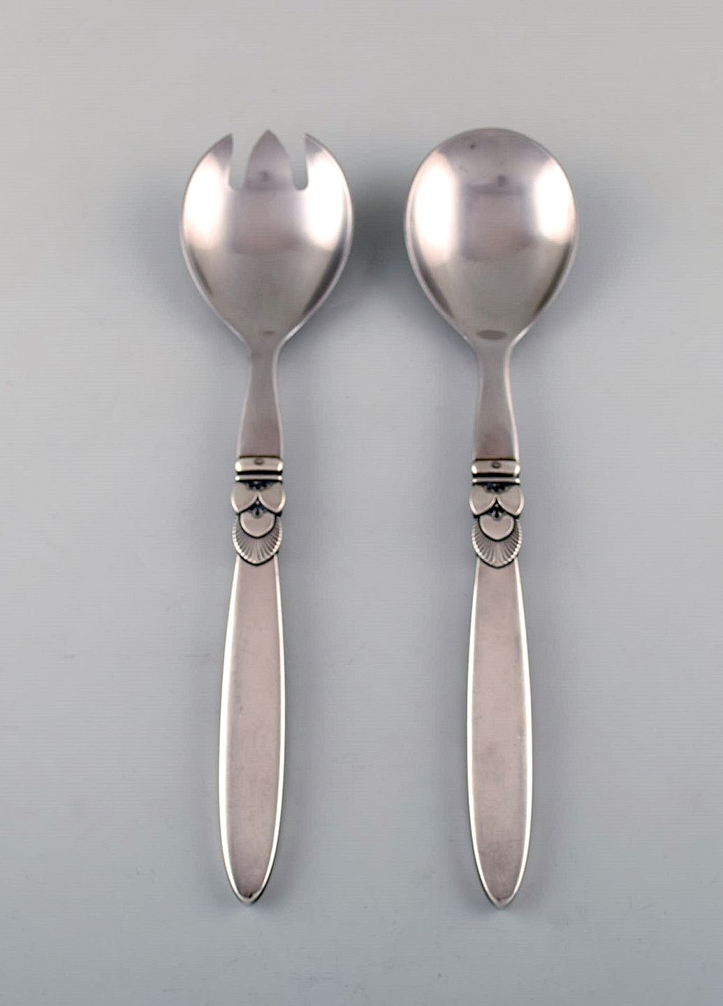 Stort Georg Jensen "Kaktus" salatsæt i sterlingsølv og rustfrit stål.