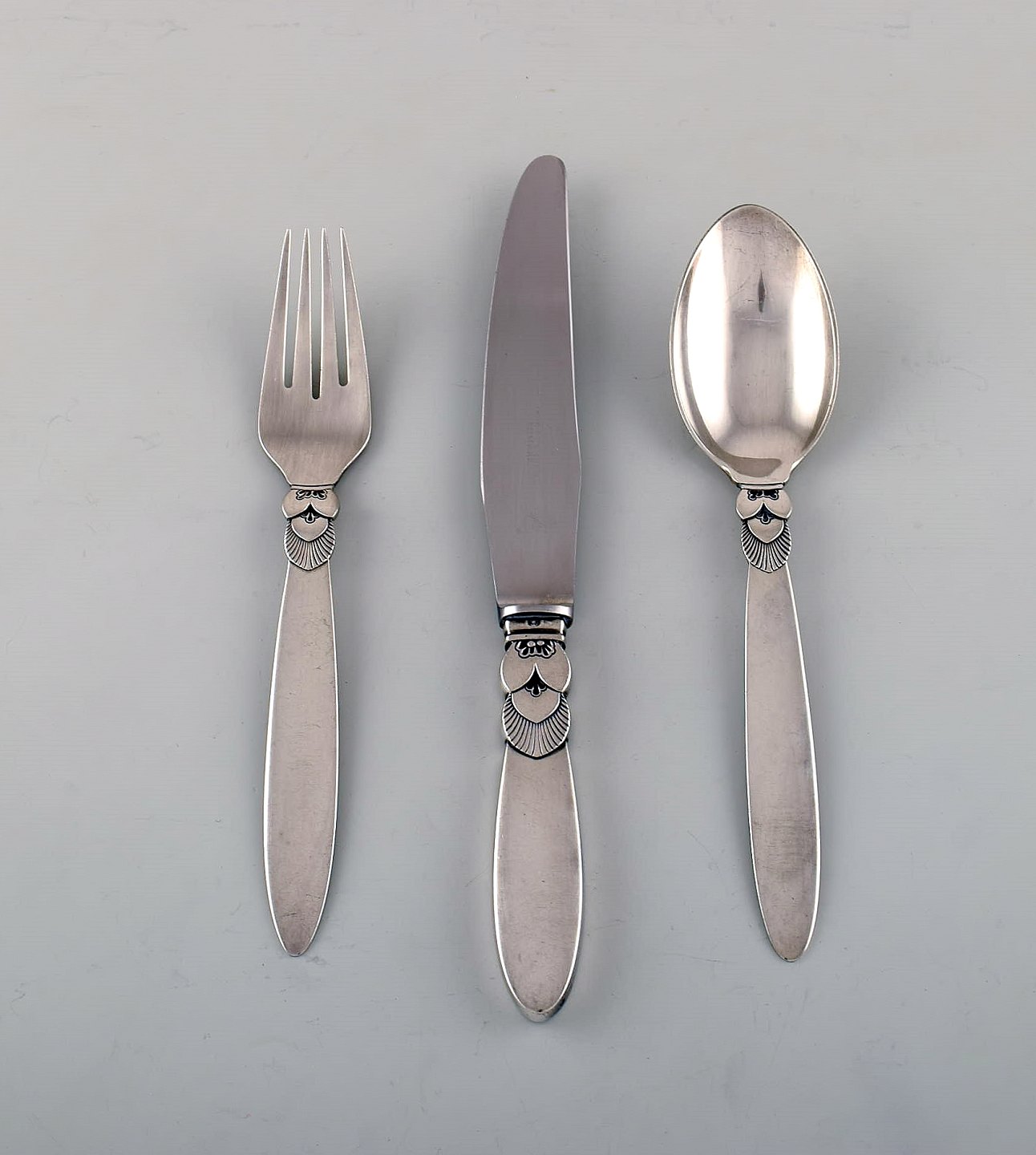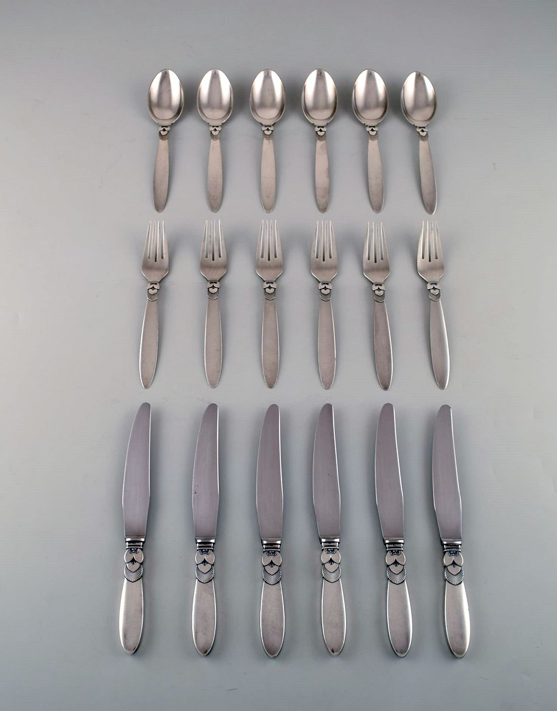 Georg Jensen "Cactus" cutlery. Complete dinner service for six people in sterling silver.