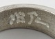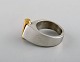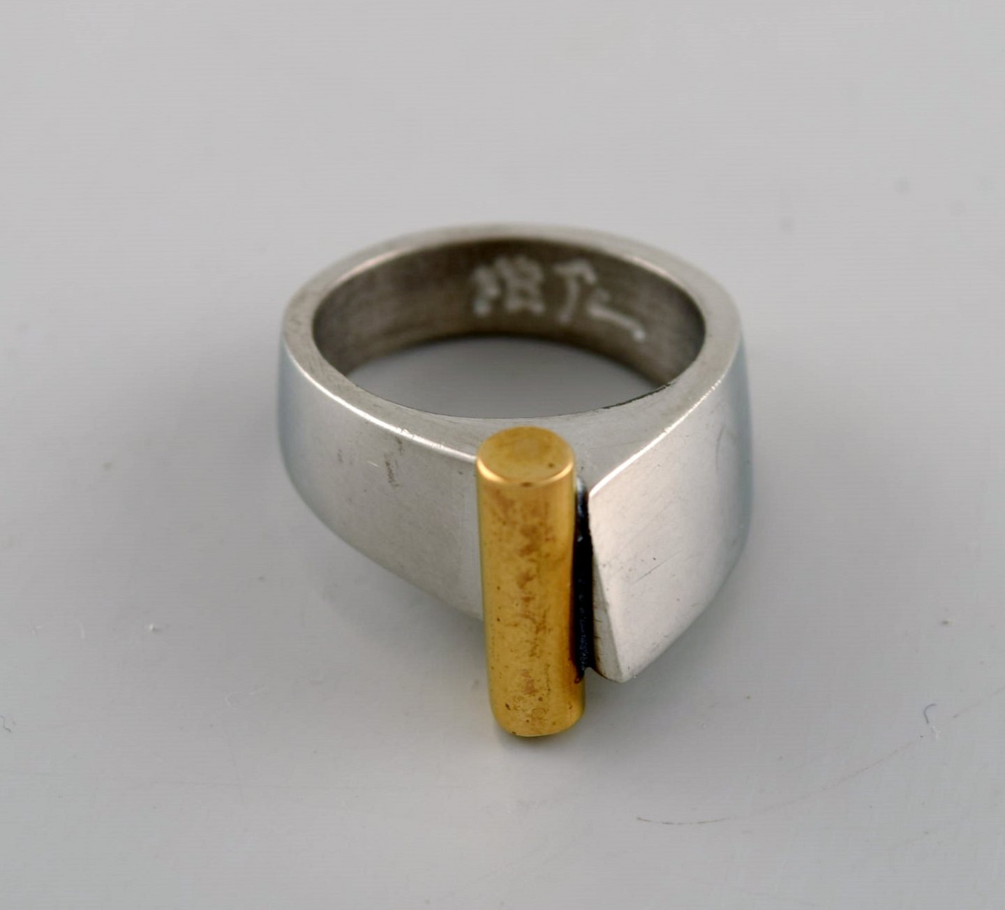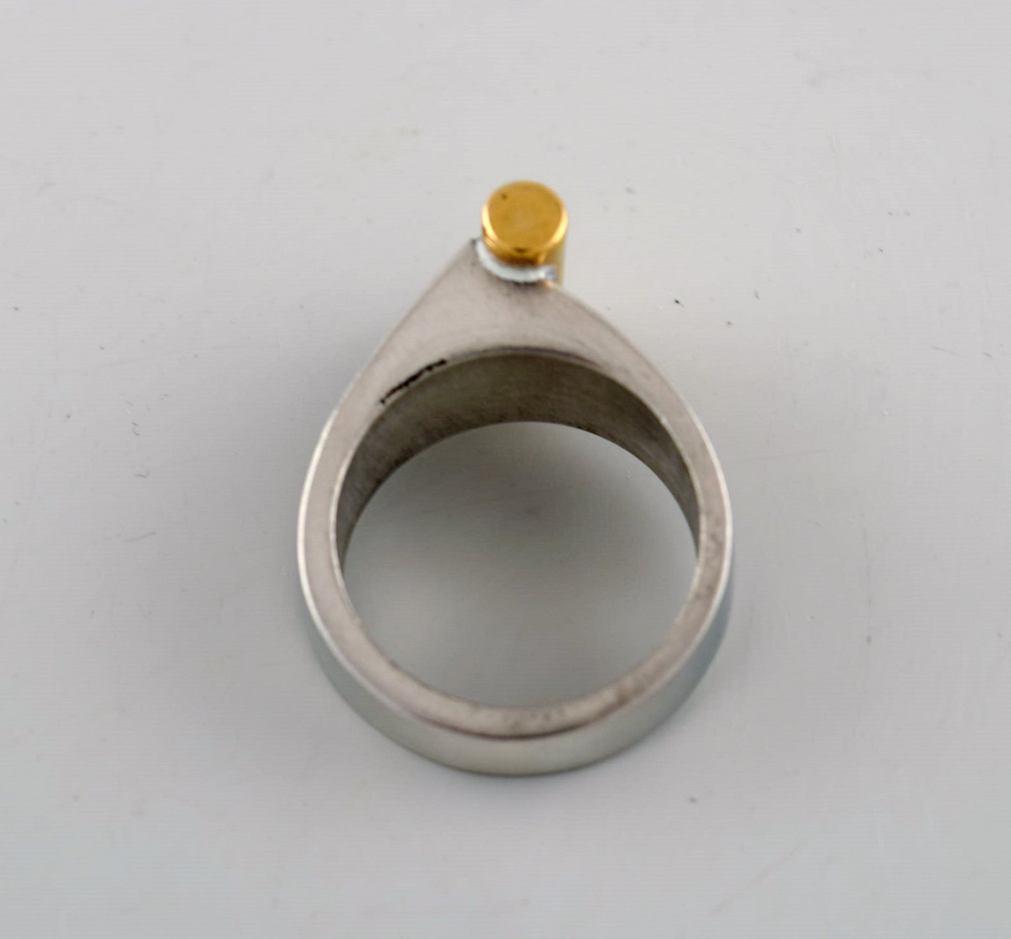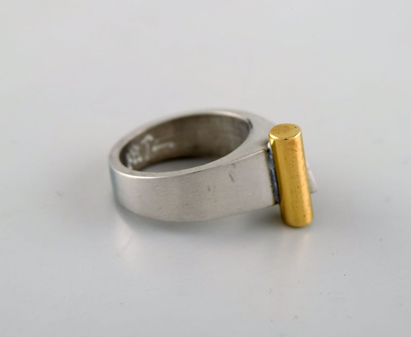 Micke Berggren, Sverige. Modernistisk designerring i tin og messing. Sent 1900-tallet. Diameter: 16,3 mm. US size: 5.75. I flot stand. Stemplet.