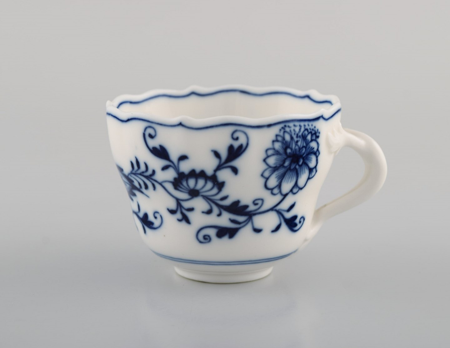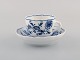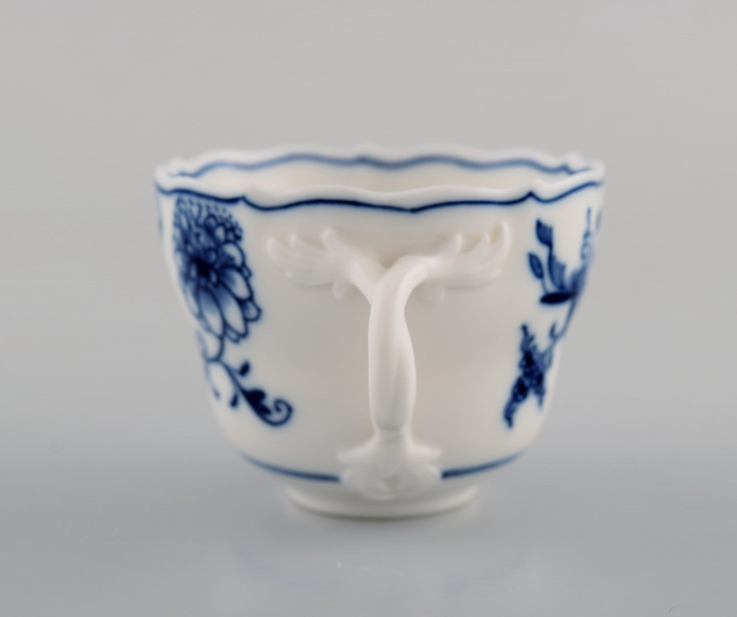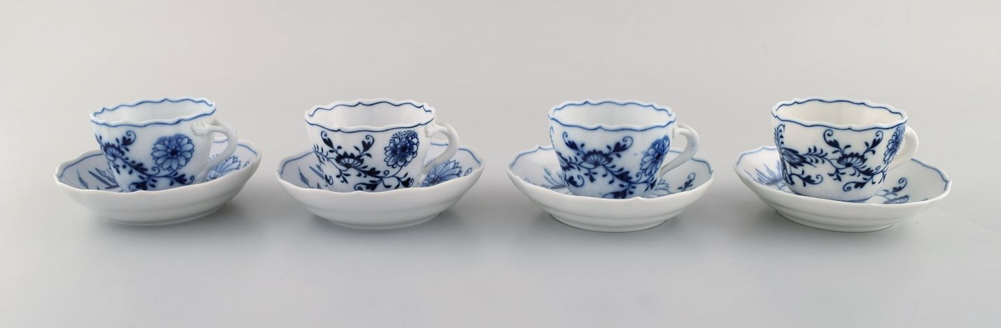 Four antique Meissen "Blue Onion" coffee cups with saucer in hand-painted porcelain. Early 20th century.