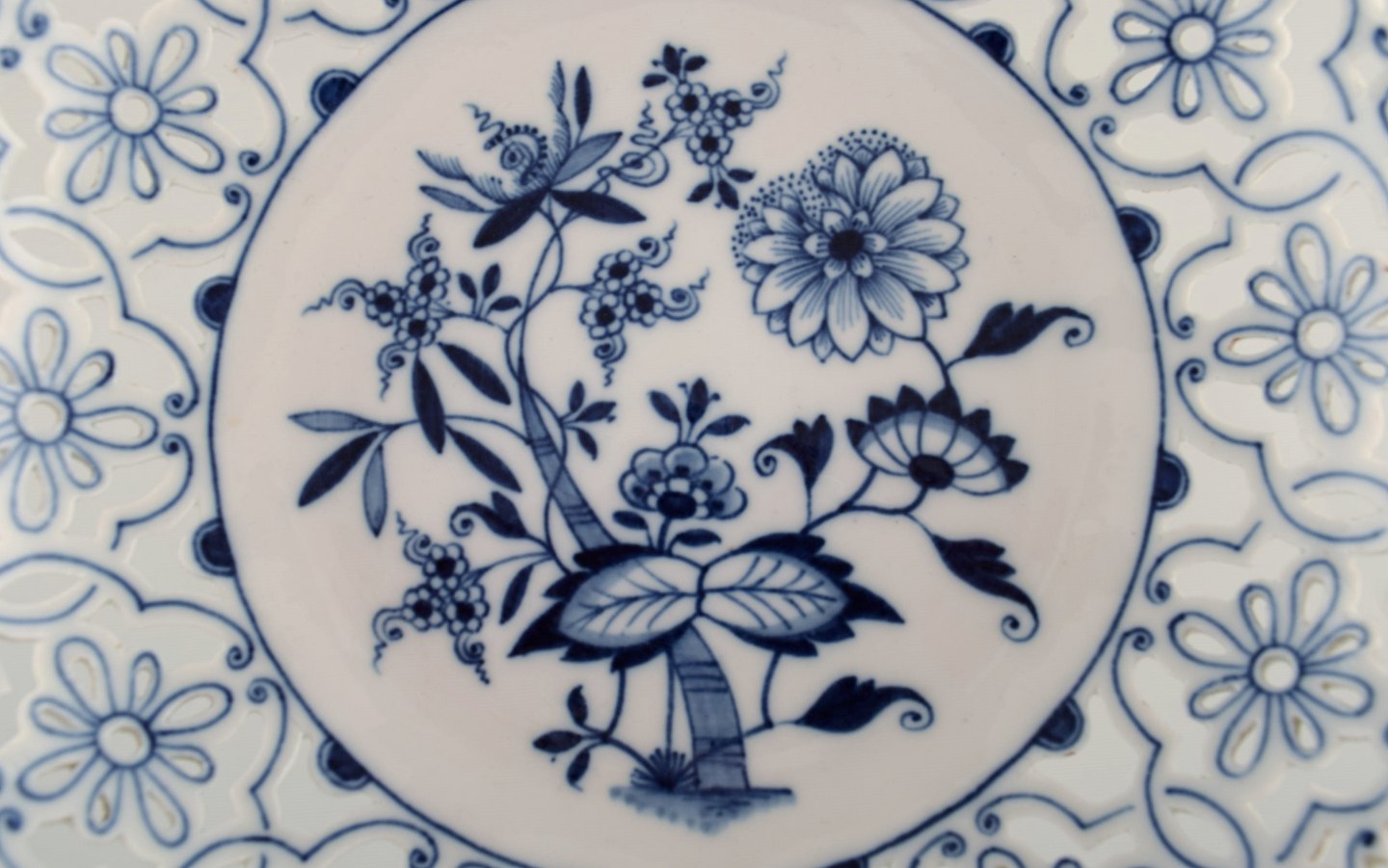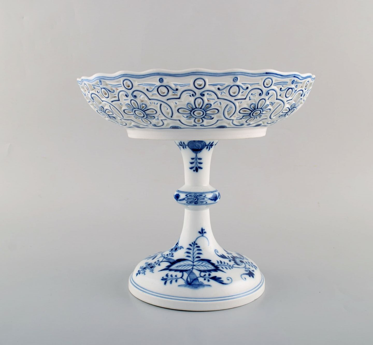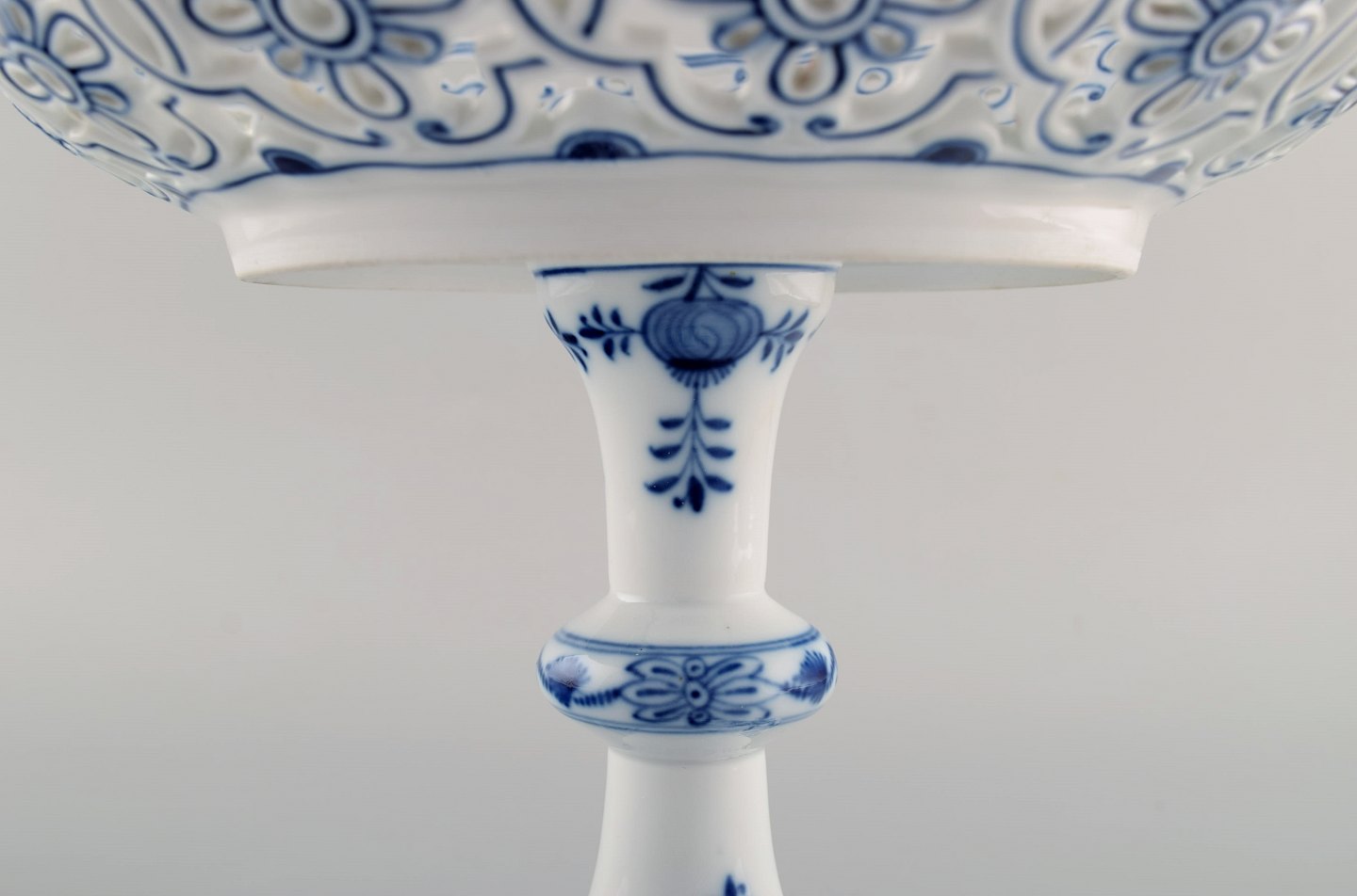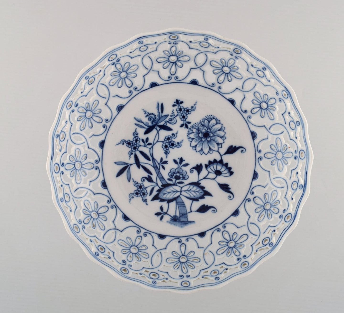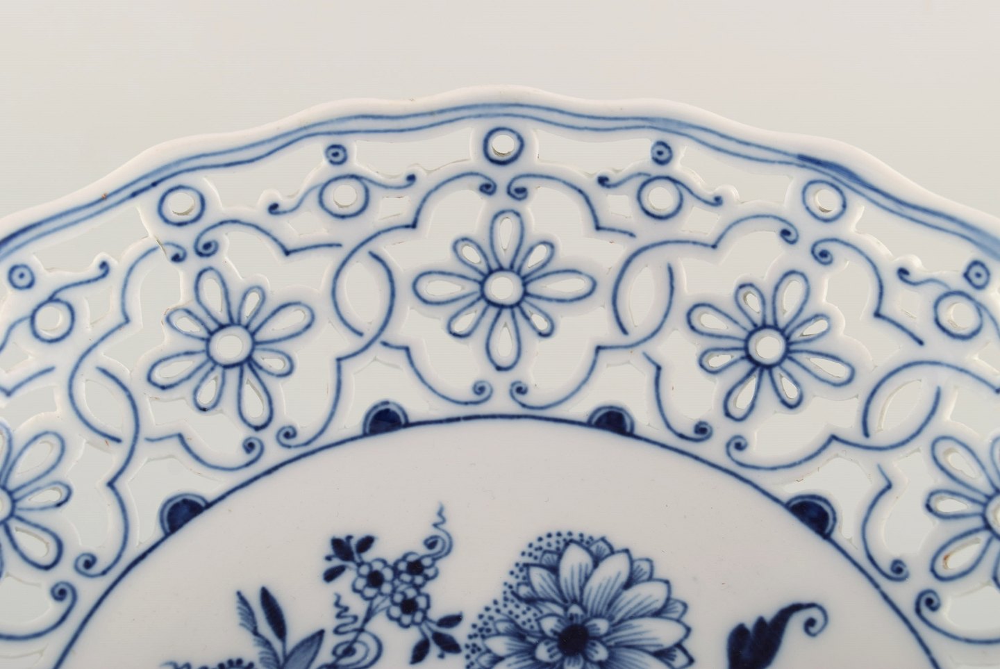 Antik Meissen "Løgmønstret" opsats i gennembrudt, håndmalet porcelæn. Tidligt 1900-tallet.
