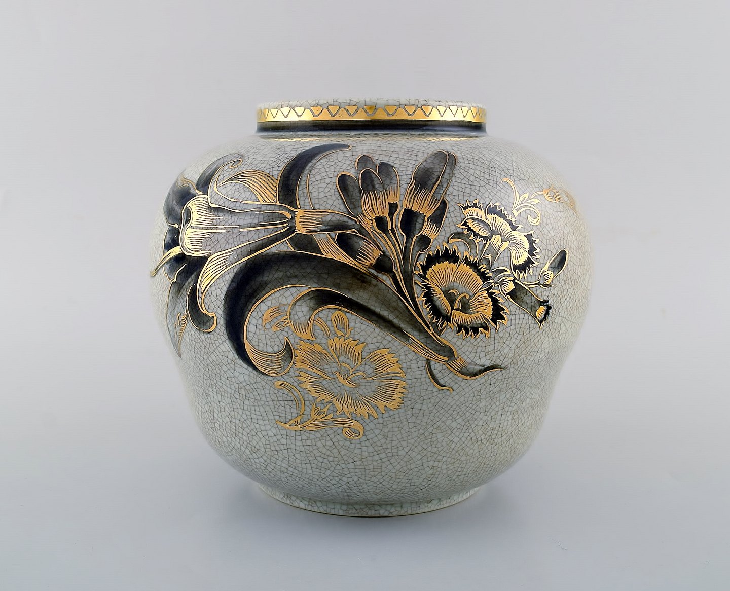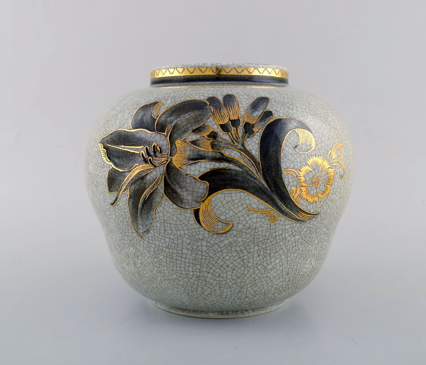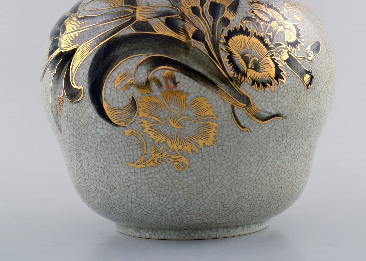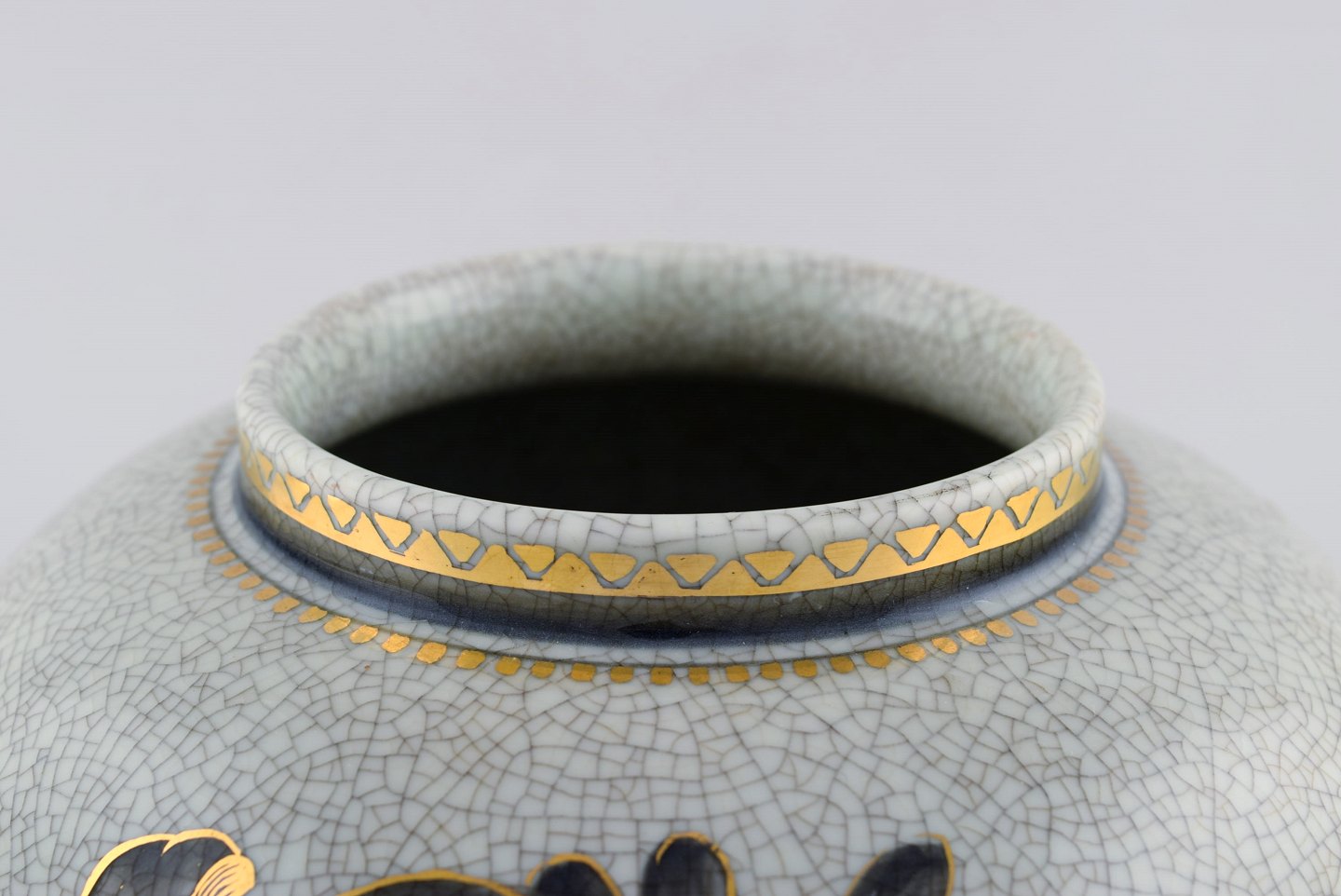 Oluf Jensen for Royal Copenhagen. Unika vase i krakeleret porcelæn med gulddekoration og blomstermotiver. Dateret 1929. Måler: 21 x 18 cm. I flot stand. Stemplet. 1. Sortering.