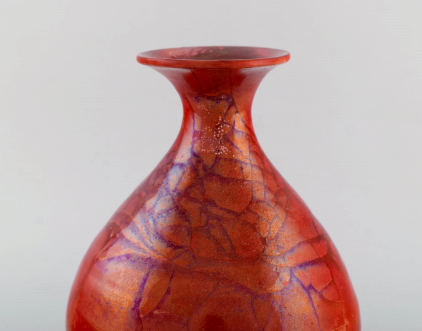 Jens Thirslund for Kähler, HAK. Vase i glaseret stentøj. Smuk rød lustreglasur med strejf af lilla. 1920/30'erne. Måler: 25 x 18 cm. I flot stand. Stemplet.