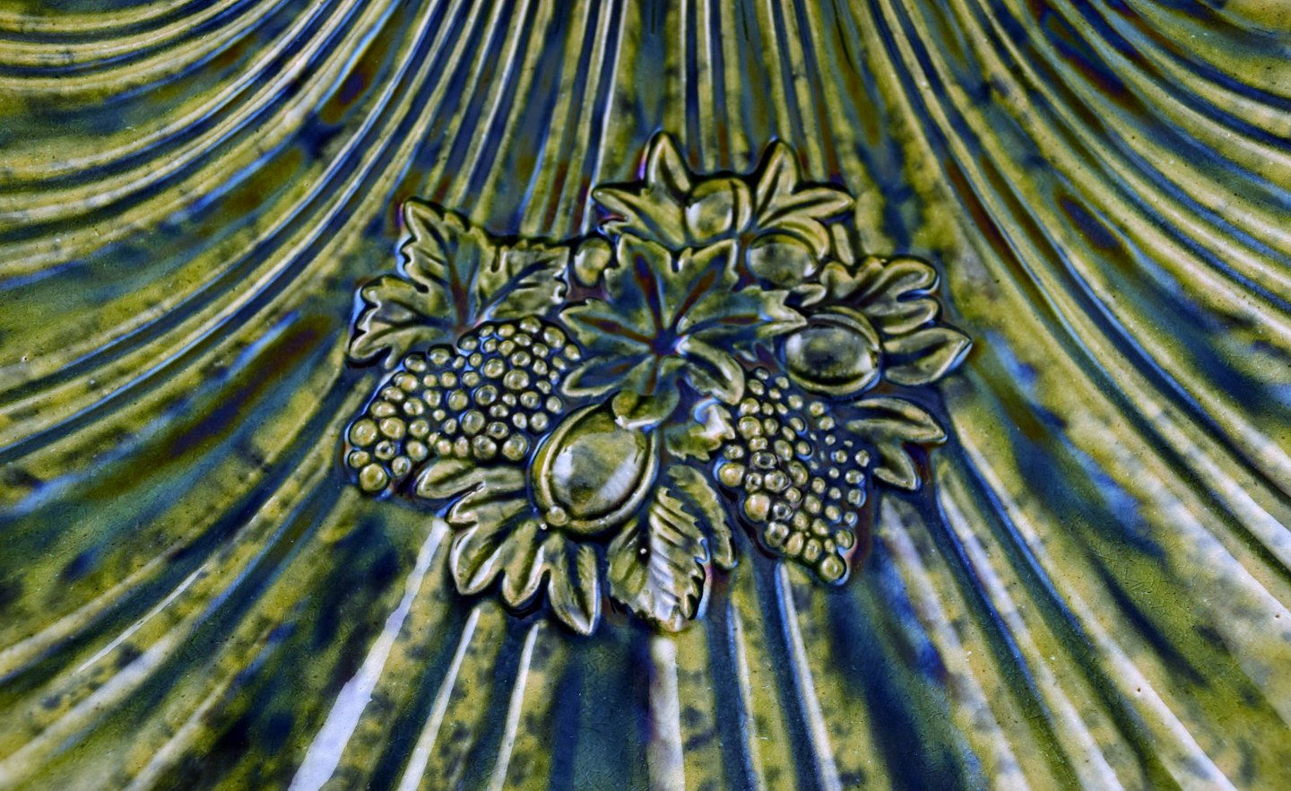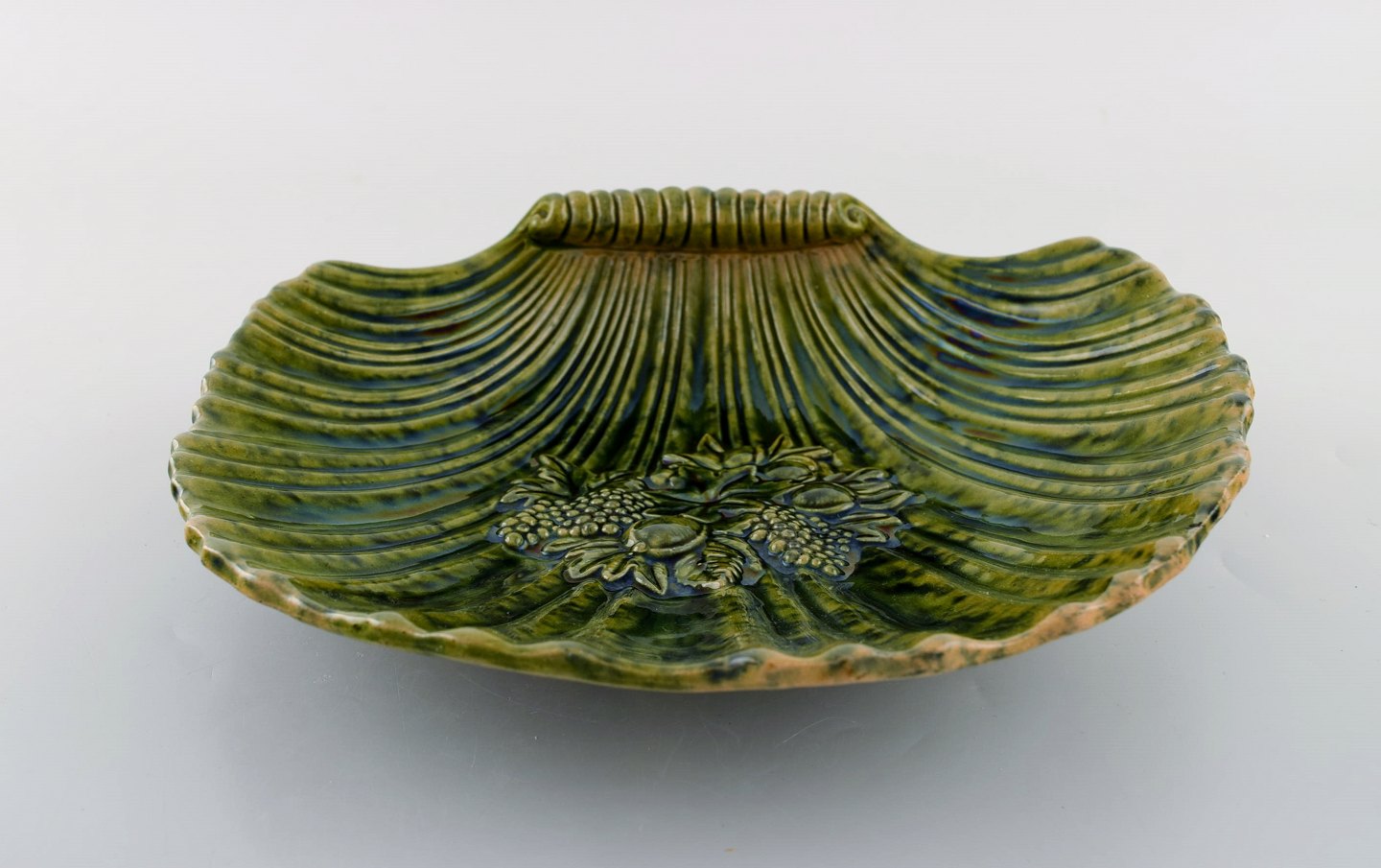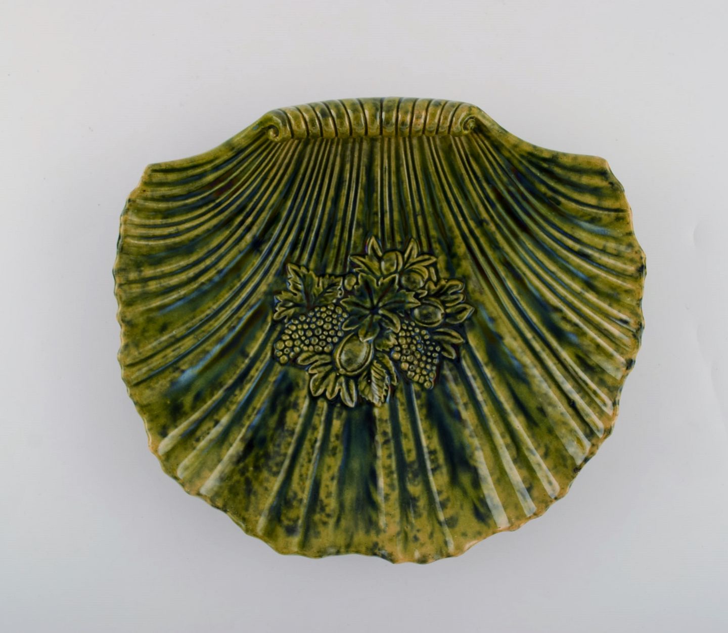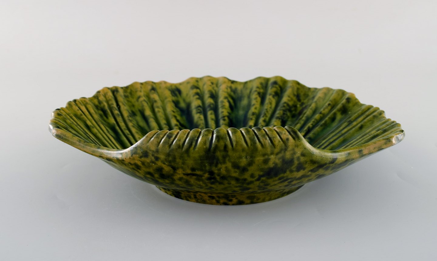 Muslingeformet Höganäs art nouveau fad i glaseret keramik. Smuk efterårsglasur i grønne nuancer. Tidligt 1900-tallet. Måler: 23 x 5,5 cm. I flot stand. Stemplet.