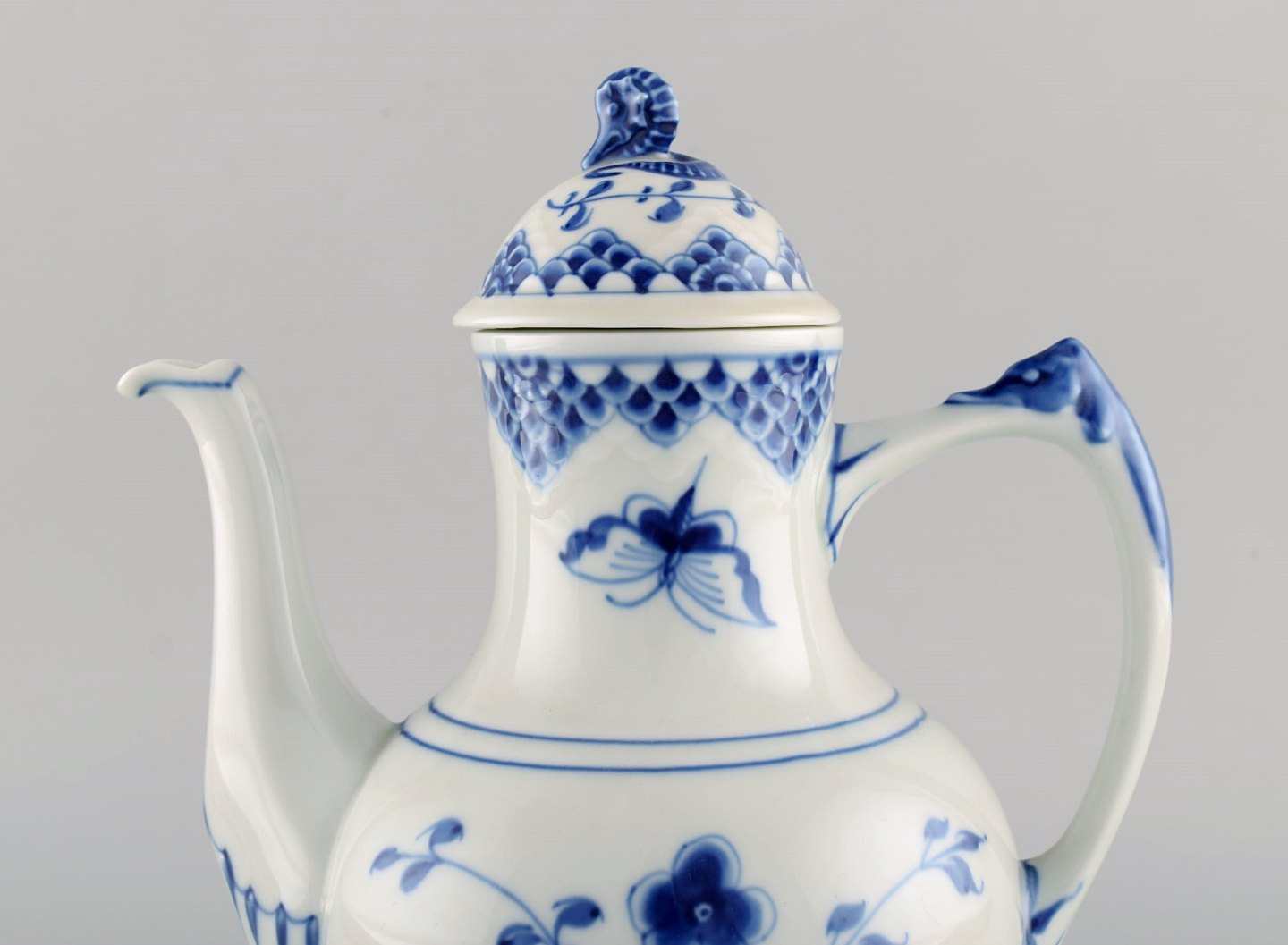 Bing & Grøndahl / B&G, "Sommerfugl". Komplet kaffeservice i håndmalet porcelæn til otte personer med kaffekande, flødekande og tallerkener.