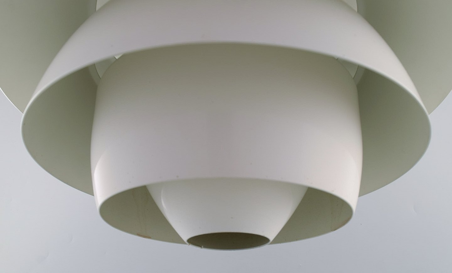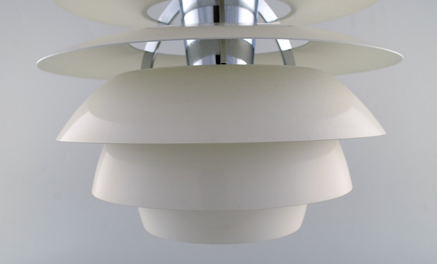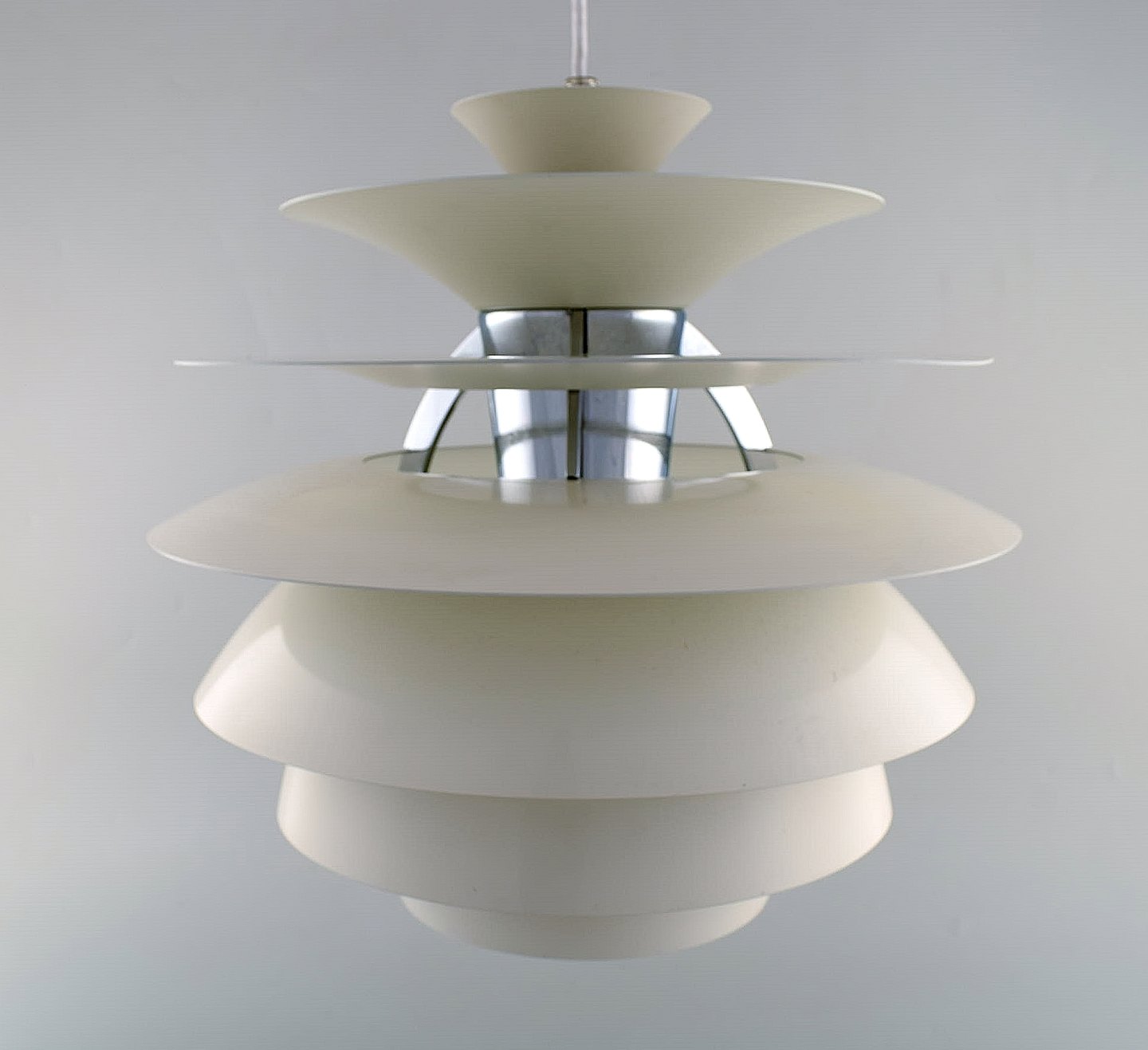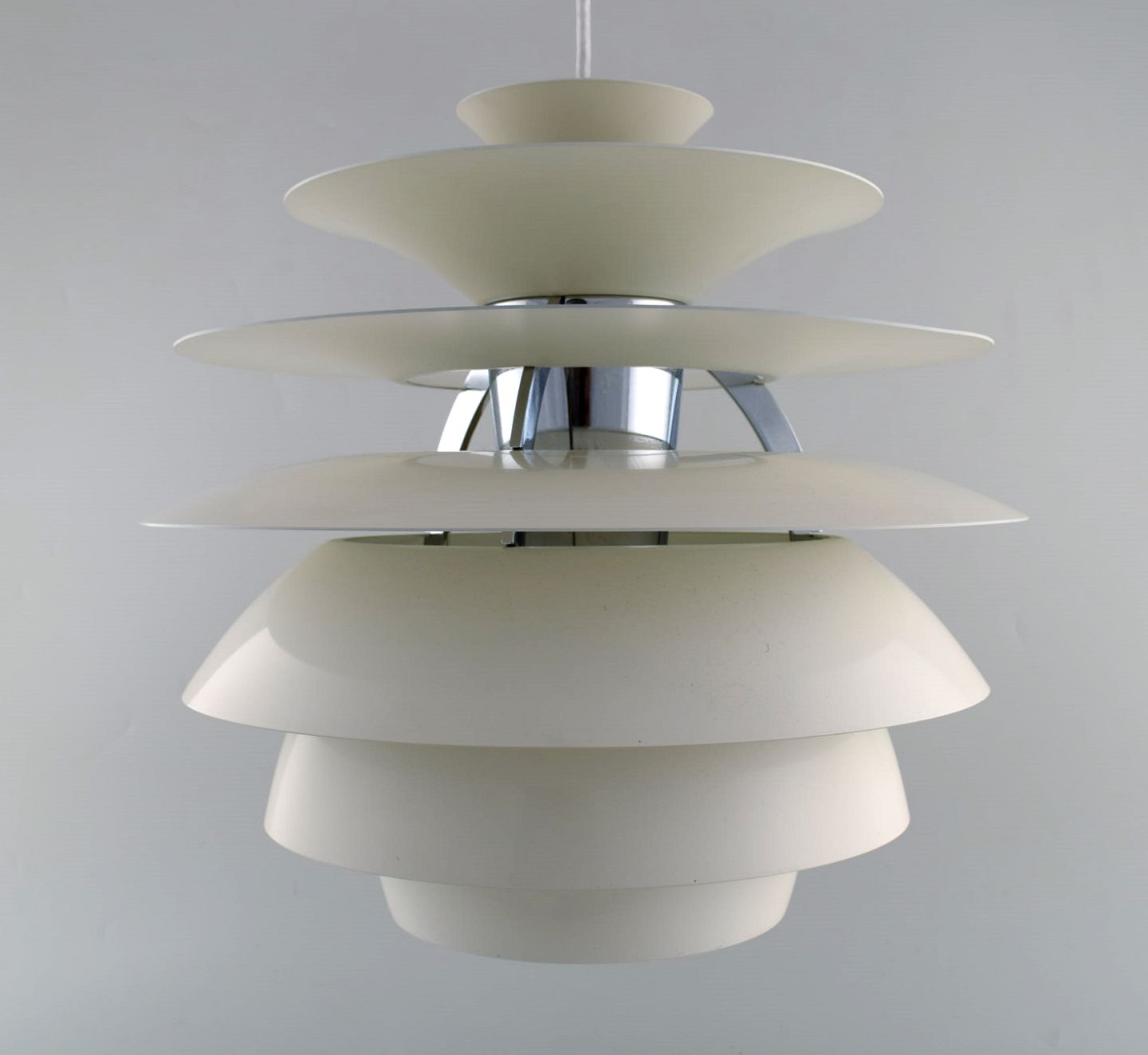 Poul Henningsen for Louis Poulsen. Stor Snowball loftspendel. Stel med otte skærme af hvidlakeret metal. Designet i 1958. Måler: 40 x 39 cm. I flot stand Mærkat. Ltteratur: PH-lampens historie, s. 270-71.