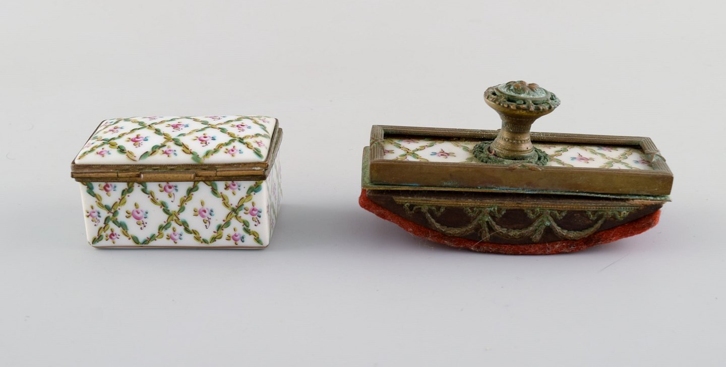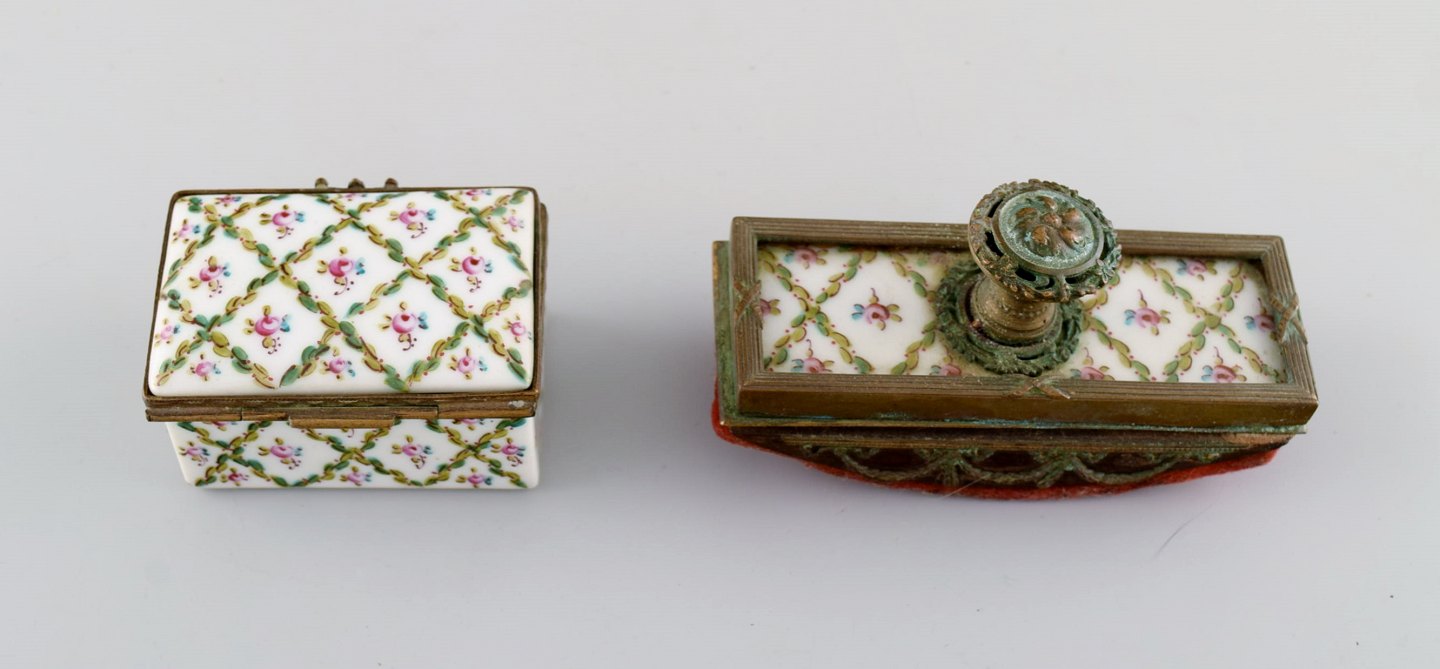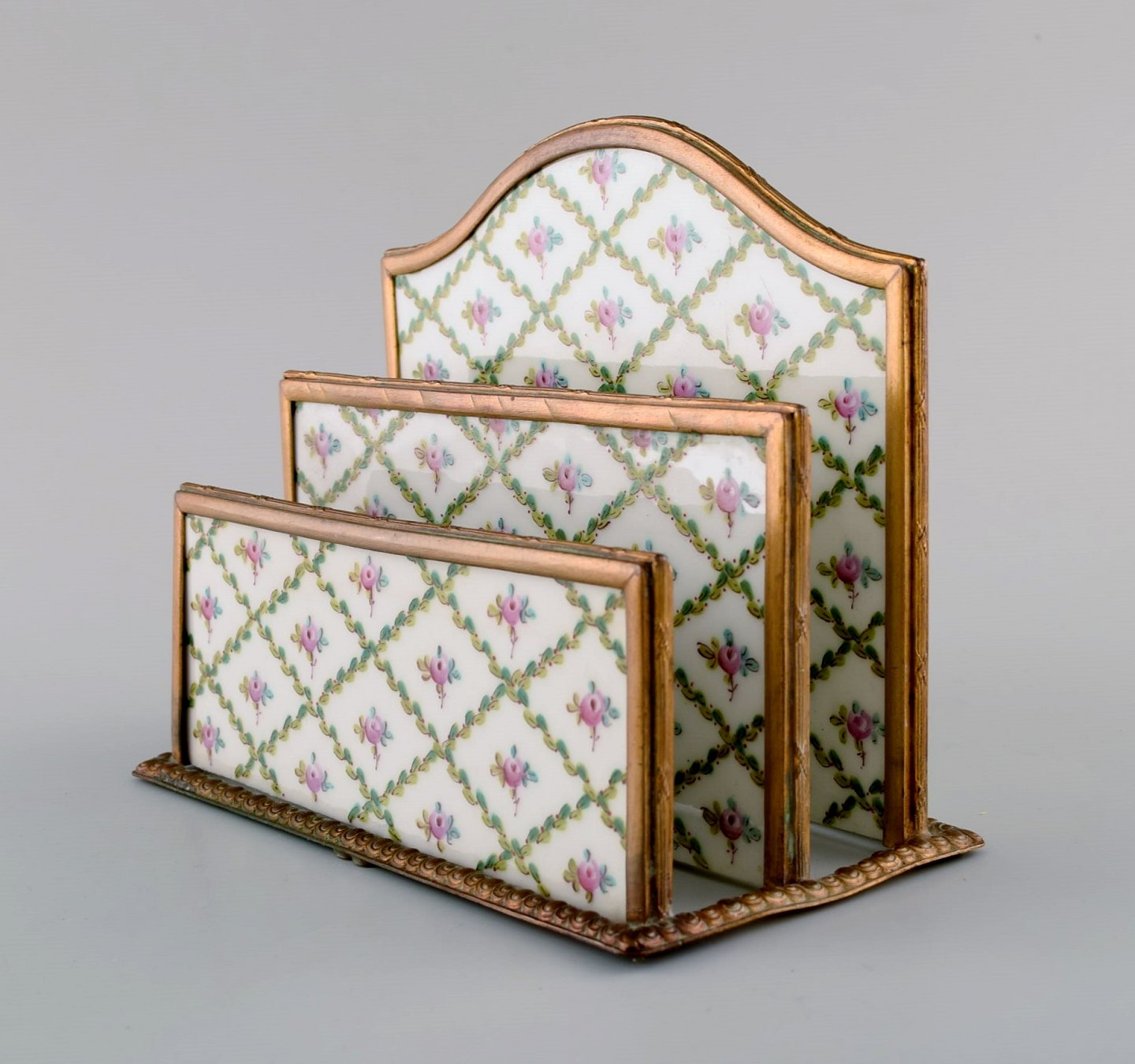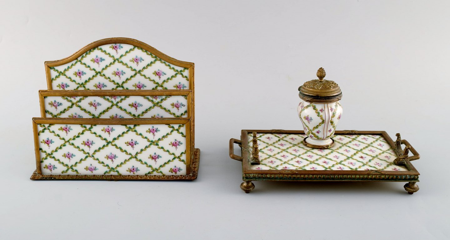 Sevres/Limoges stil. Skrivebordsgarniture i håndmalet porcelæn og messing. Tidligt 1900-tallet. Brevvægt, brevholder, blækhus, blæksuger, pennebakke m.m.