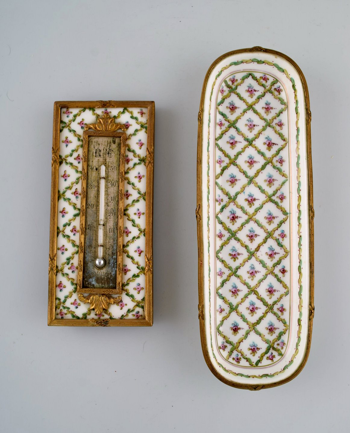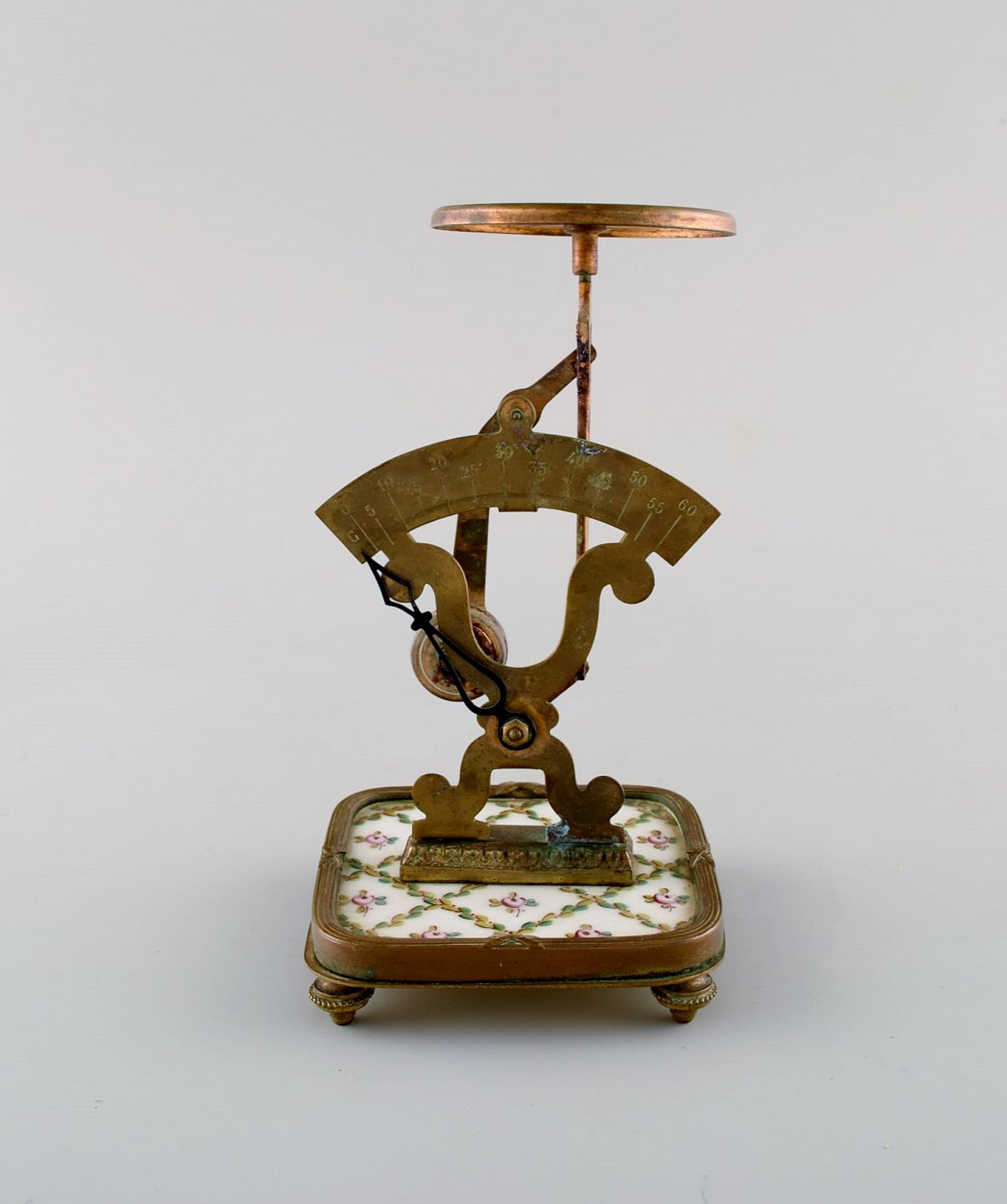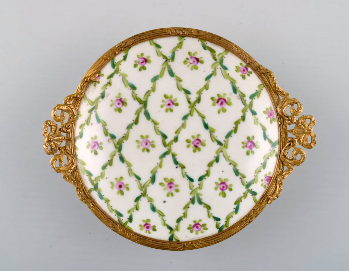 Sevres/Limoges stil. Skrivebordsgarniture i håndmalet porcelæn og messing. Tidligt 1900-tallet. Brevvægt, brevholder, blækhus, blæksuger, pennebakke m.m.