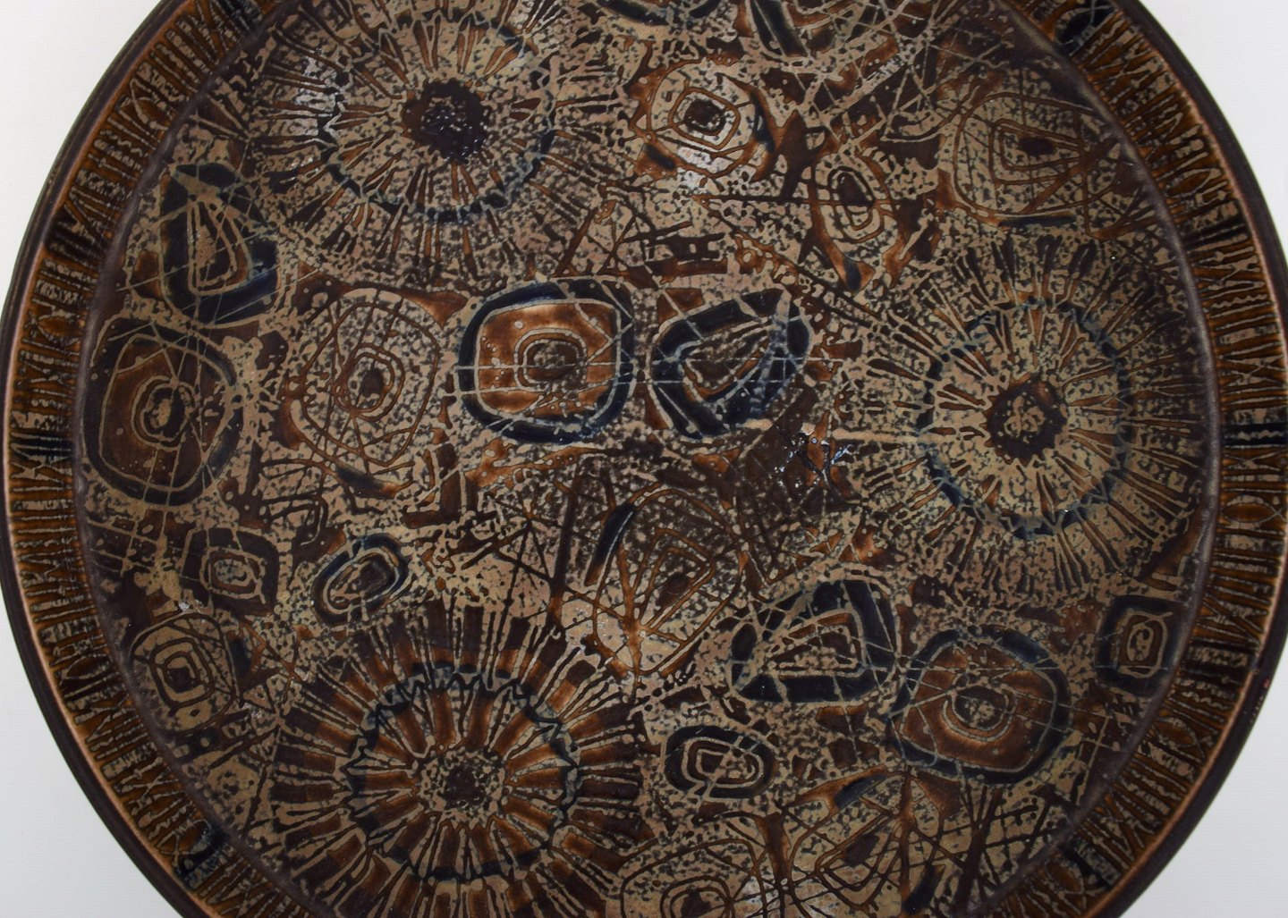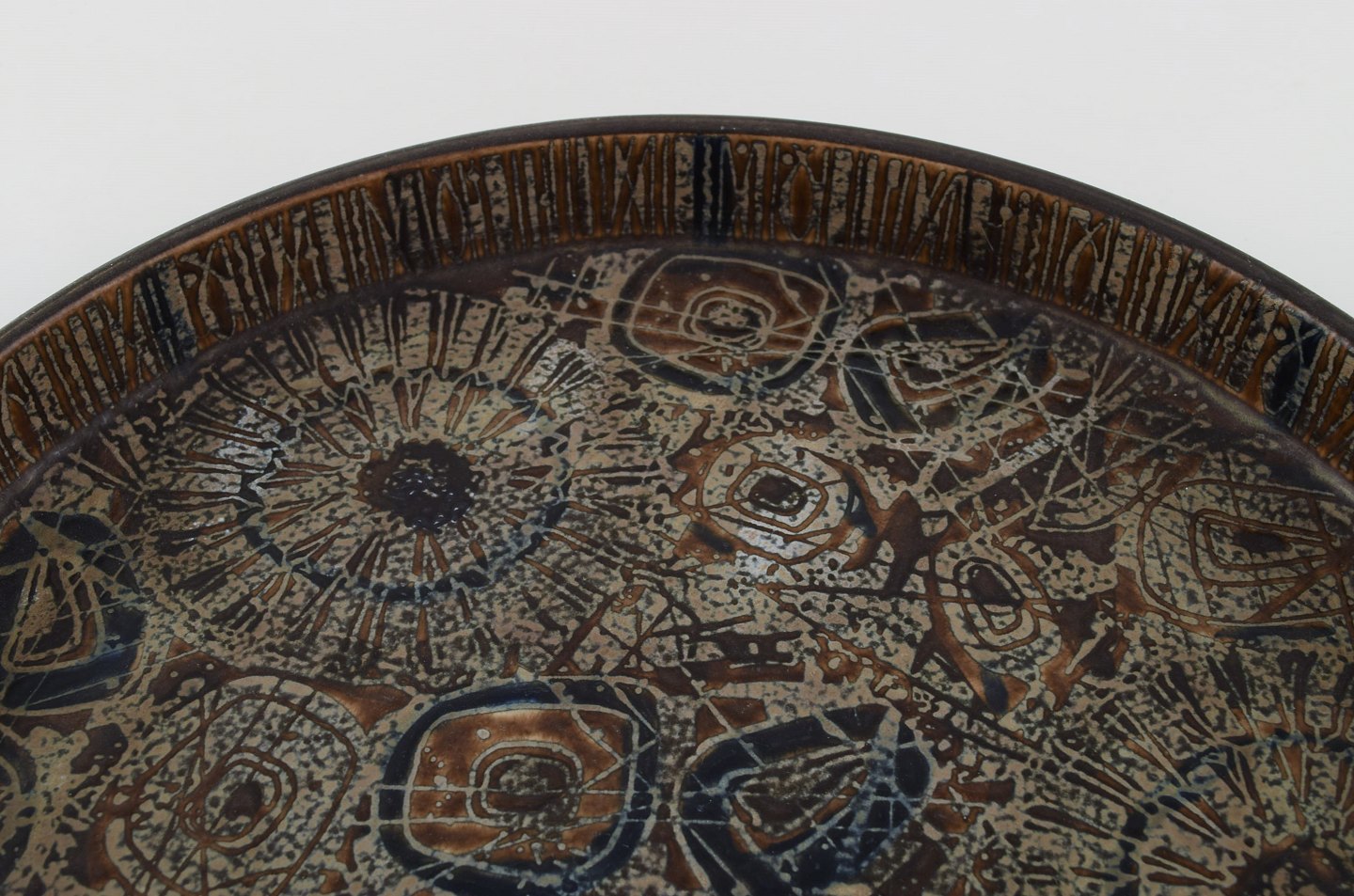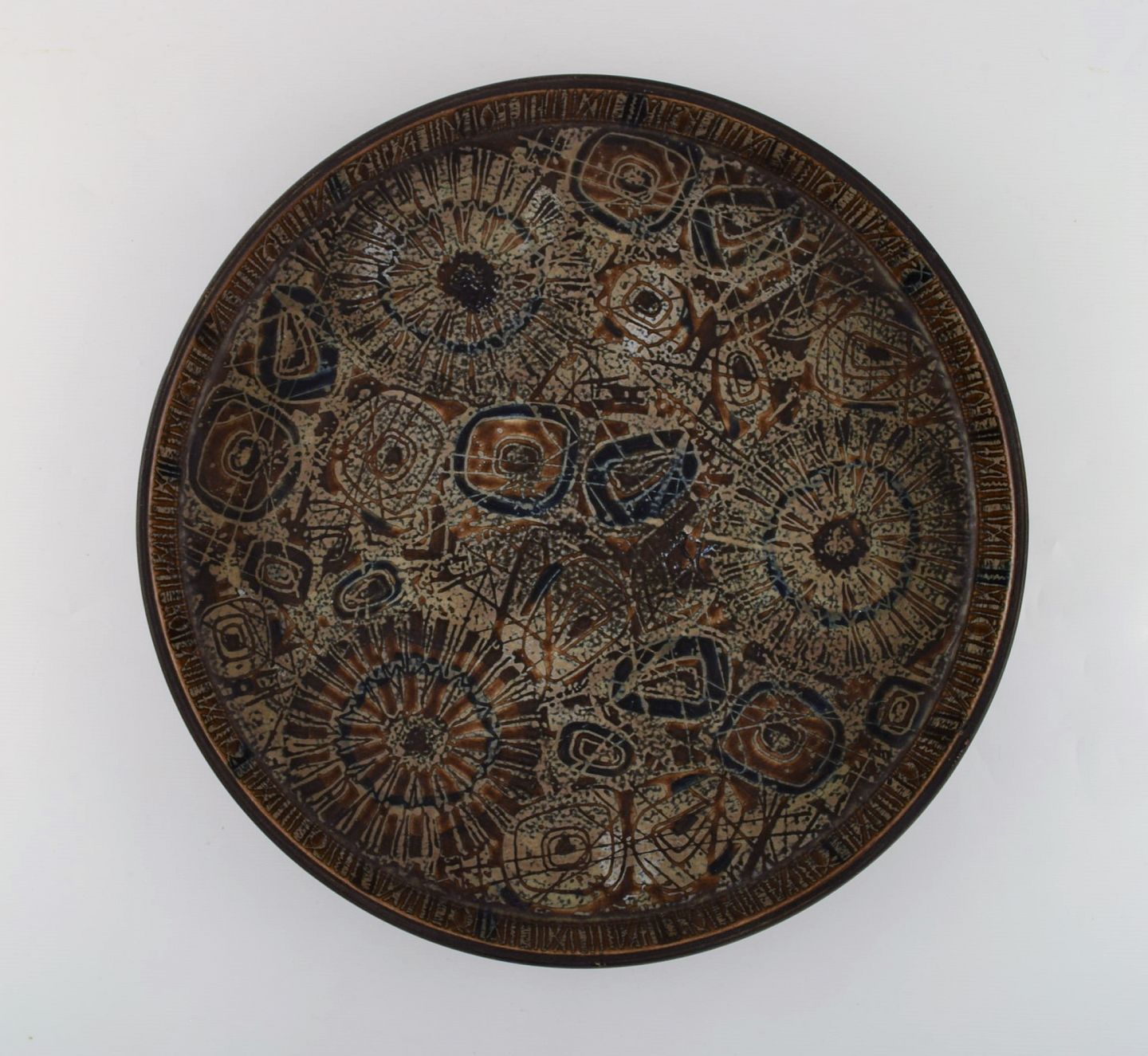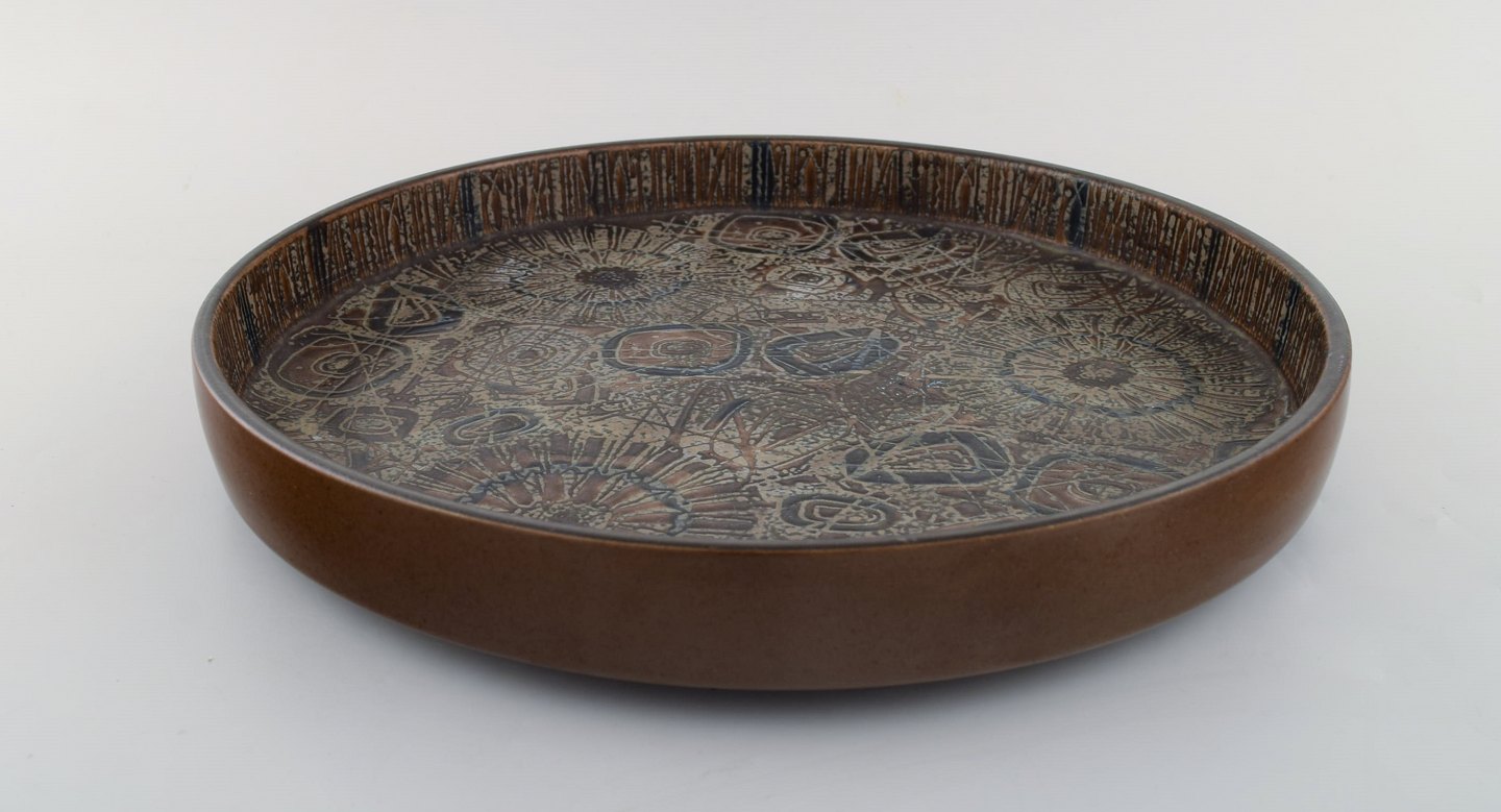 Nils Thorsson for Royal Copenhagen. Stort rundt fad i glaseret fajance. Dateret 1975-79. Måler: 33 x 4,5 cm. I flot stand. Stemplet.