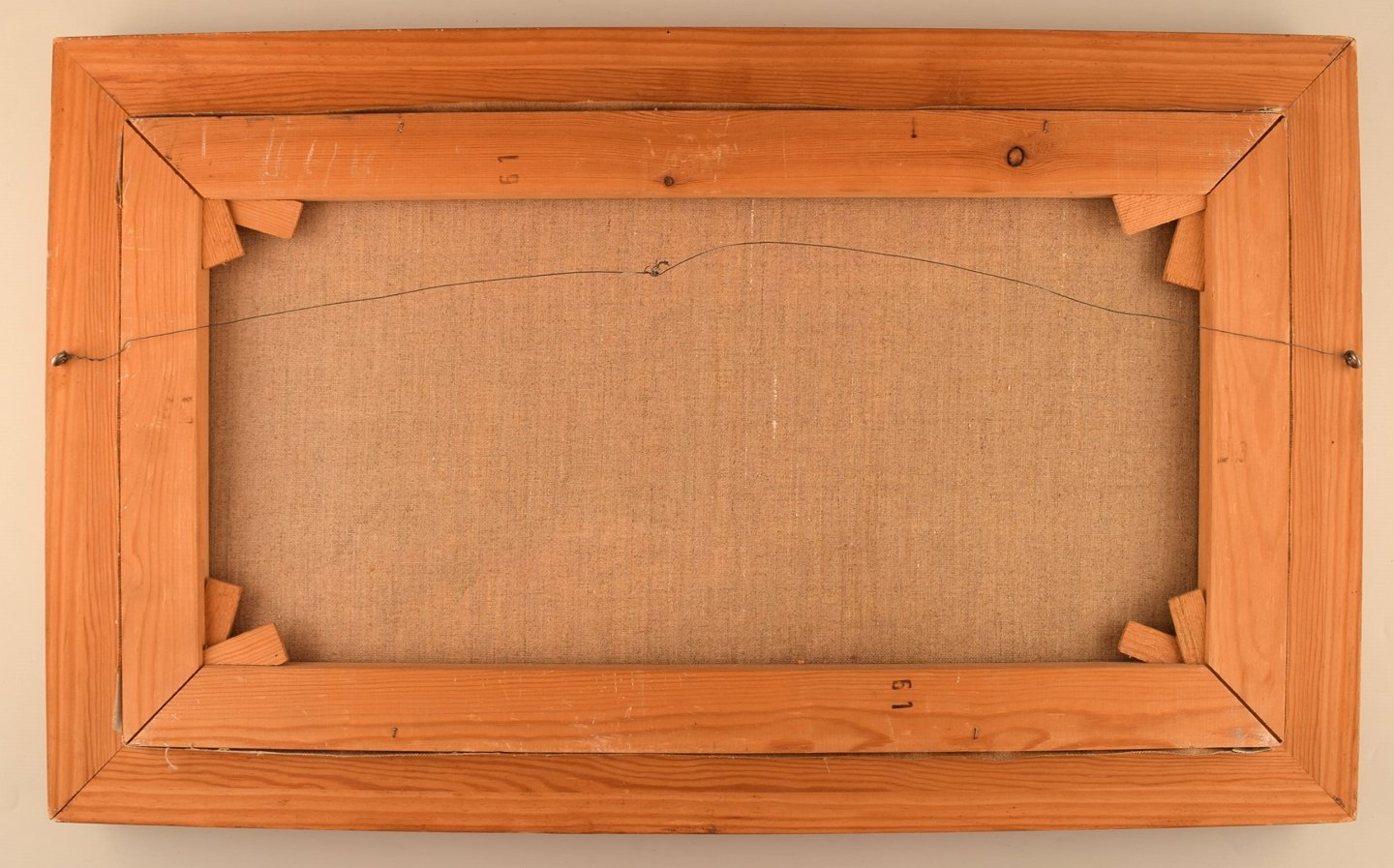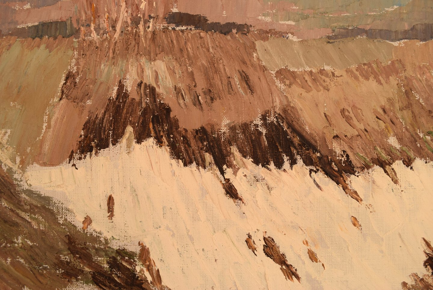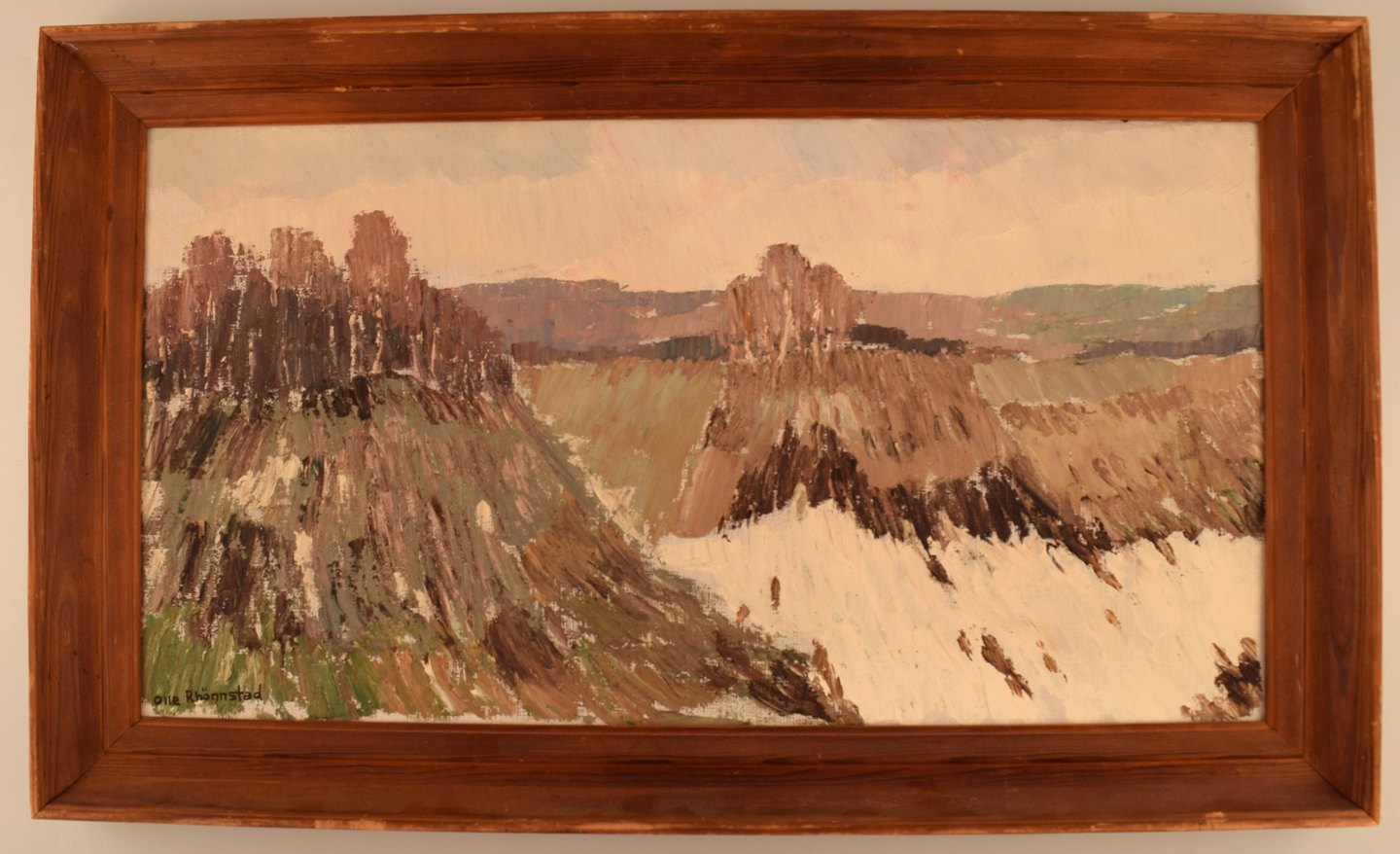 Olle Rhönnstad (1931-1981, svensk kunstner. Olie på lærred. Modernistisk bjerglandskab. 1960'erne. Lærredet måler: 60 x 32 cm. Rammen måler: 5,5 cm. Signeret. I flot stand.