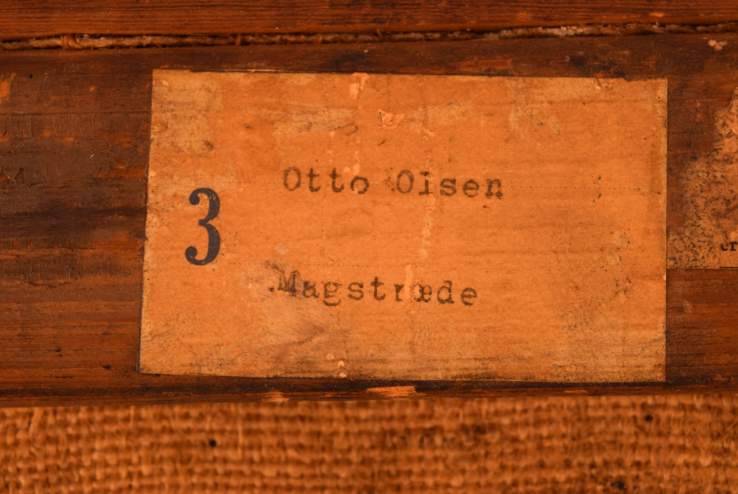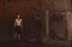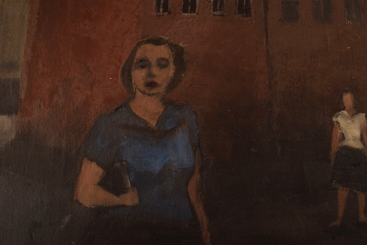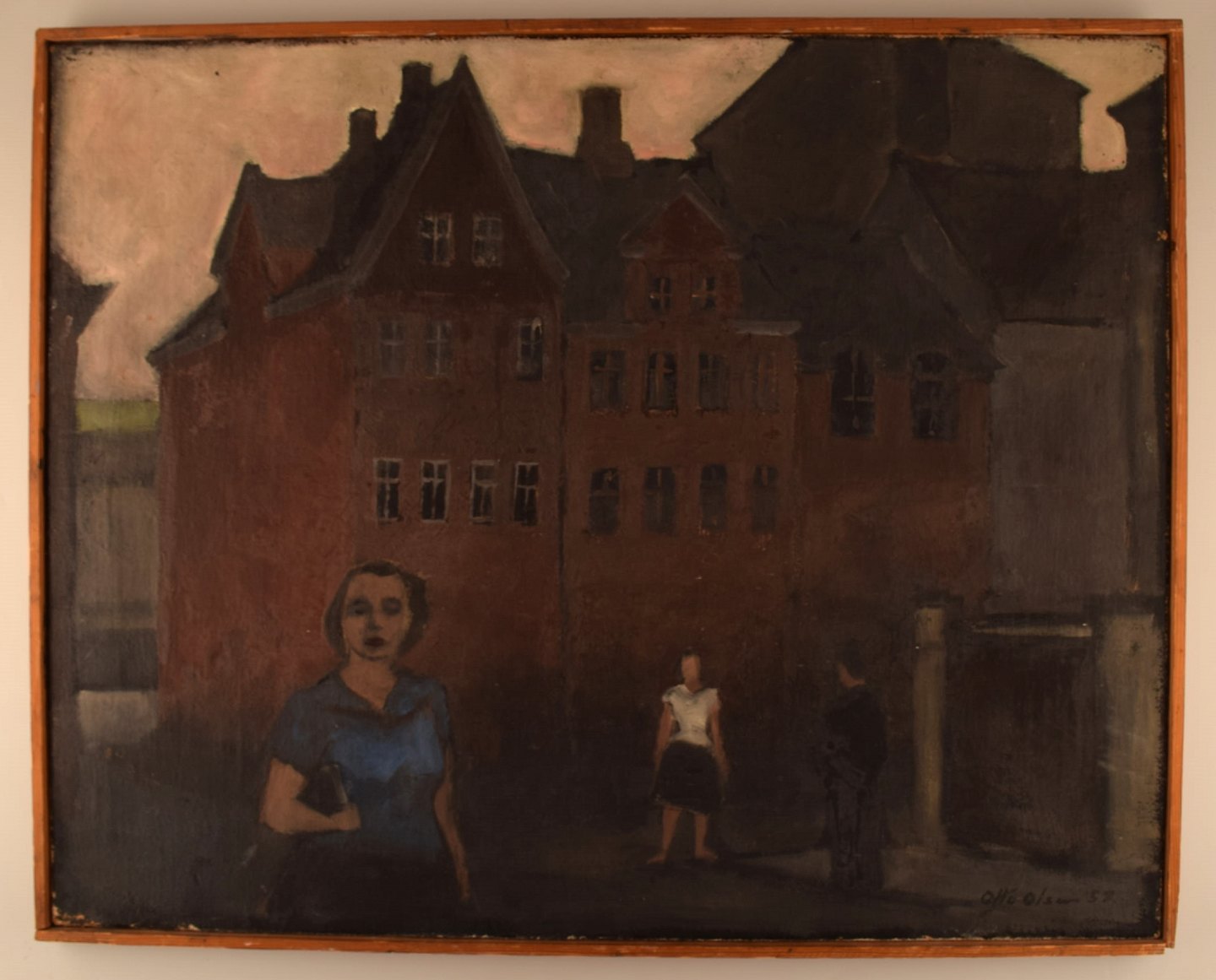 Otto Olsen (1905-1966), Danish painter. Oil on canvas. Modernist urban motif from Magstræde, Copenhagen with young woman and couple. Dated 1957.