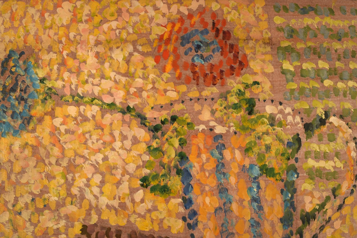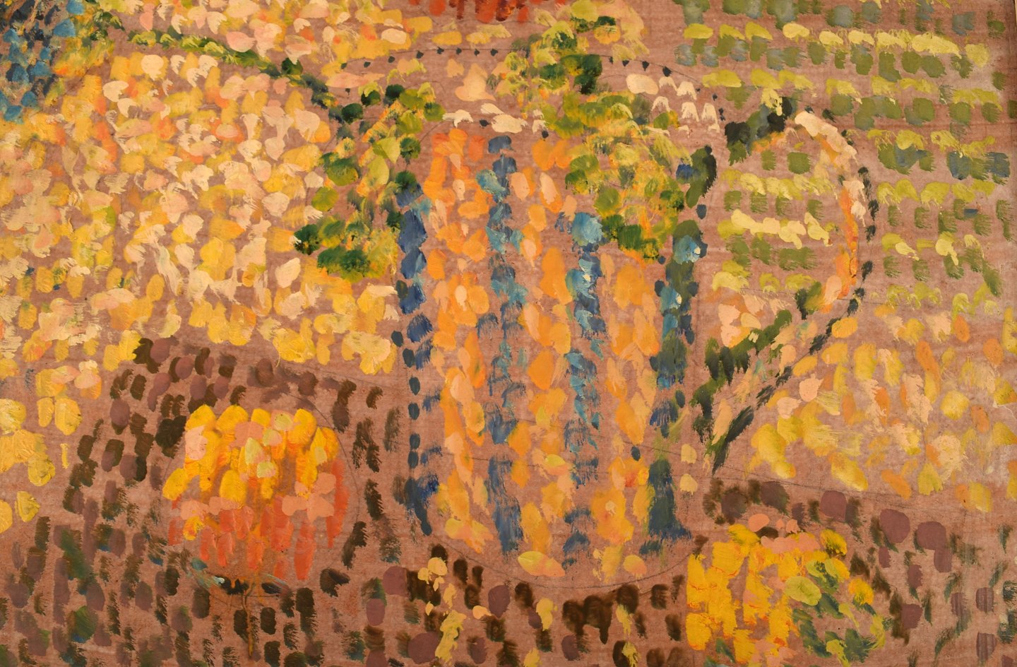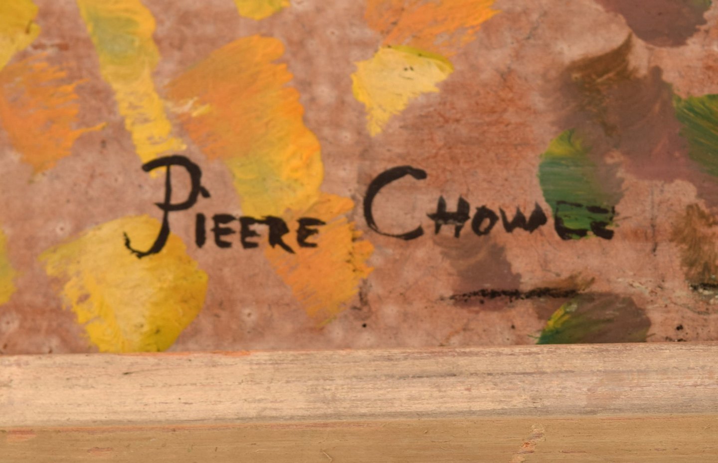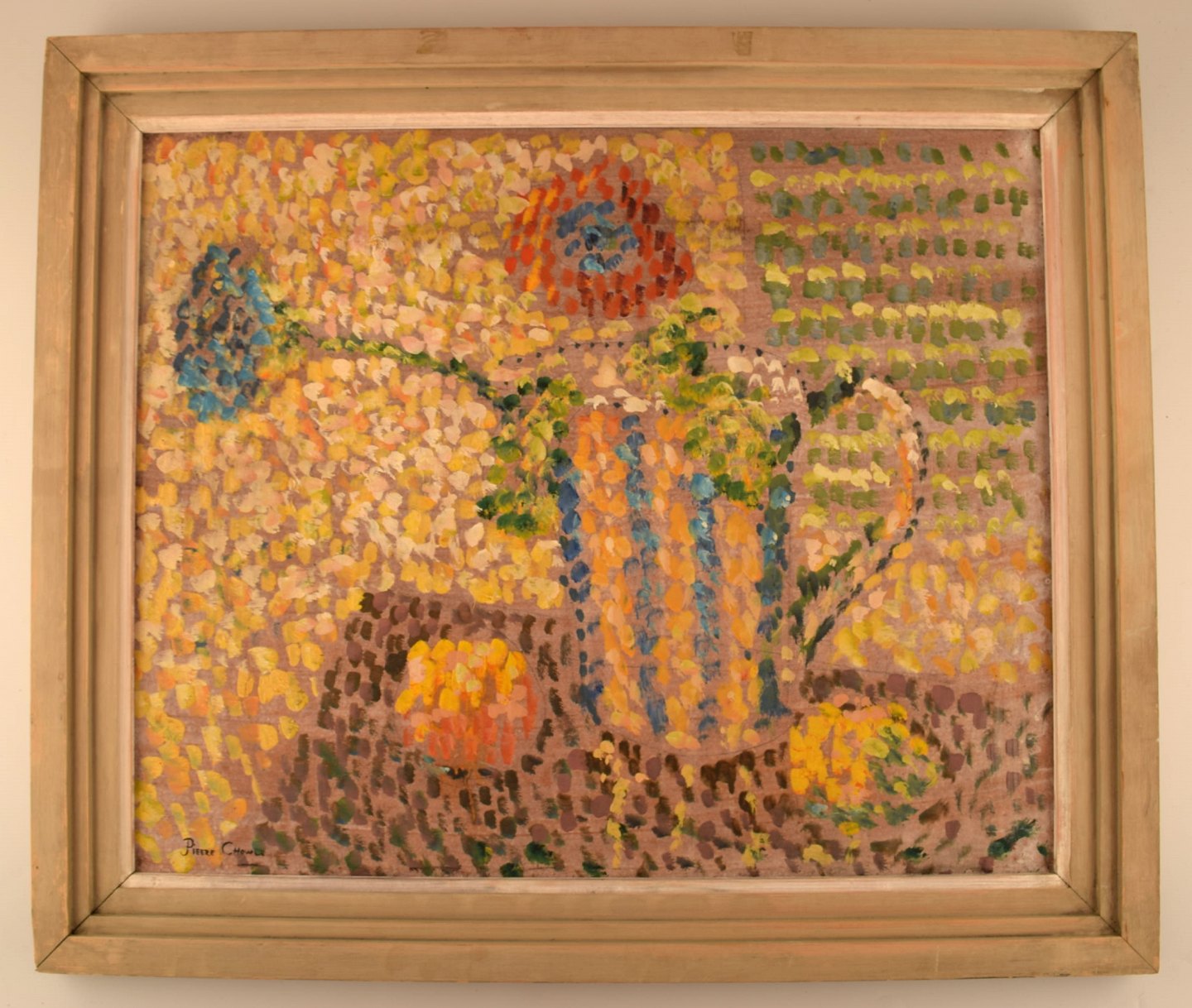 Pierre Chowee. Ubekendt kunstner. Olie på plade. Stilleben med blomster i kande i pointilistisk stil. 1960'erne.