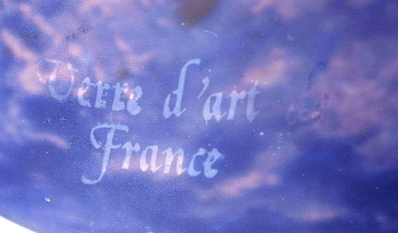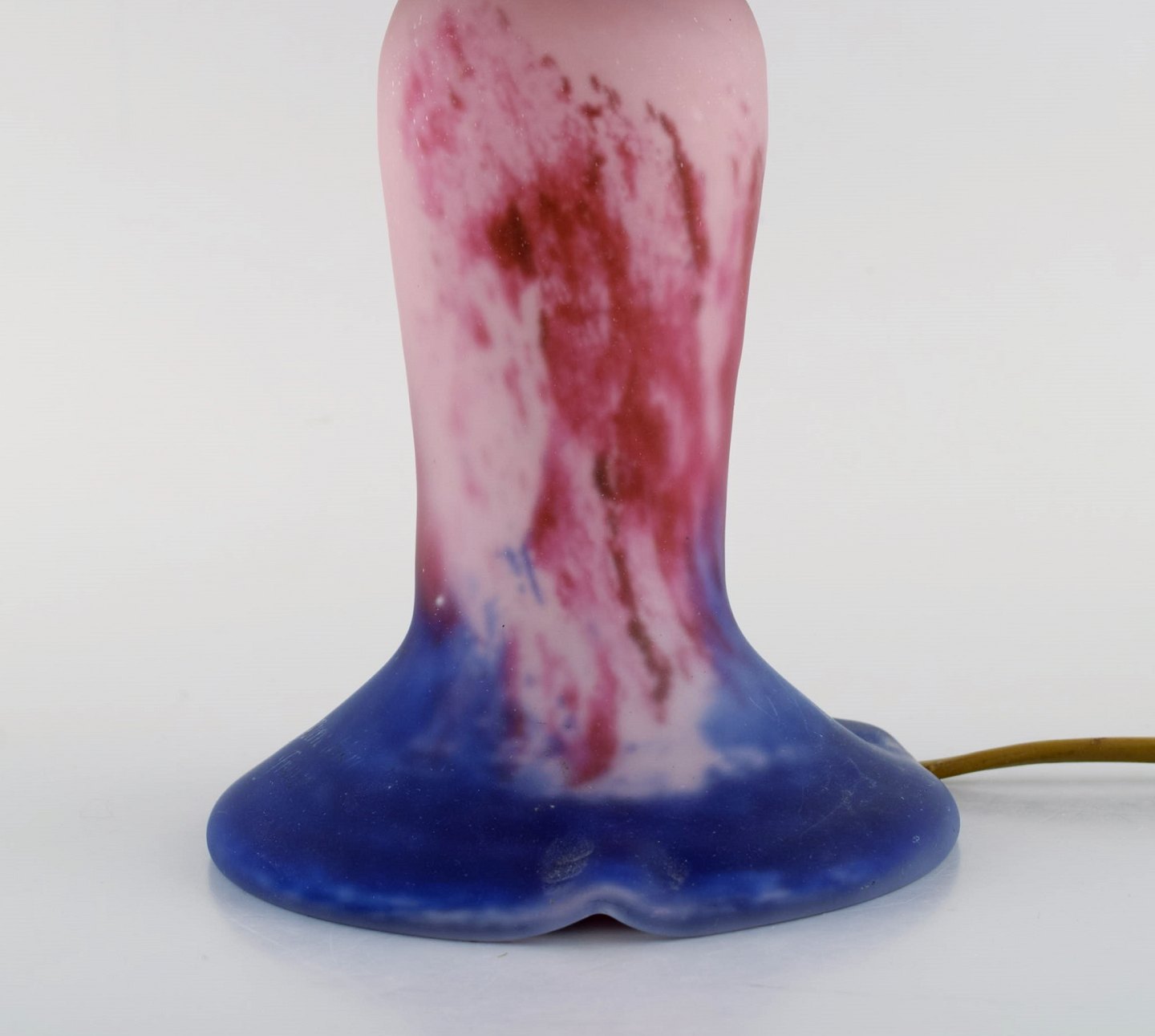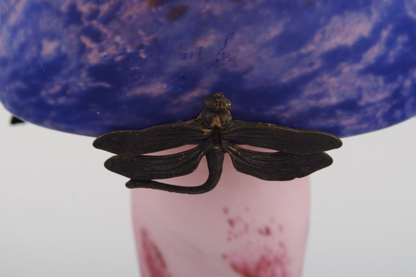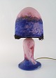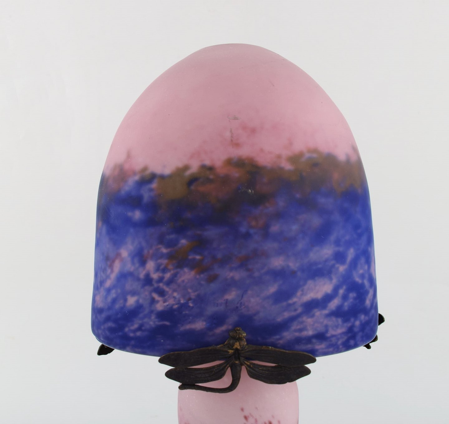 Verre d'art de France. Bordlampe i mundblæst lyserødt og lilla kunstglas med skærmholdere i form af guldsmede. 1920/30'erne.