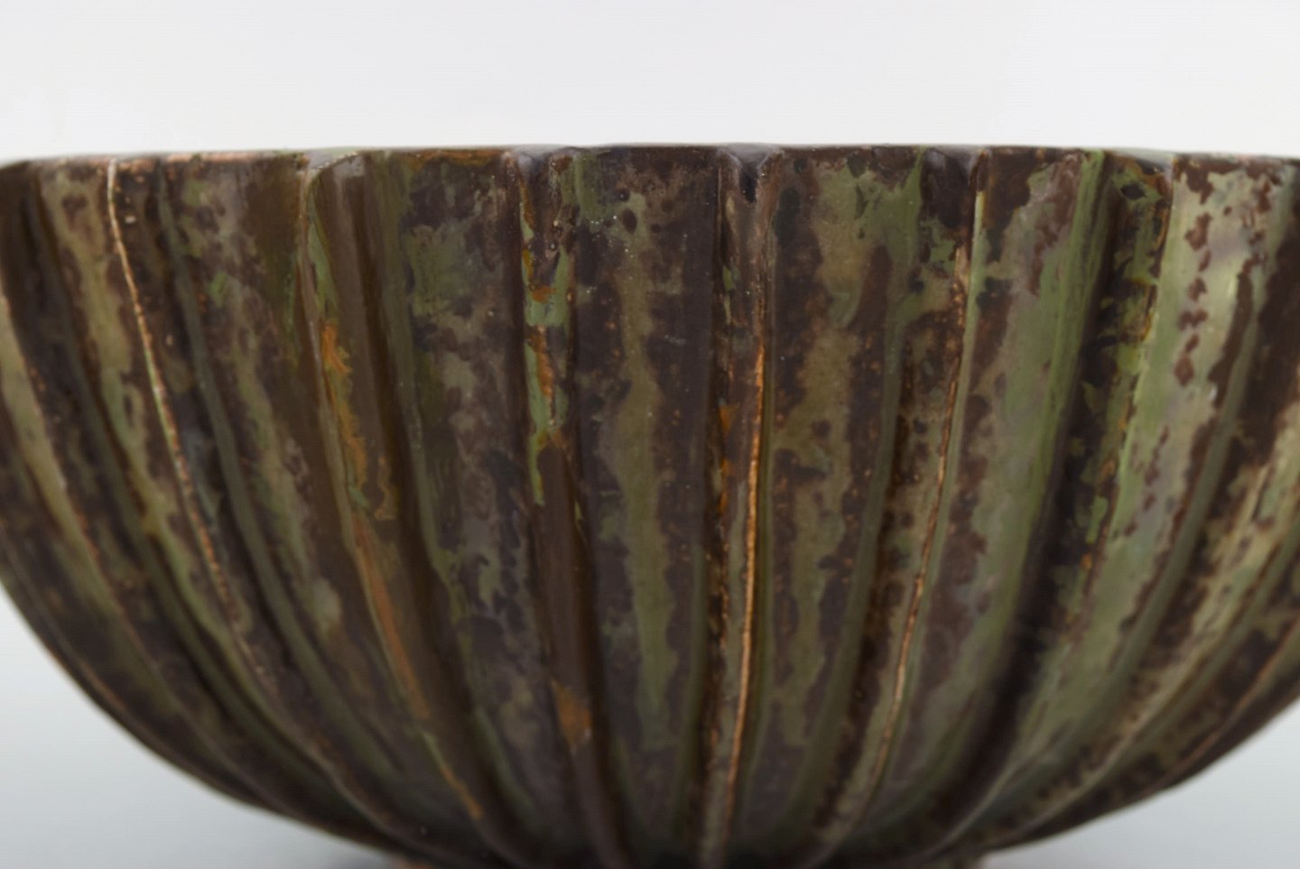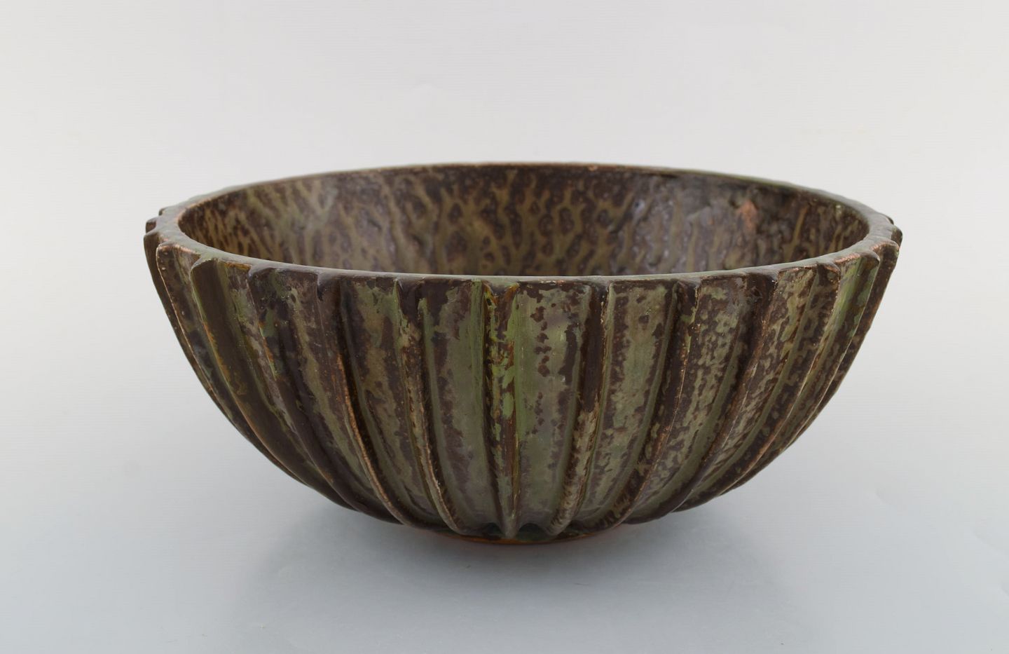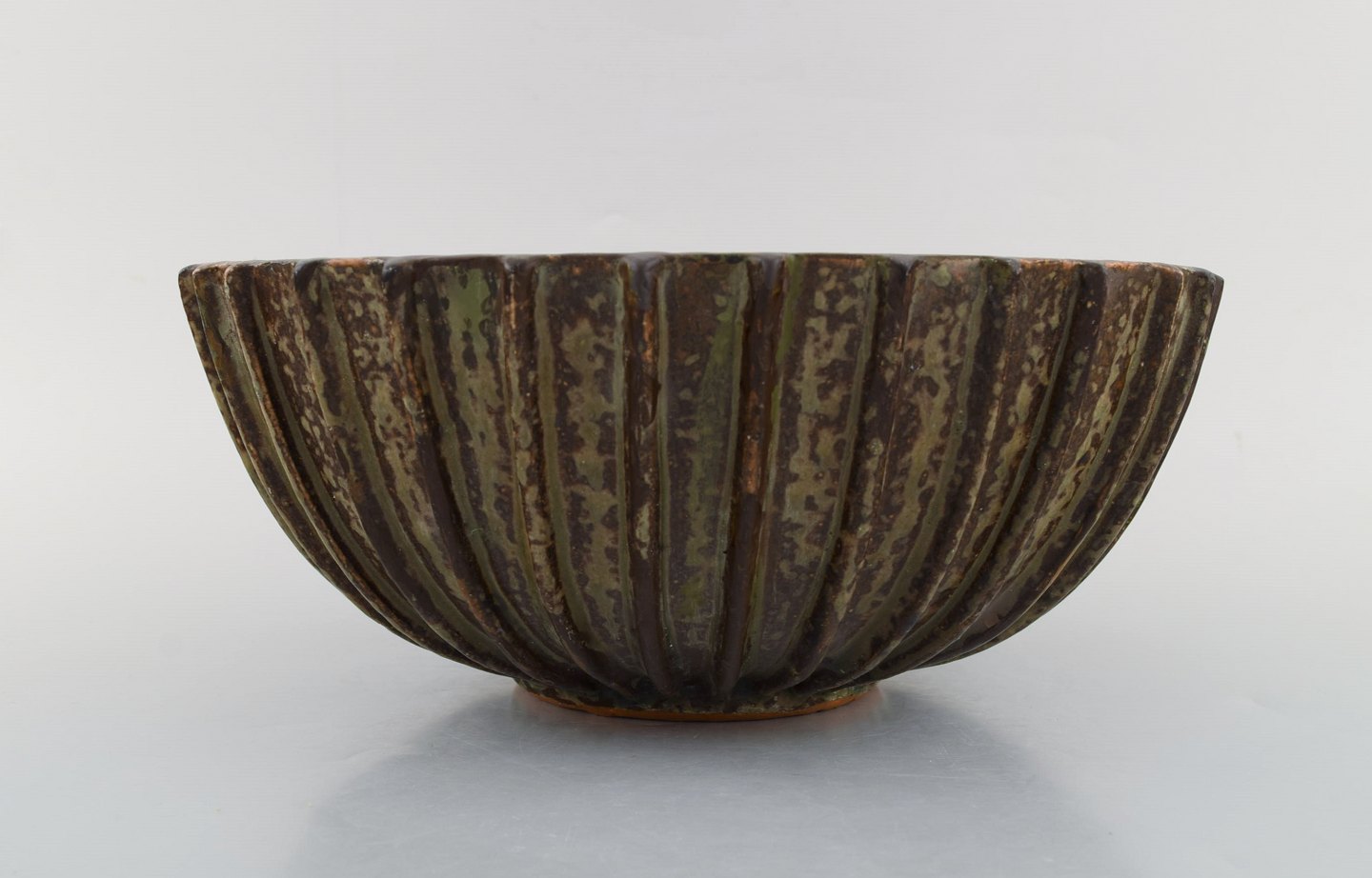 Arne Bang. Stor bordskål af stentøj med kanneleret korpus dekoreret med brun spættet glasur. 1930/40'erne. Signeret i monogram. Nr. 189. Diameter 27 cm. Højde 12 cm. I perfekt stand.