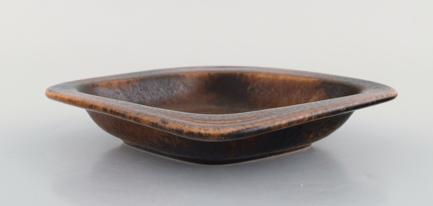 Gunnar Nylund for Rörstrand. Firkantet fad i glaseret stentøj. Smuk glasur i brune nuancer. Sjælden form. 1960'erne.