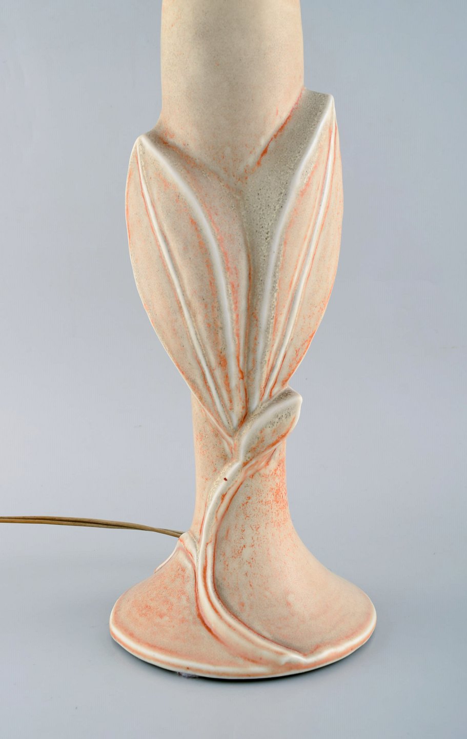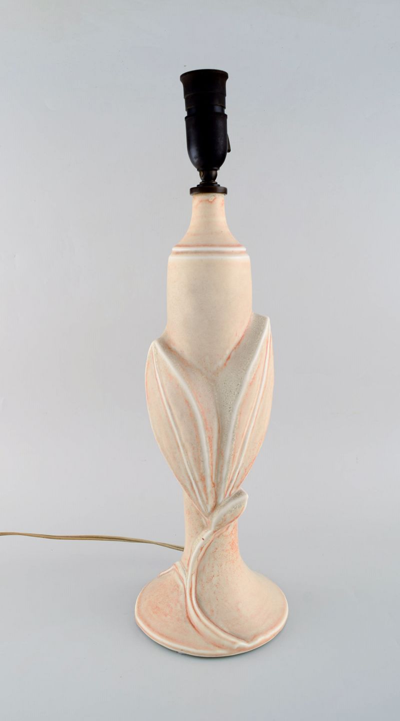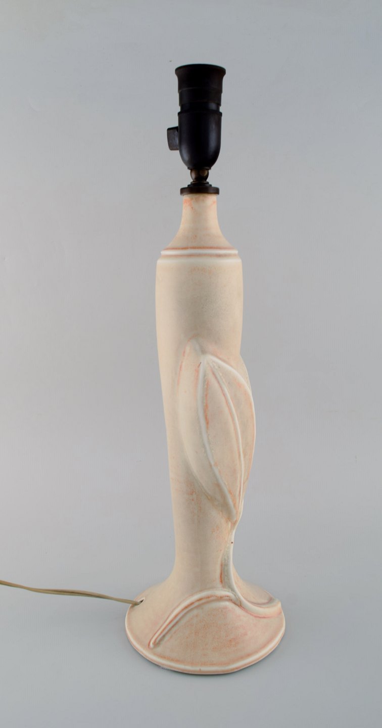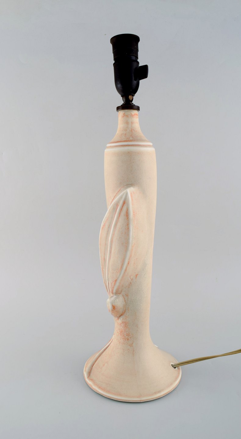 Axel Salto for Royal Copenhagen. Bordlampe af stentøj modelleret med blade og grene i relief. Smuk lys gullig glasur med orange elementer. Formgivet 1944.