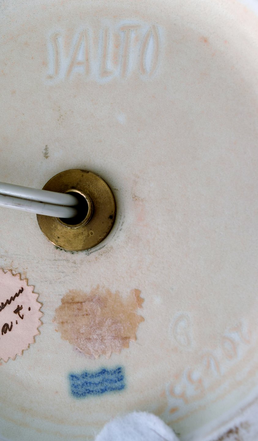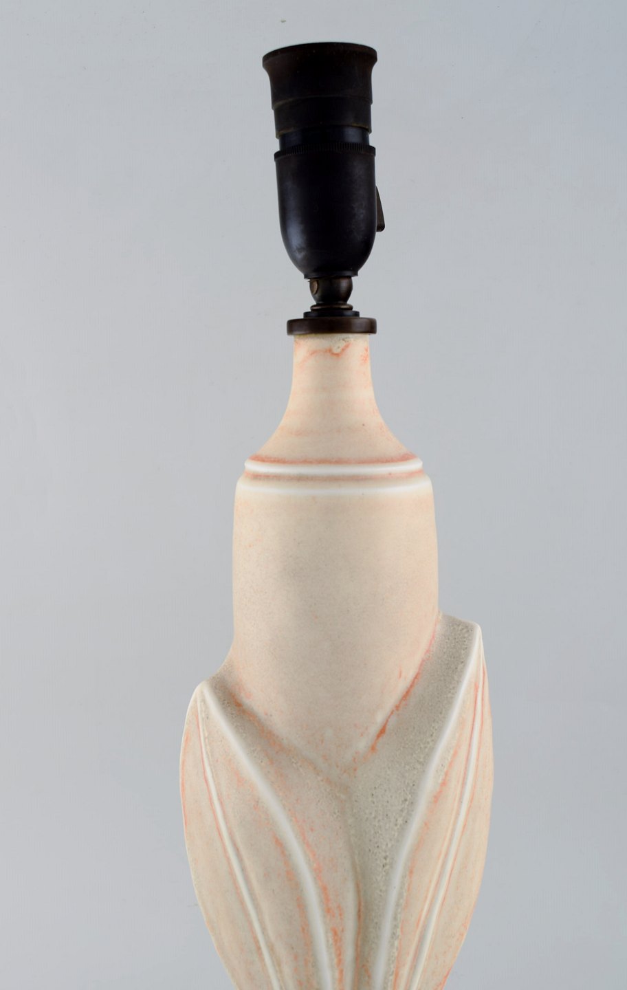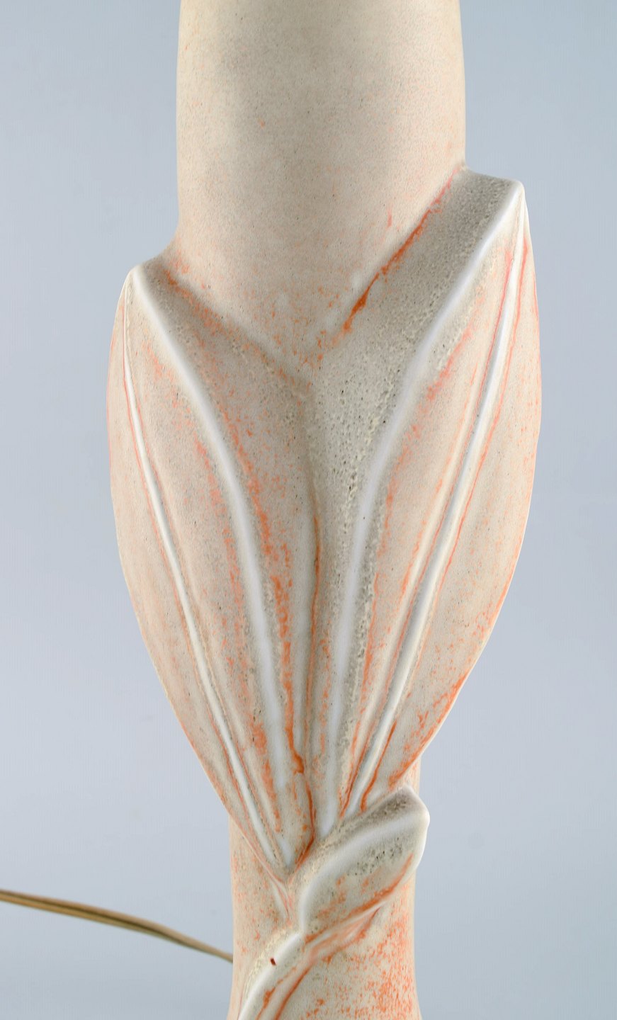 Axel Salto for Royal Copenhagen. Bordlampe af stentøj modelleret med blade og grene i relief. Smuk lys gullig glasur med orange elementer. Formgivet 1944.