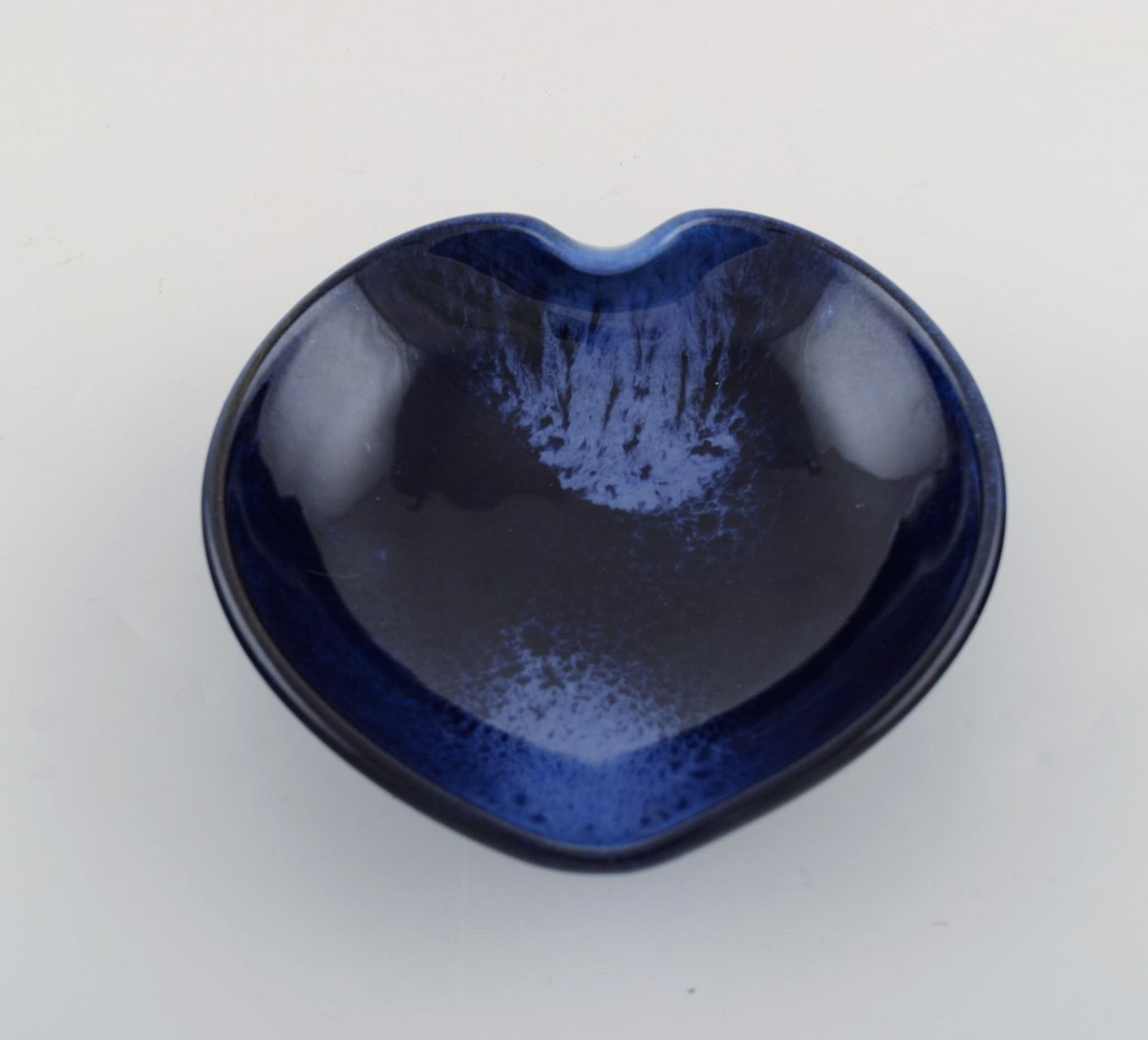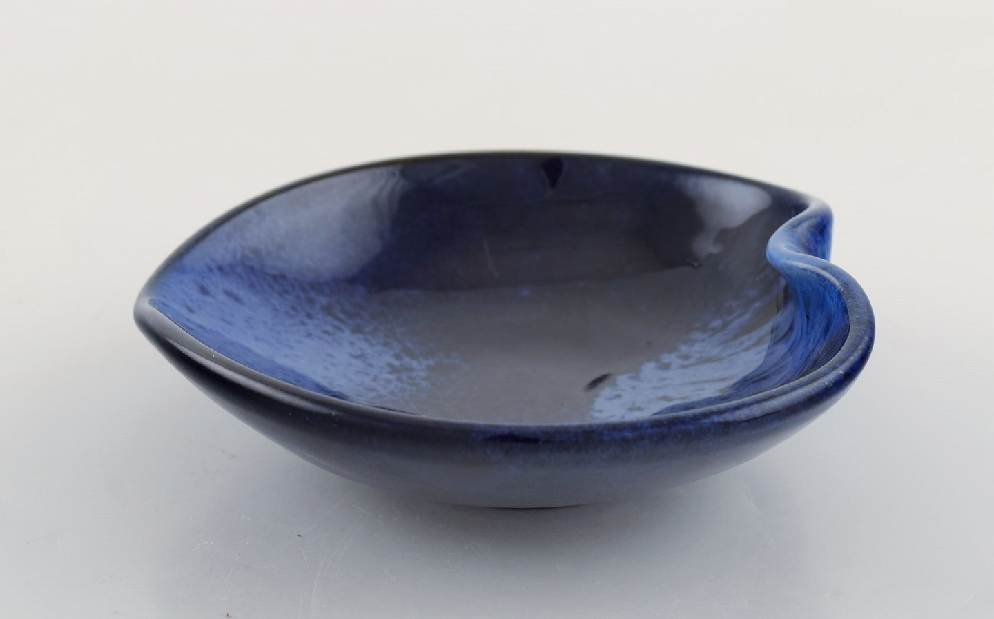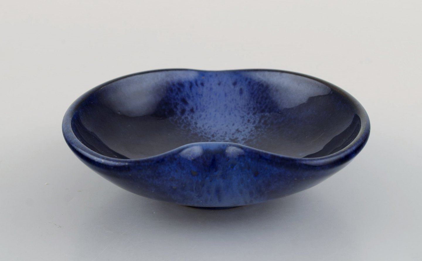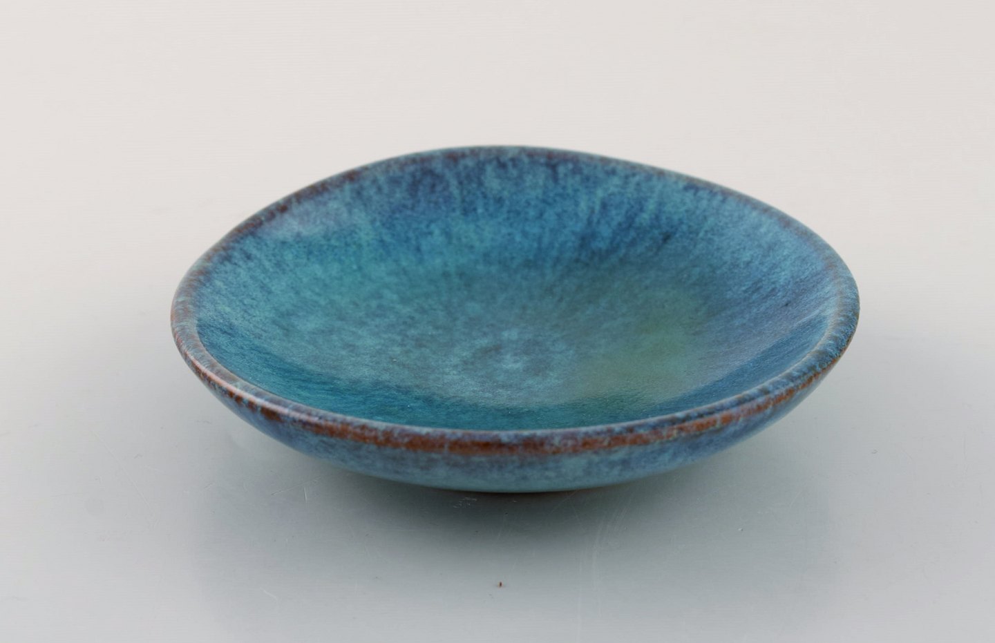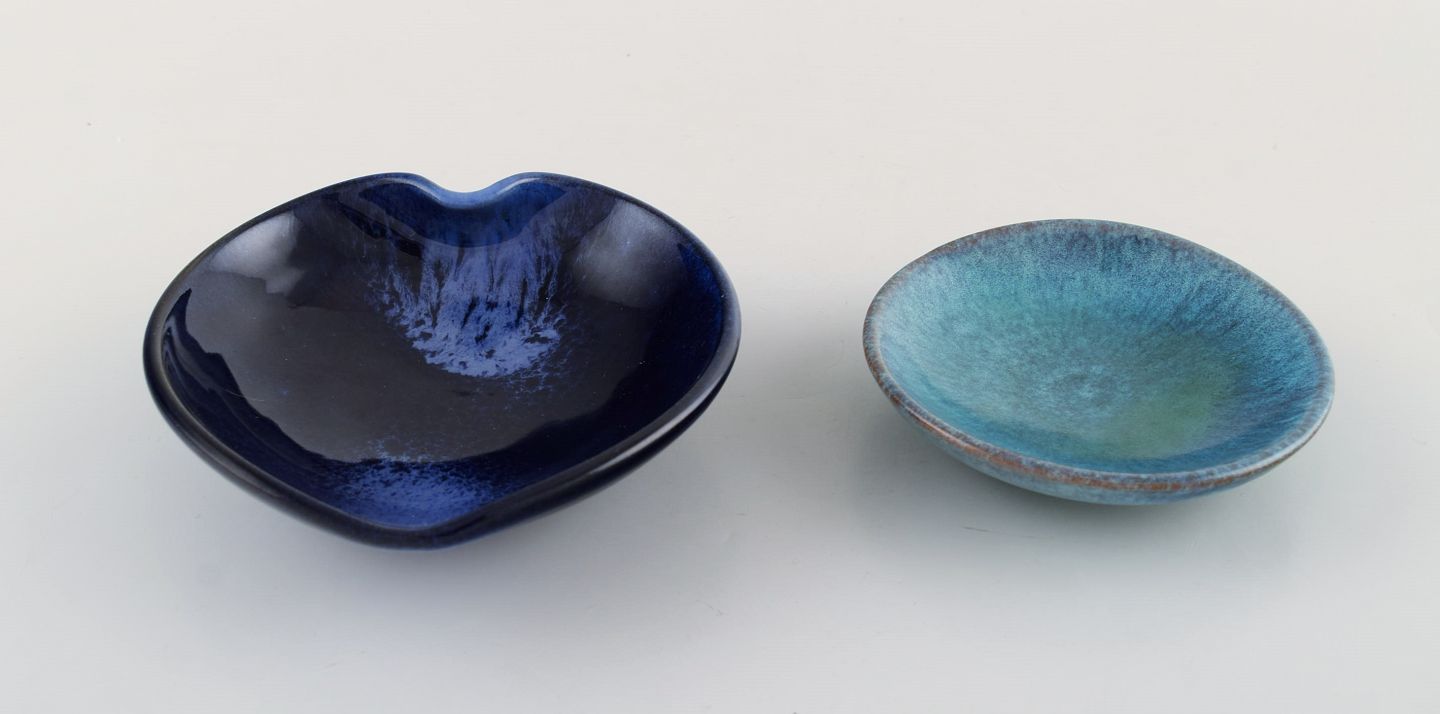 Vicke Lindstrand for Upsala-Ekeby. Two dishes in glazed ceramics. Beautiful glaze in shades of blue. 1950. Largest measures: 12.5 x 4 cm. In very good condition. Stamped.