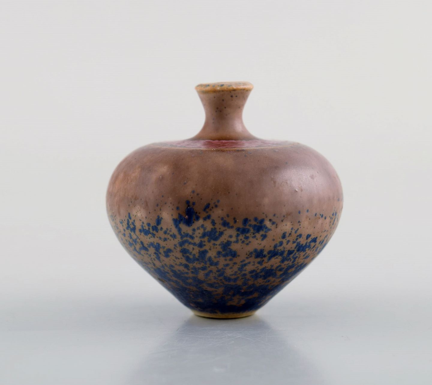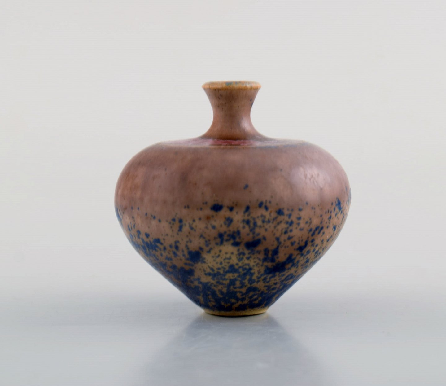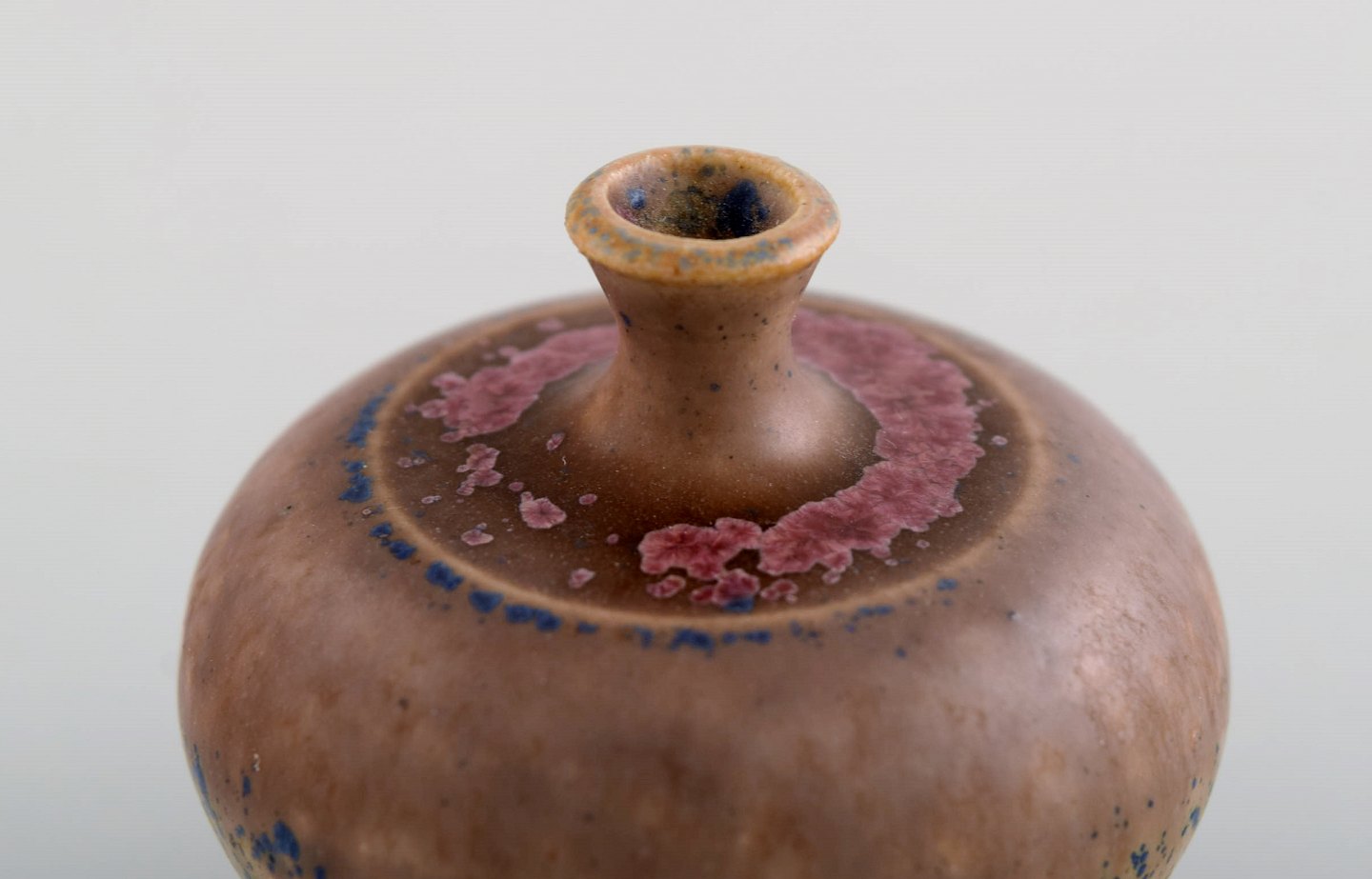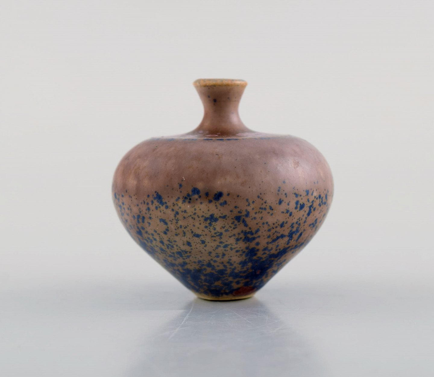 Isak Isaksson, Swedish ceramist. Unique vase in glazed ceramics. Beautiful glaze in brown and blue shades. Dated 1988. Measures: 5 x 4.5 cm. In very good condition. Signed.