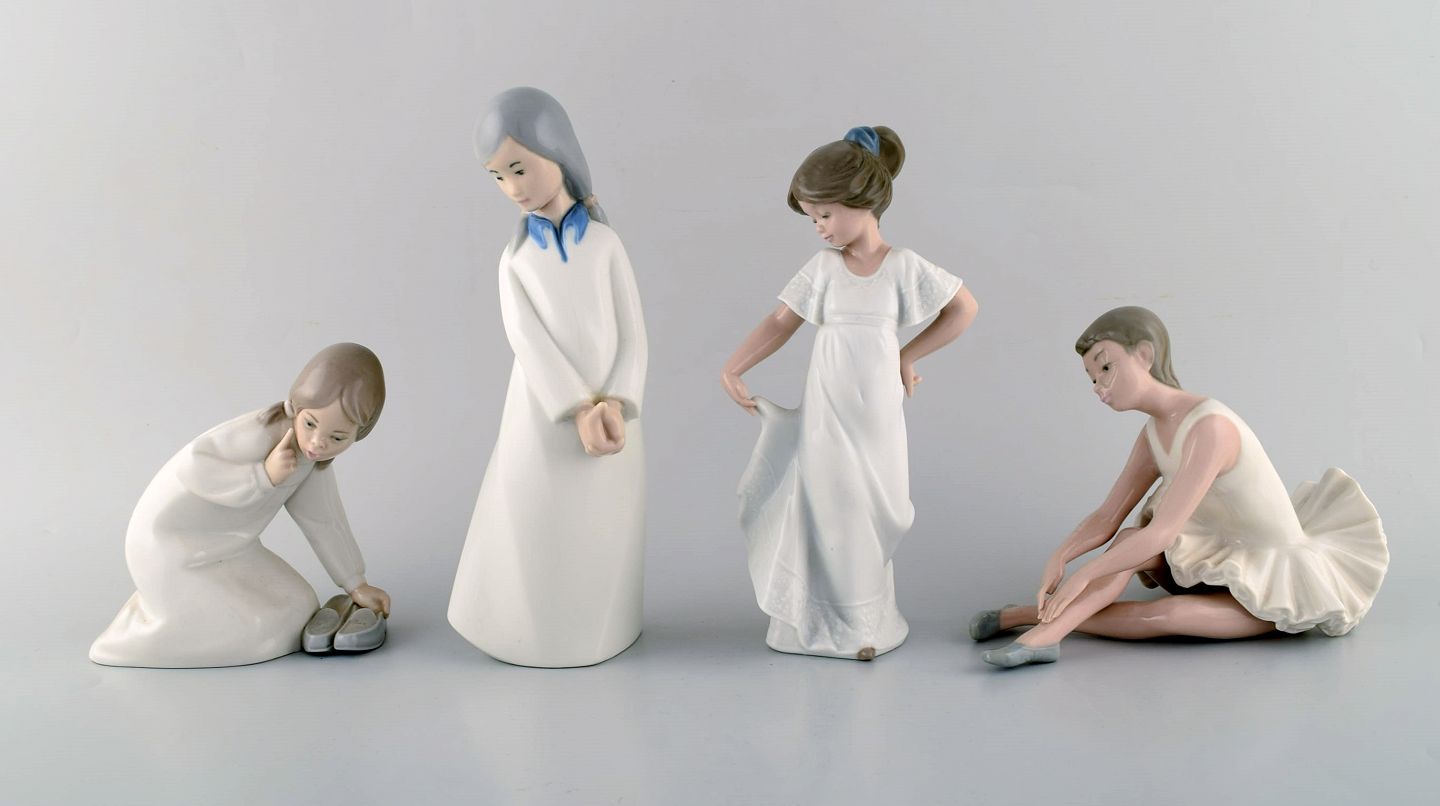 Lladro, Nao og Rex, Spanien. Fire porcelænsfigurer af unge piger. 1970/80'erne. Største måler: 24 x 9 cm. I flot stand. Stemplet.