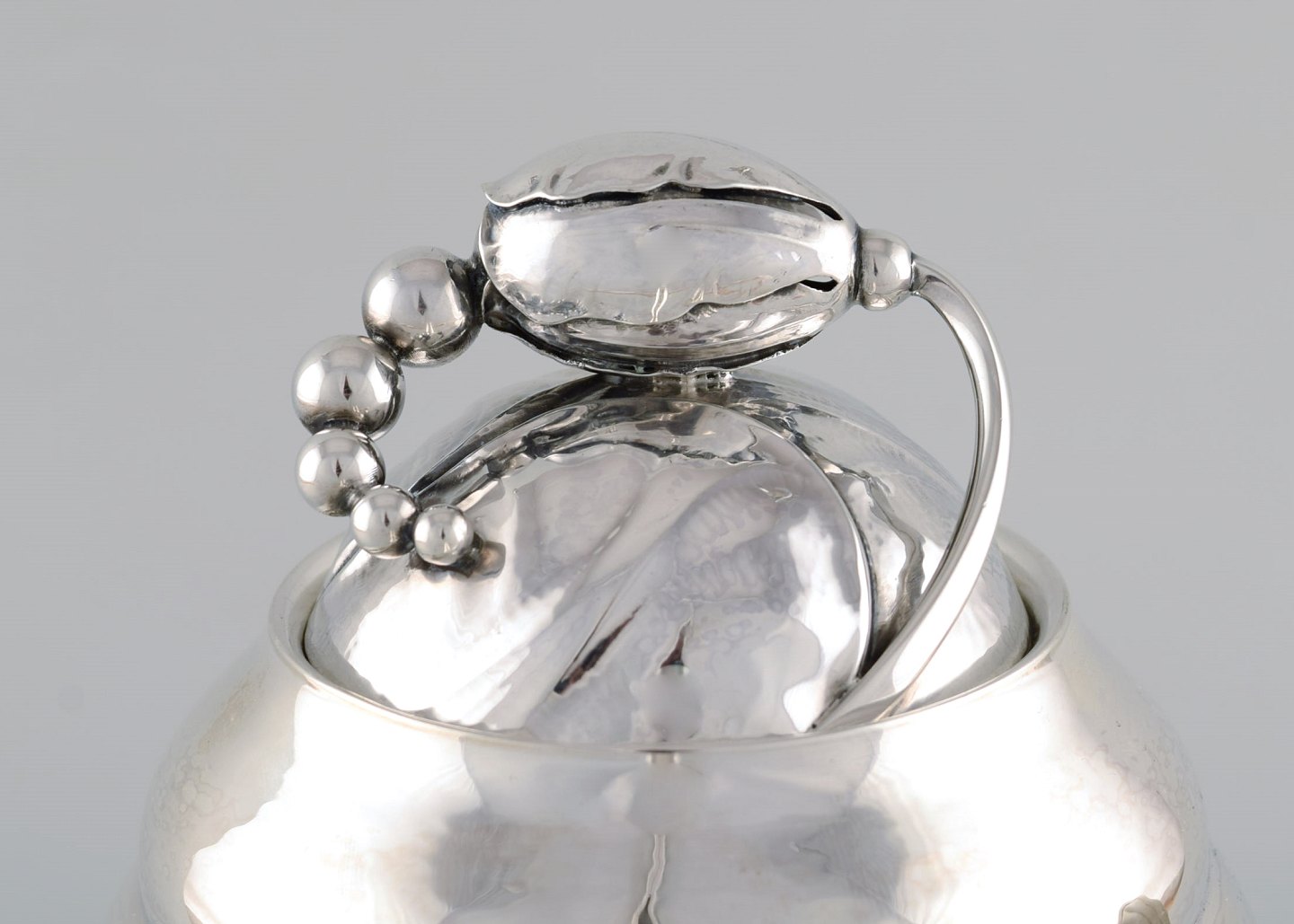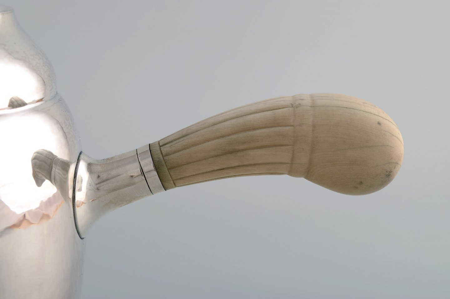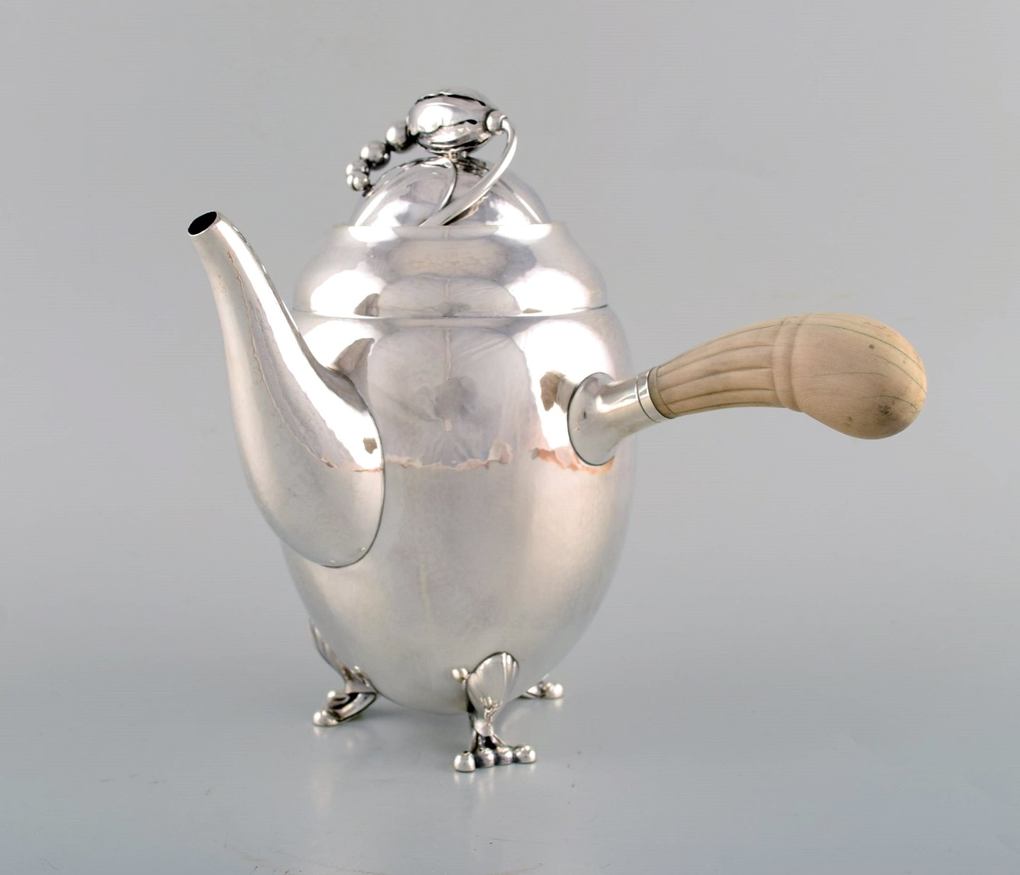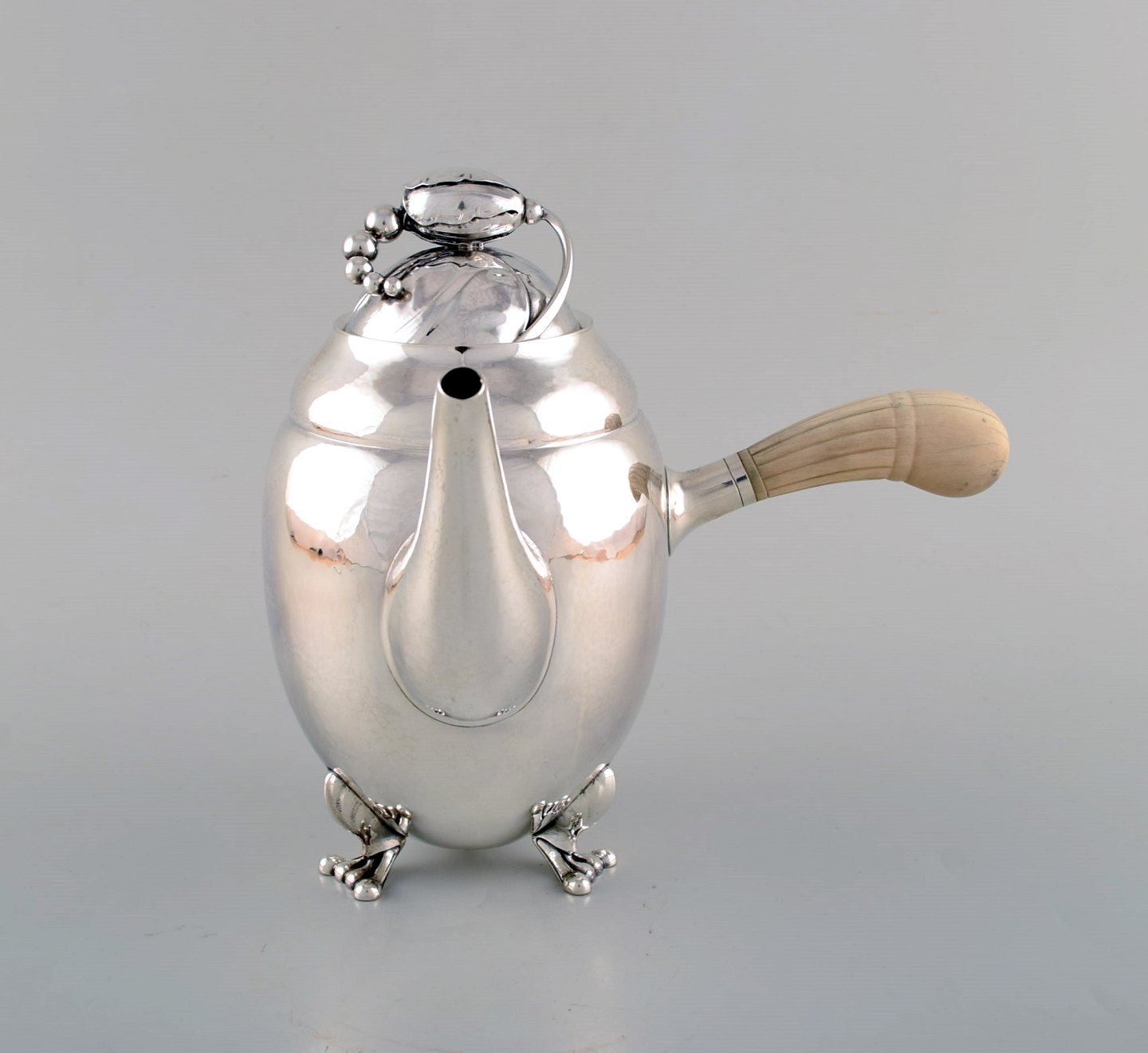 Tidlig Georg Jensen Magnolia kaffekande i sterlingsølv med hank i elfenben. Modelnummer 2D. 1920'erne. Måler: 22,5 x 22 cm. Vægt 800 gram. I flot stand. Stemplet.
