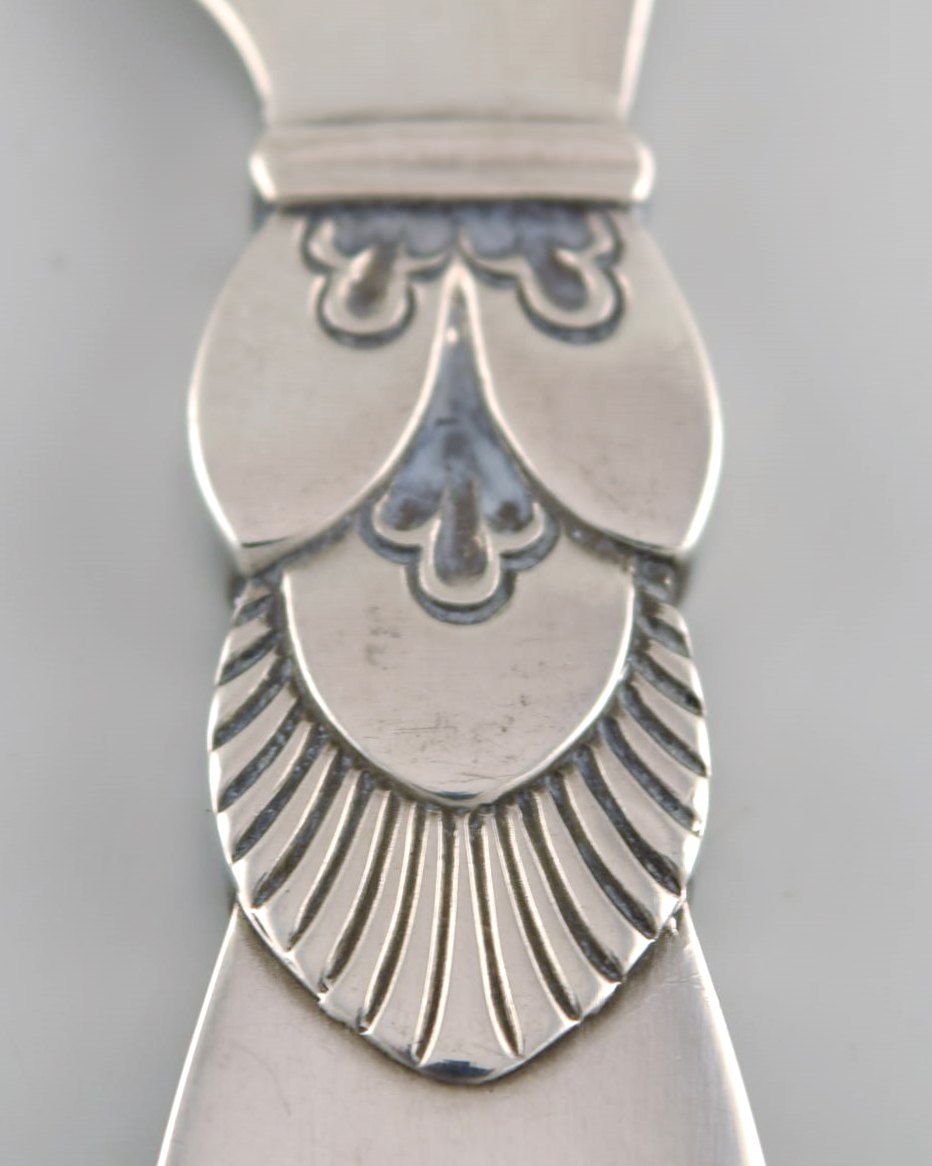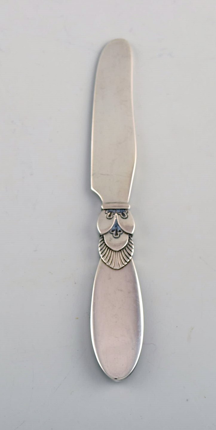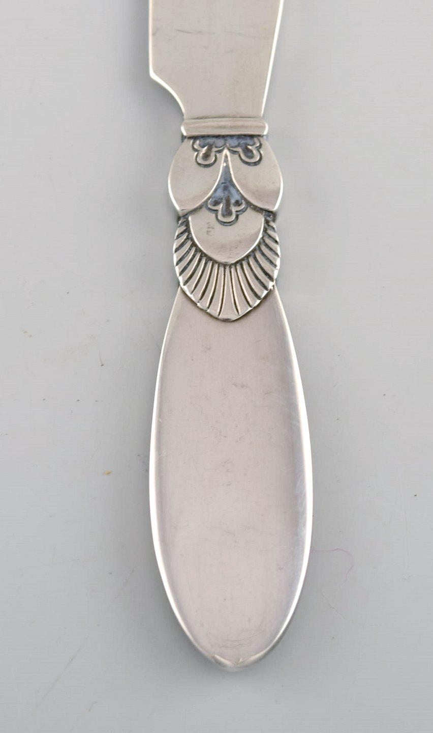 Seks Georg Jensen Kaktus smørknive i helsølv. Designer: Gundorph Albertus. Måler: 11 cm. Stemplet. I flot stand.