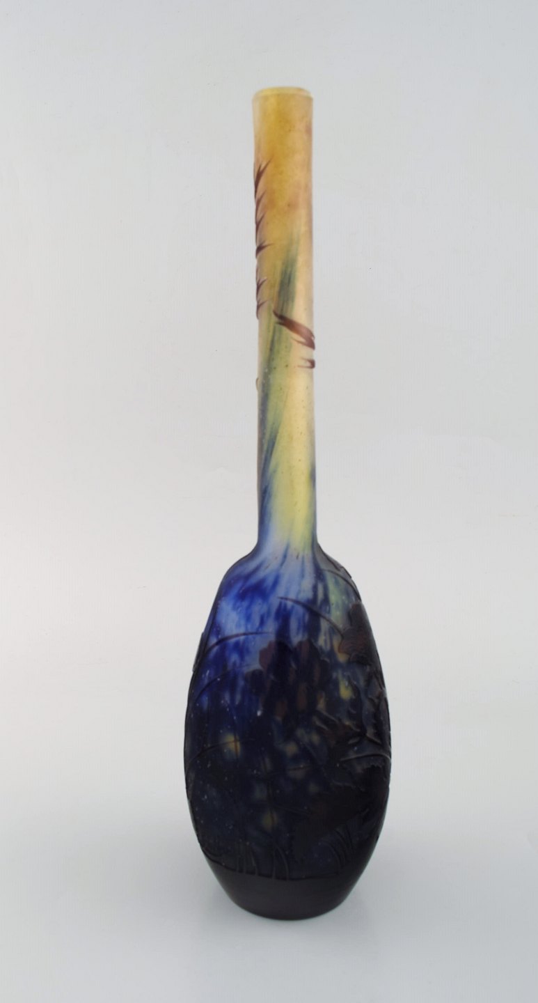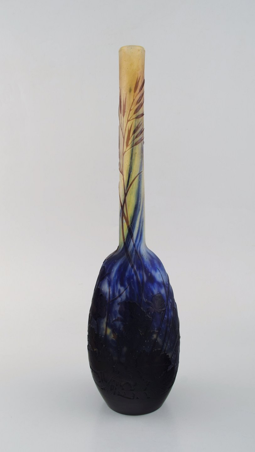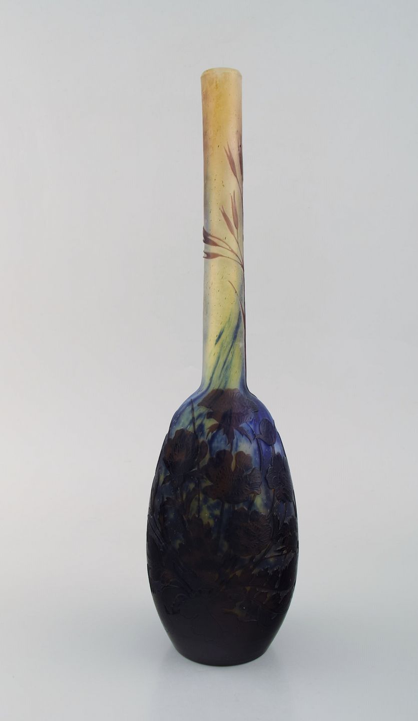 Antik Emile Gallé vase i matteret kunstglas med overfang af blåt kunstglas udskåret med motiver i form af blomster og bladværk. Tidligt 1900-tallet. Måler: 34,5 x 9,5 cm. I flot stand. Stemplet.