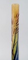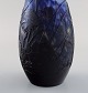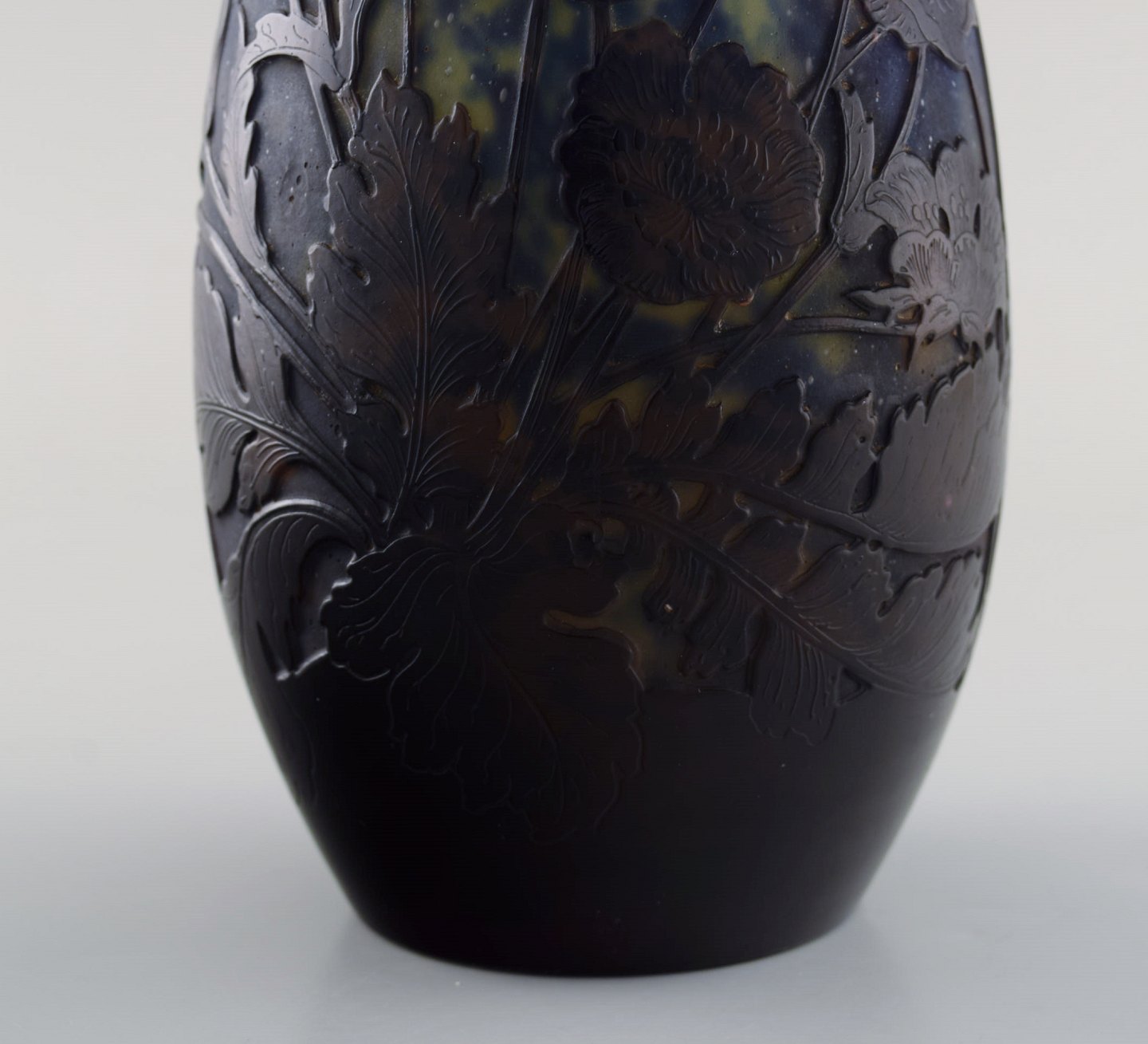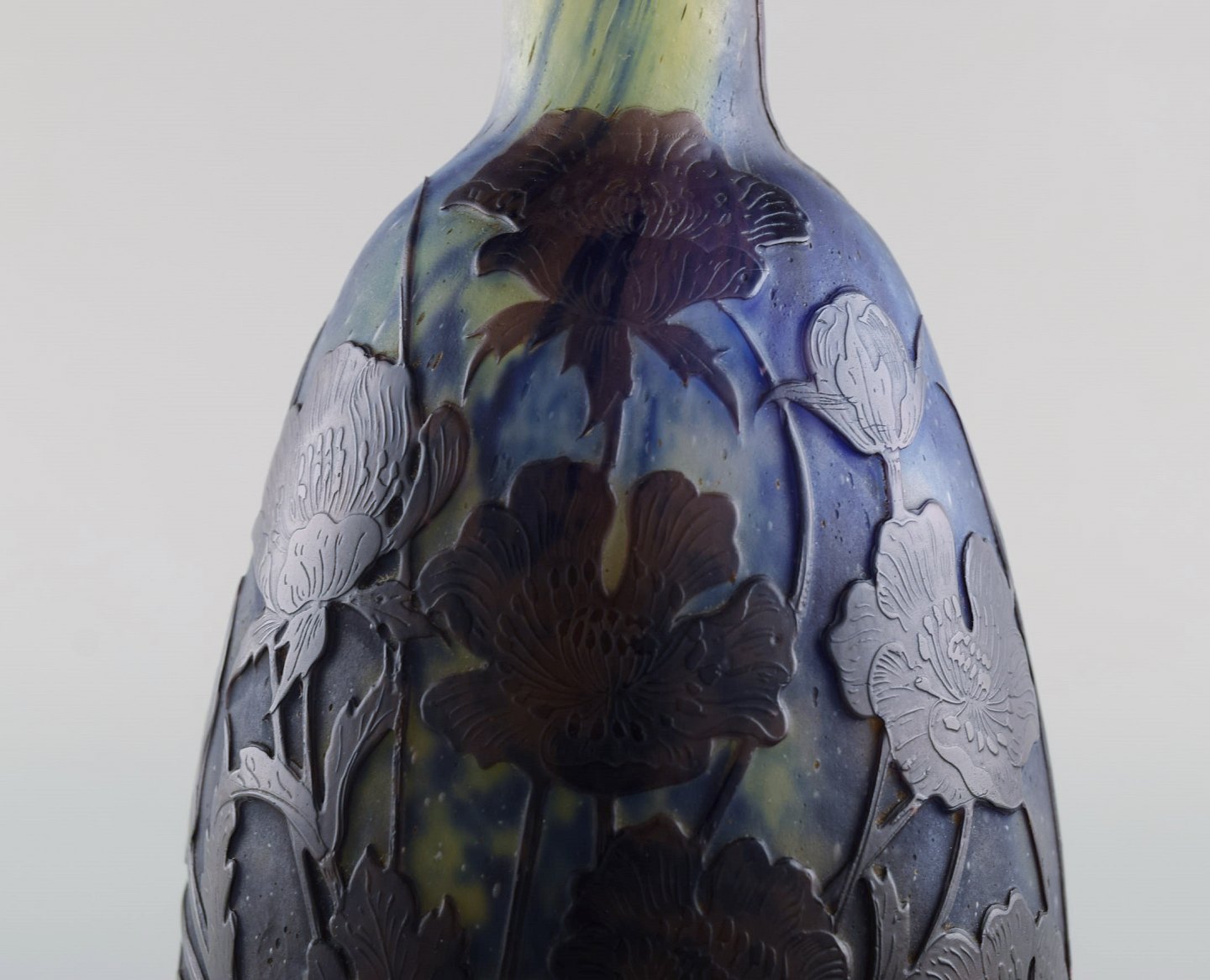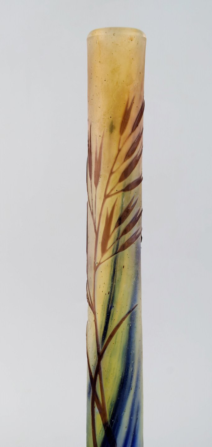 Antik Emile Gallé vase i matteret kunstglas med overfang af blåt kunstglas udskåret med motiver i form af blomster og bladværk. Tidligt 1900-tallet. Måler: 34,5 x 9,5 cm. I flot stand. Stemplet.