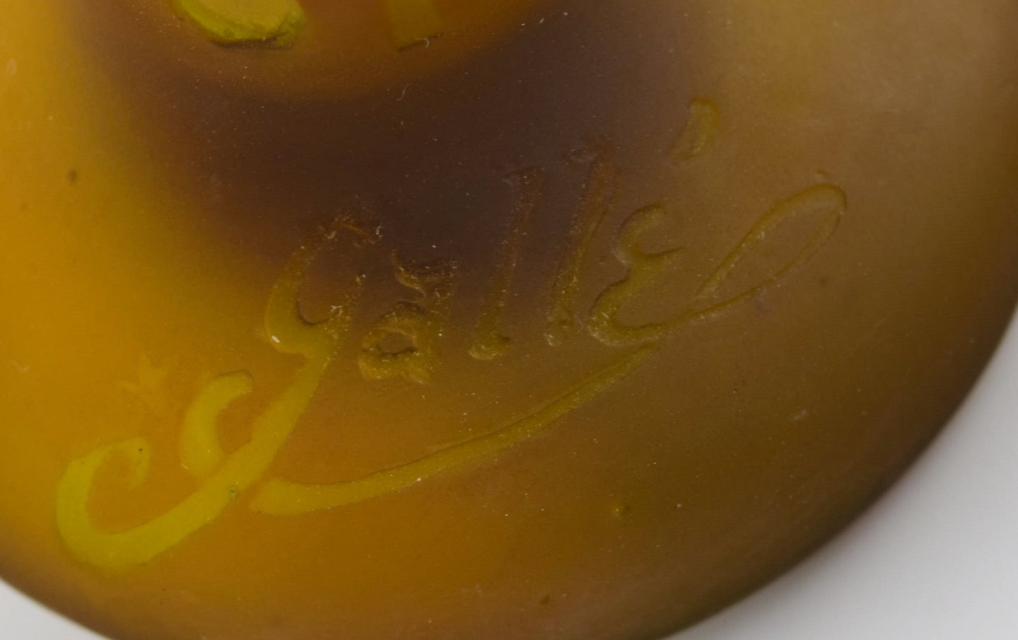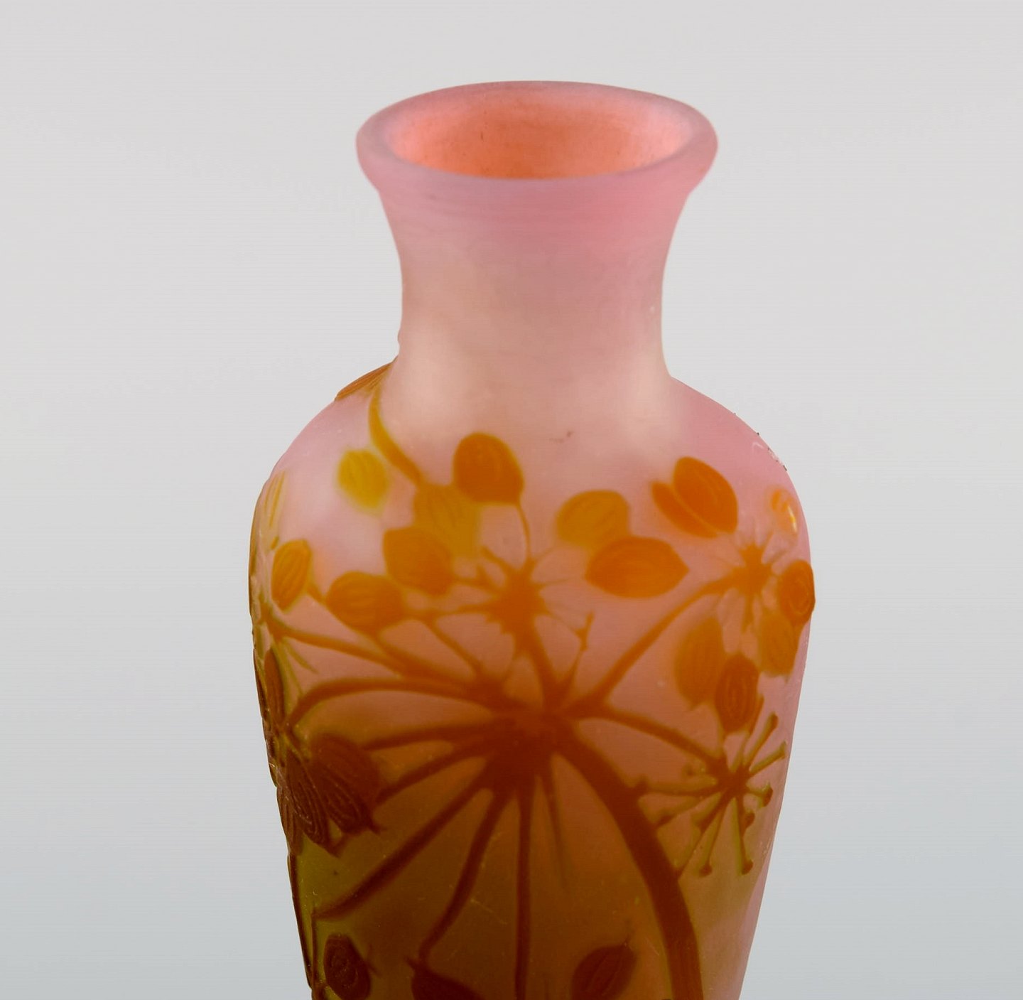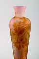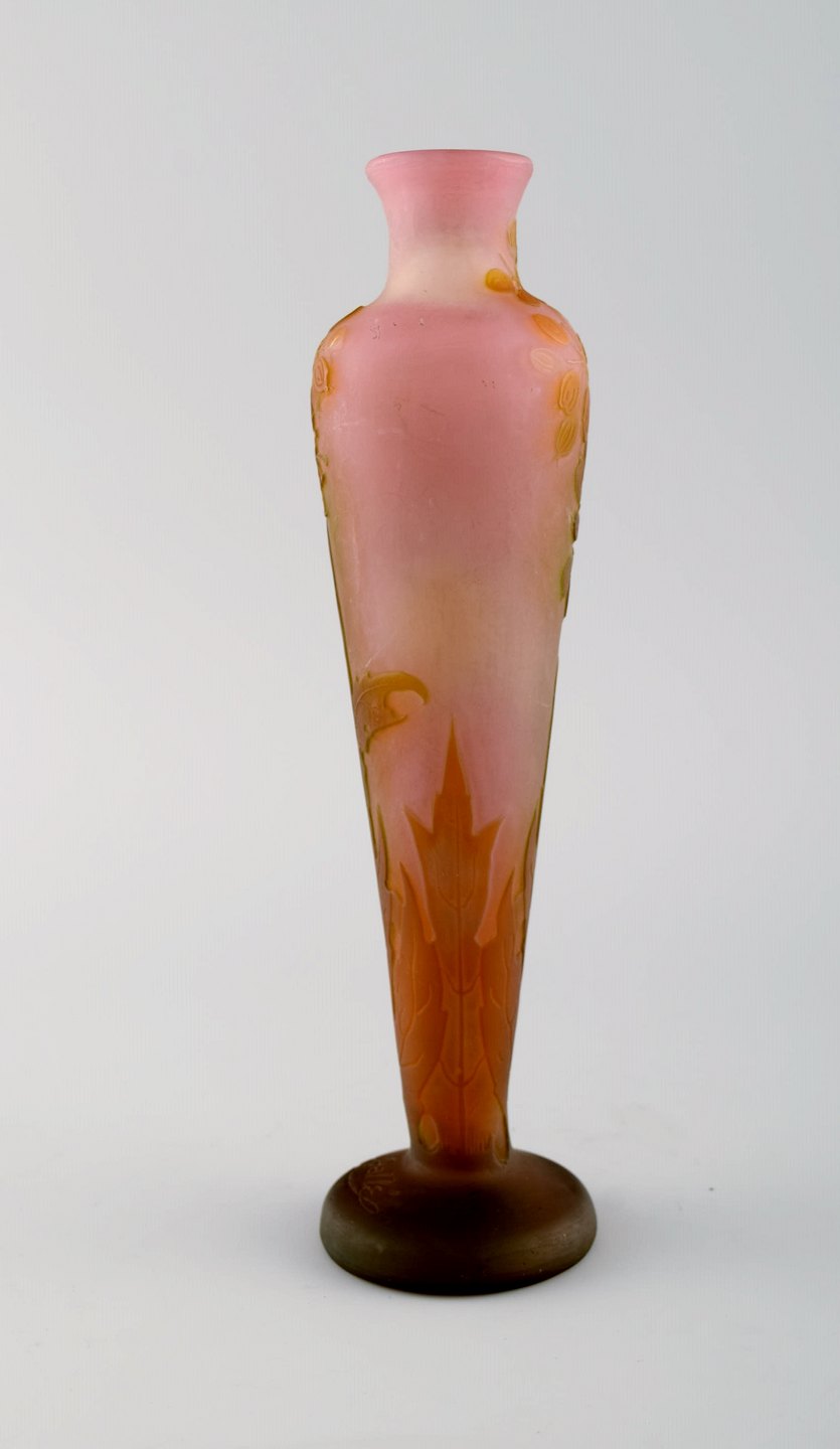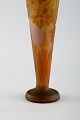 Antik Emile Gallé vase i matteret kunstglas med ravfarvet overfang udskåret med motiver i form af blomster og bladværk. Tidligt 1900-tallet.