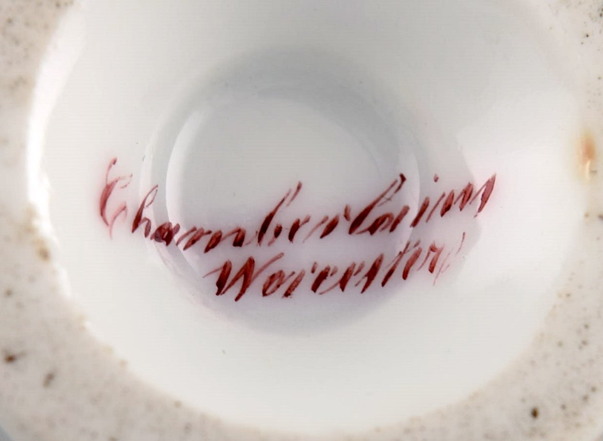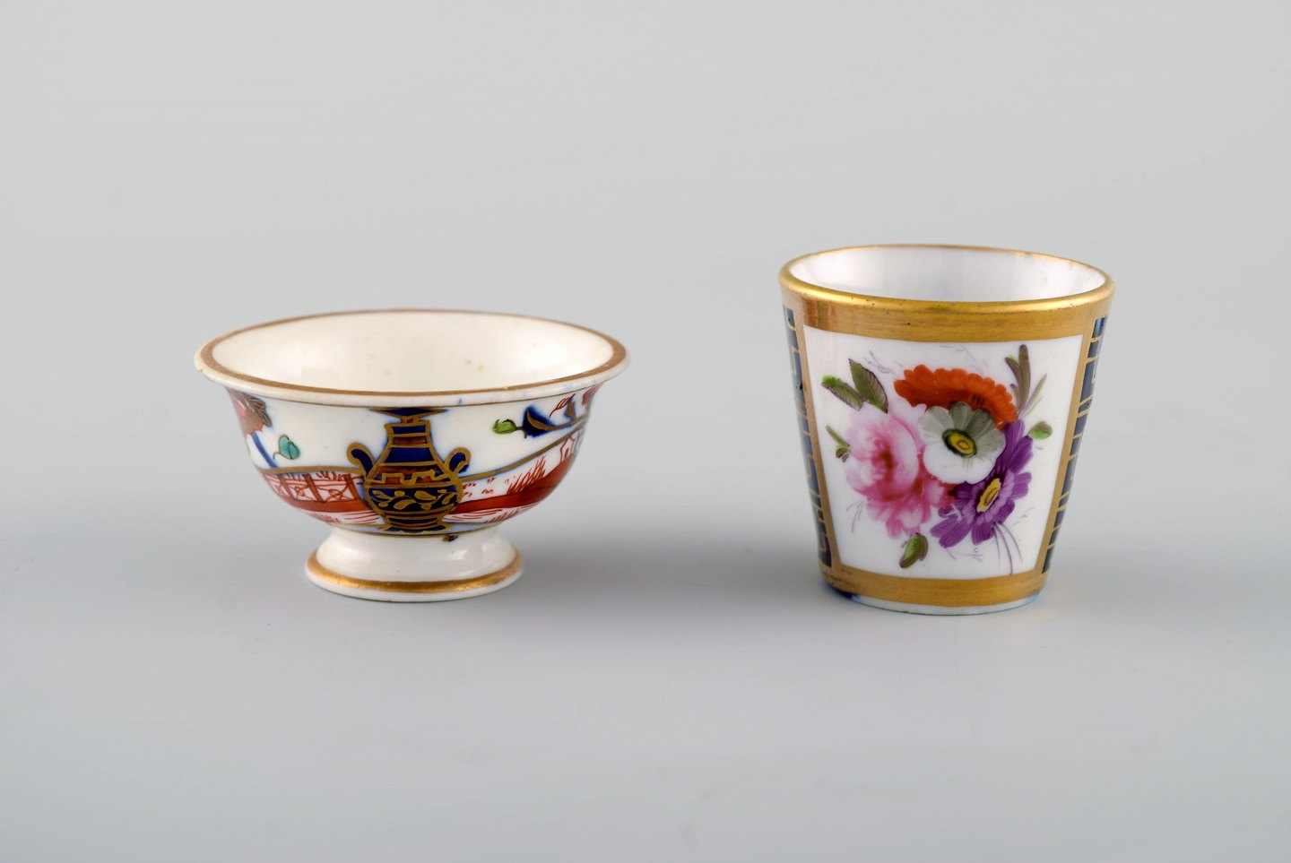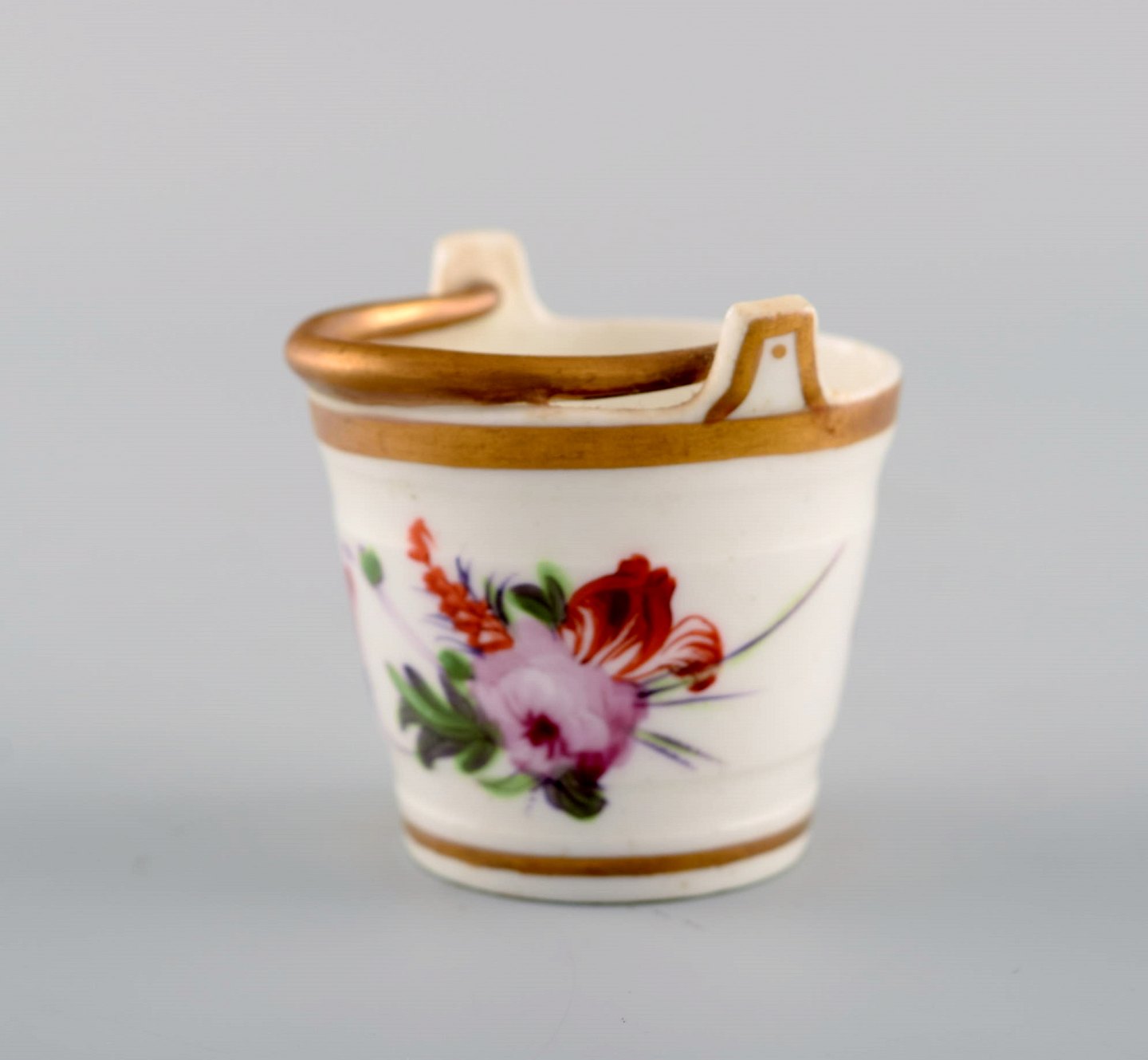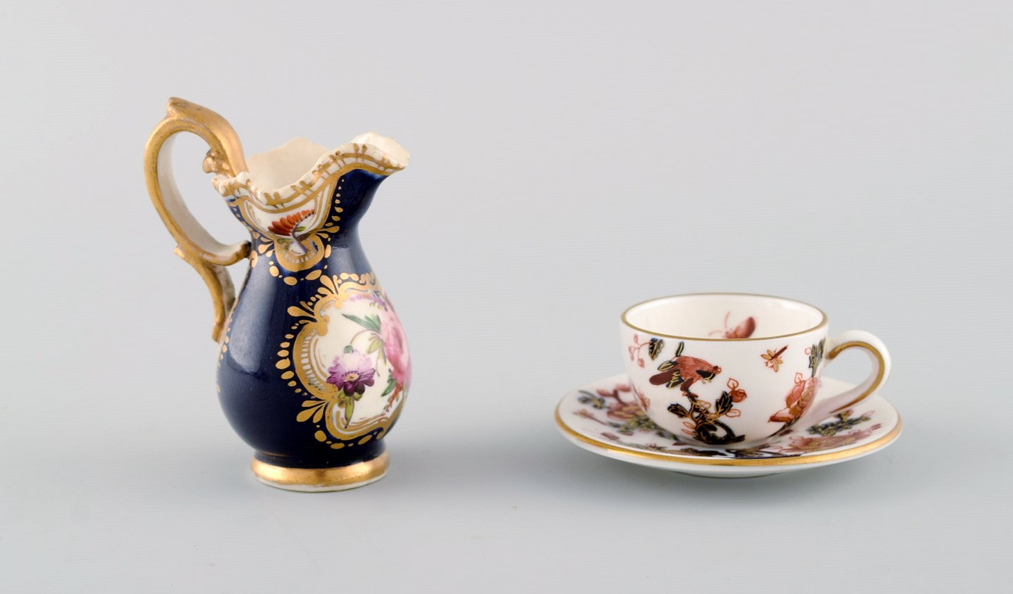 Chamberlain Worcester m.fl. Seks antikke miniaturer i håndmalet porcelæn. 1800-tallet. Kanden måler: 6,5 x 4,5 cm. Spanden måler: 5,3 x 5 cm. I flot stand. Nogle stemplet.