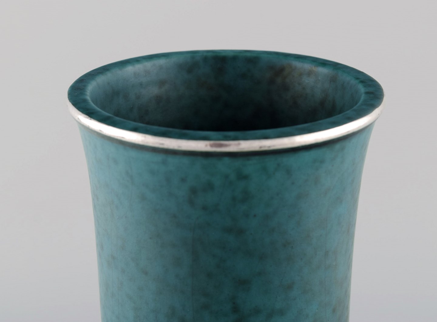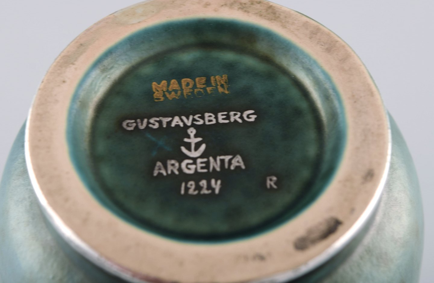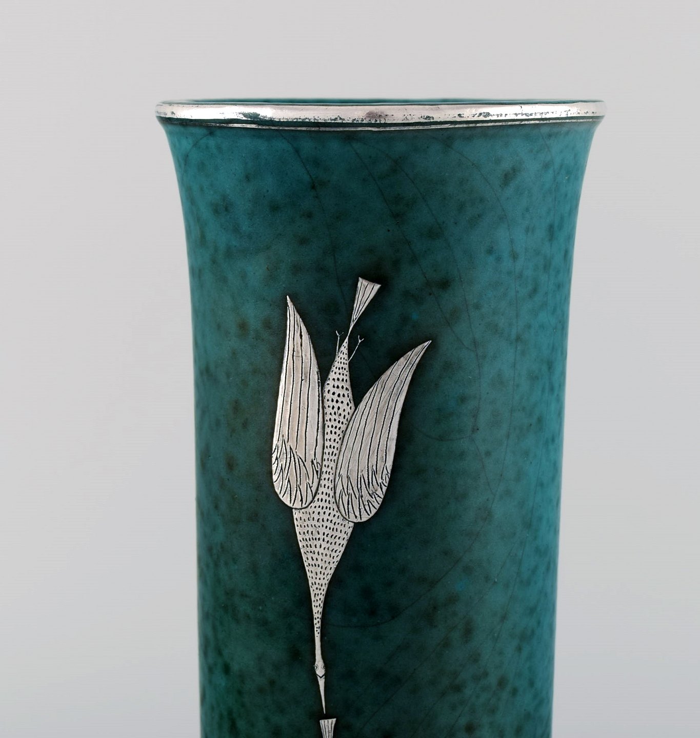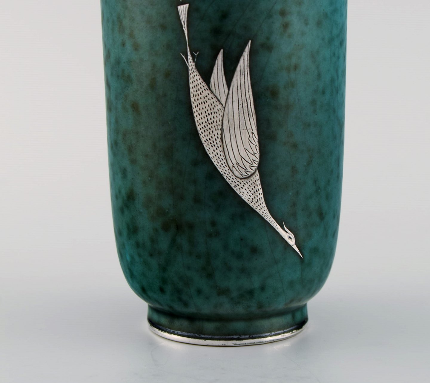 Wilhelm Kåge for Gustavsberg. Rare argenta art deco ceramic vase decorated with birds in silver inlay. Sweden 1940's. Measures 25 x 10,5 cm. Stamped: Gustavsberg, Kåge. In perfect condition.