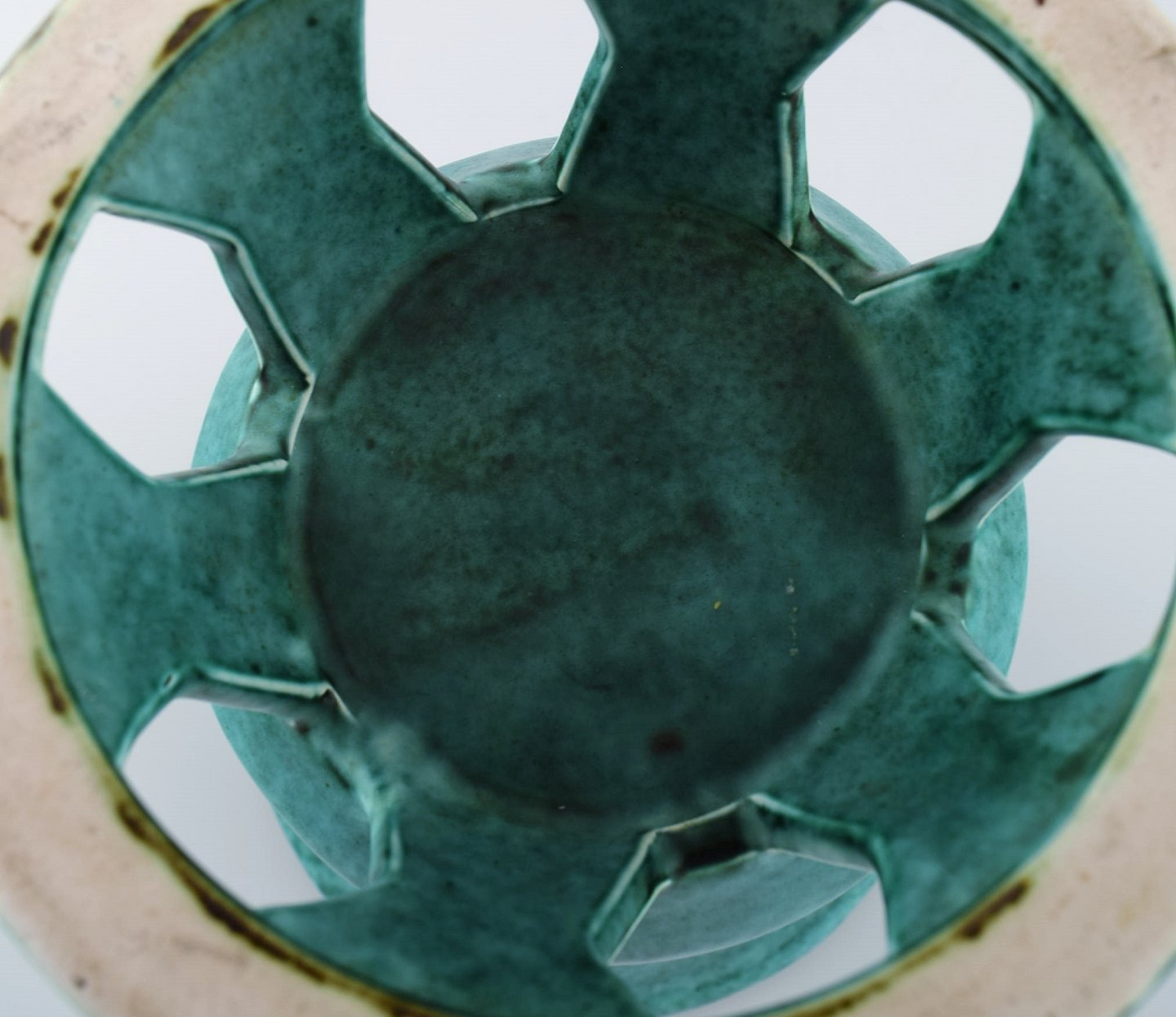 Wilhelm Kåge for Gustavsberg. Stor sjælden Argenta art deco vase i glaseret keramik dekoreret med nøgen kvinde i sølvindlæg. 1940´erne. Måler: 23 x 17,5 cm. I perfekt stand.