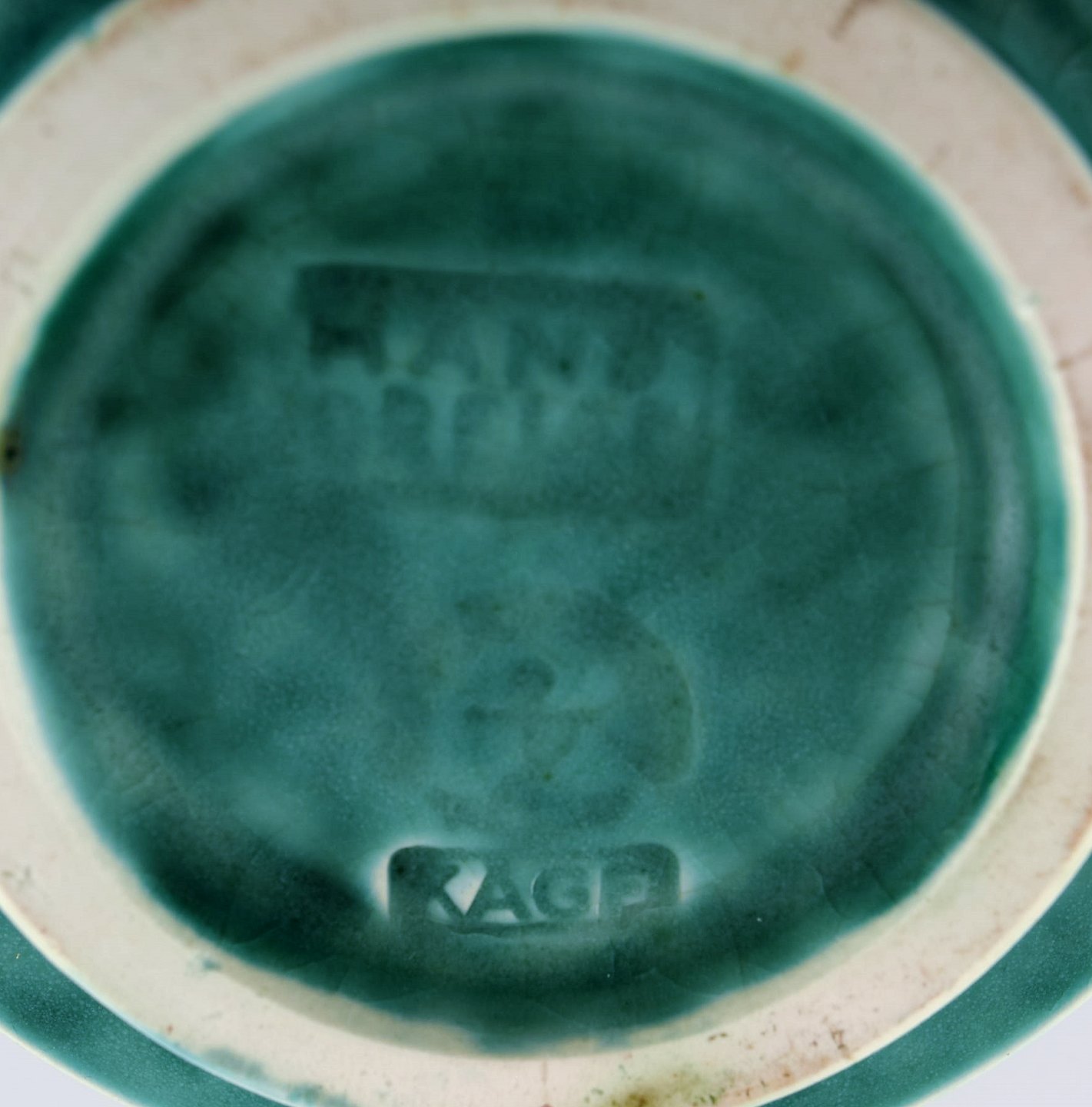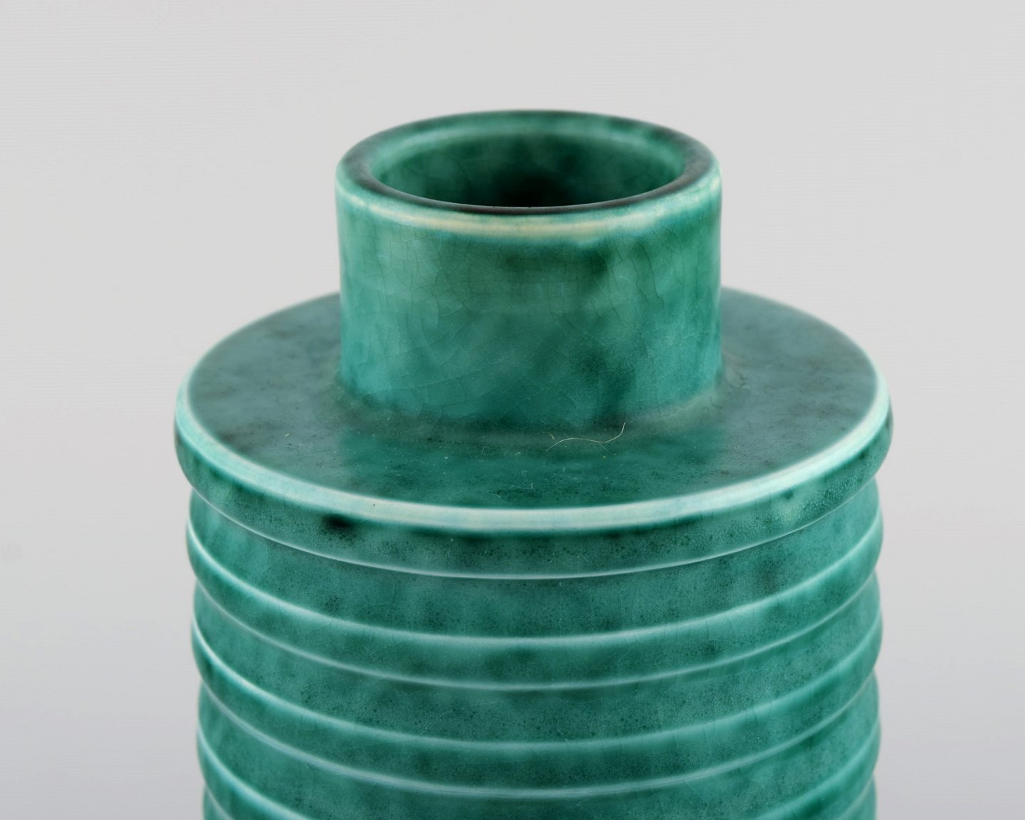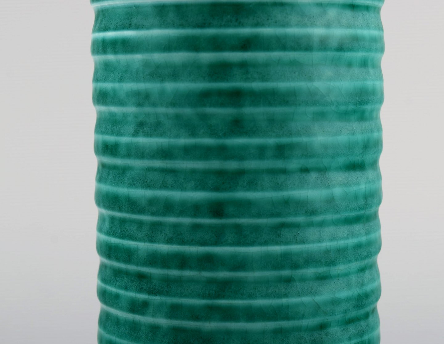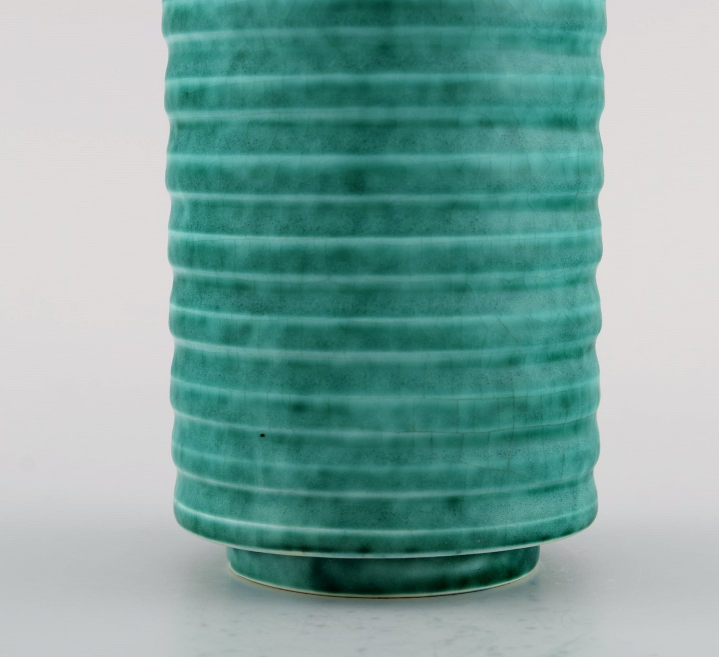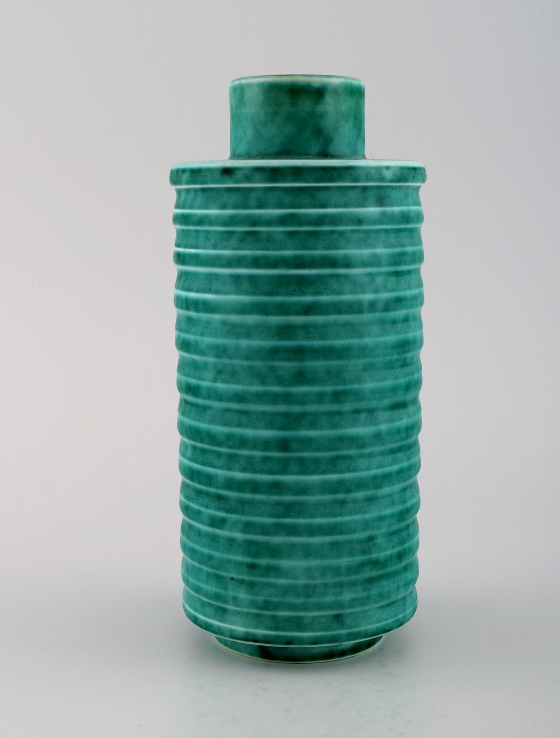 Wilhelm Kåge for Gustavsberg. Rare cylindrical Argenta art deco vase in glazed ceramics. Beautiful glaze in shades of green and grooved body. 1940's. Measures: 19 x 9 cm. In perfect condition. Stamped.