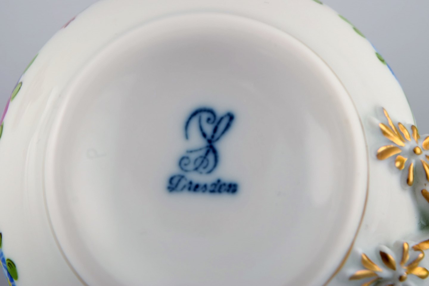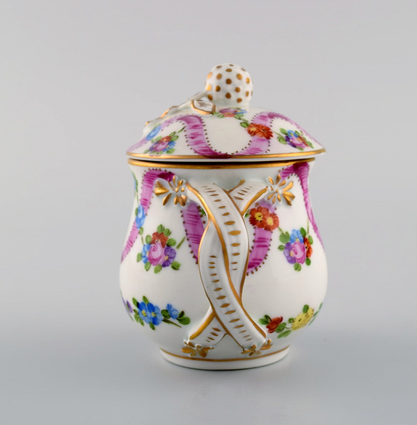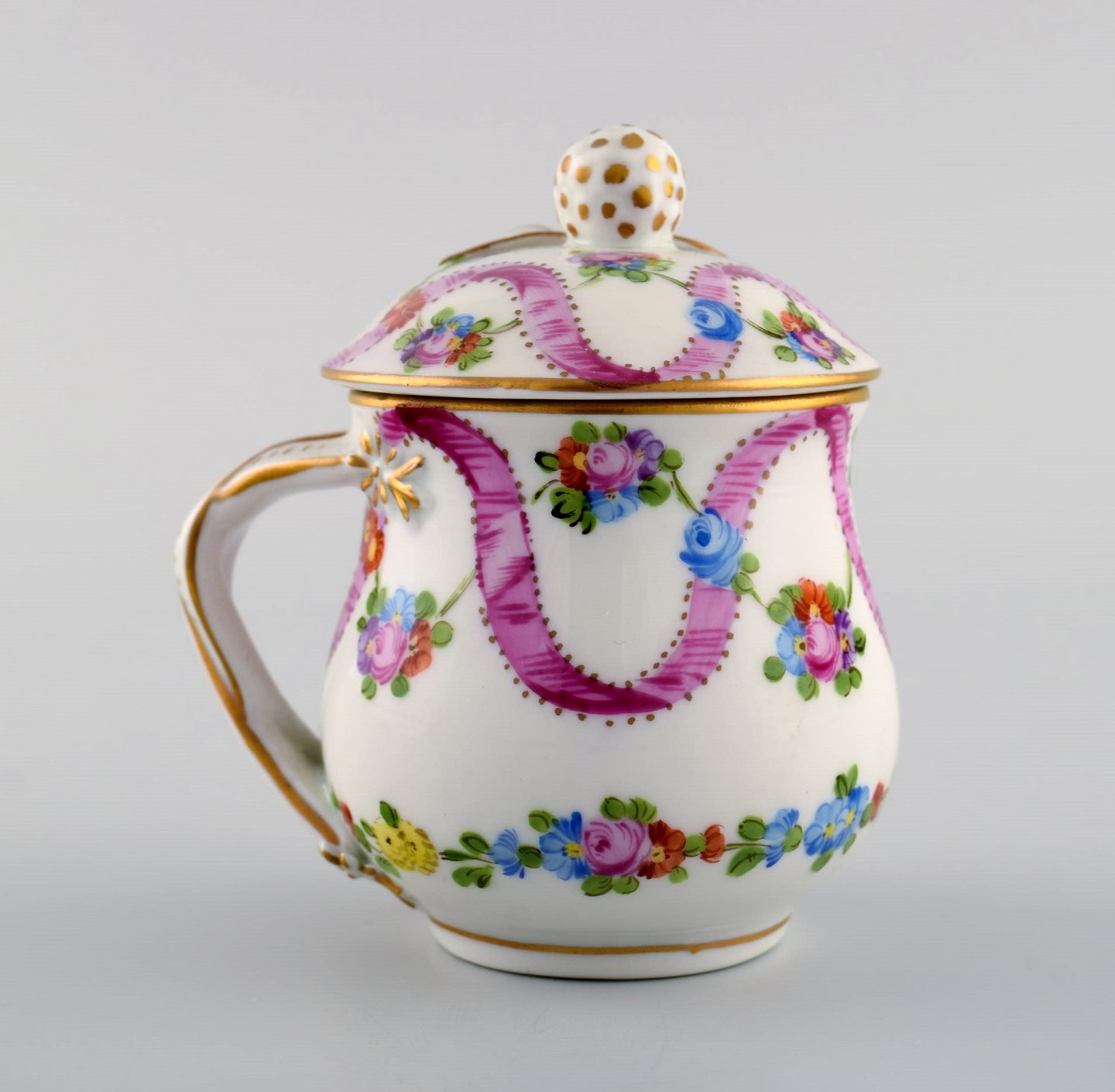 To antikke Dresden cremekopper i håndmalet porcelæn med blomster og sløjfer. Tidligt 1900-tallet. Måler: 9 x 8,5 cm. I flot stand. Stemplet.