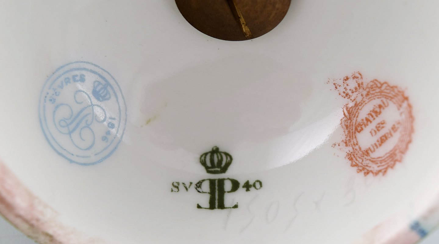 Sevres, Frankrig. Et par antikke lågpokaler i håndmalet porcelæn med motiver af adeligt par. 1800-tallet. Måler: 24,5 x 10 cm. I flot stand. Stemplet.