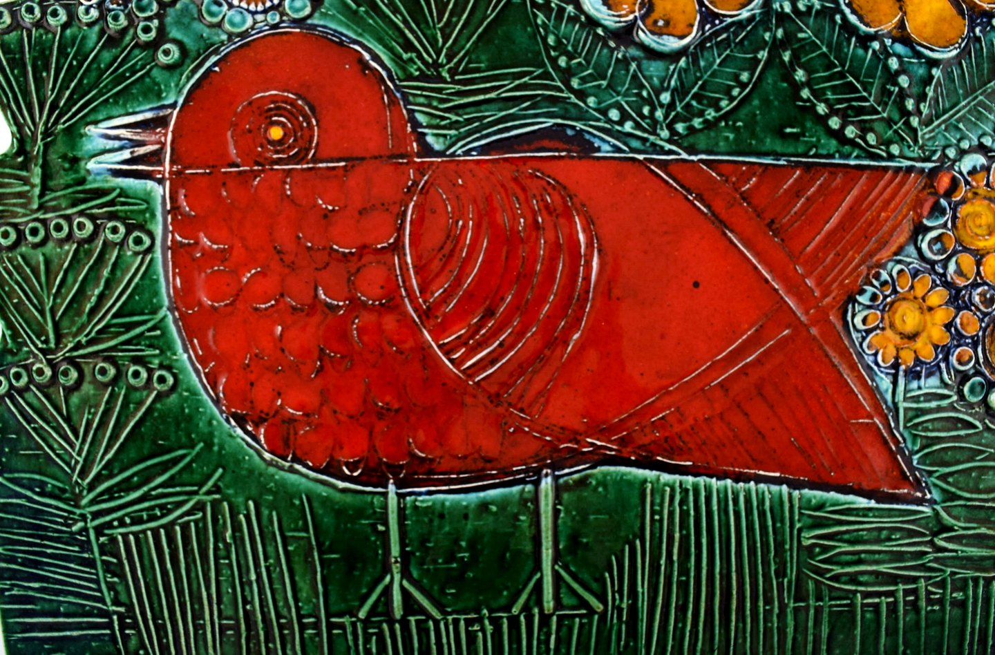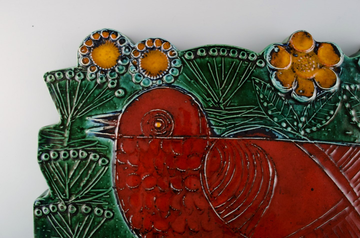 Lisa Larson for Gustavsberg. Stor og sjælden vægdekoration. Rød fugl på grøn baggrund. 1960'erne. I flot stand. Stemplet. Måler: 42 x 31,5 cm.