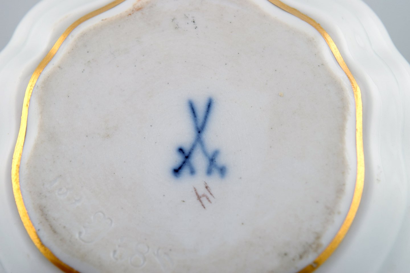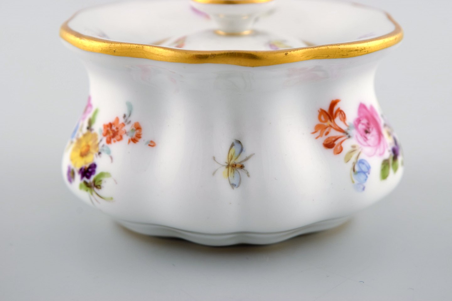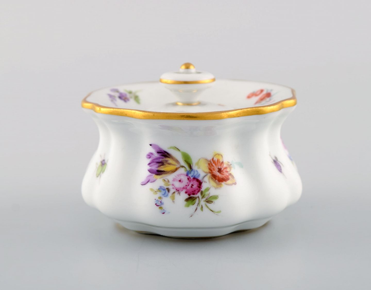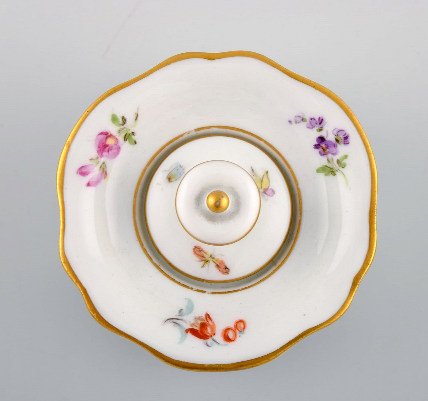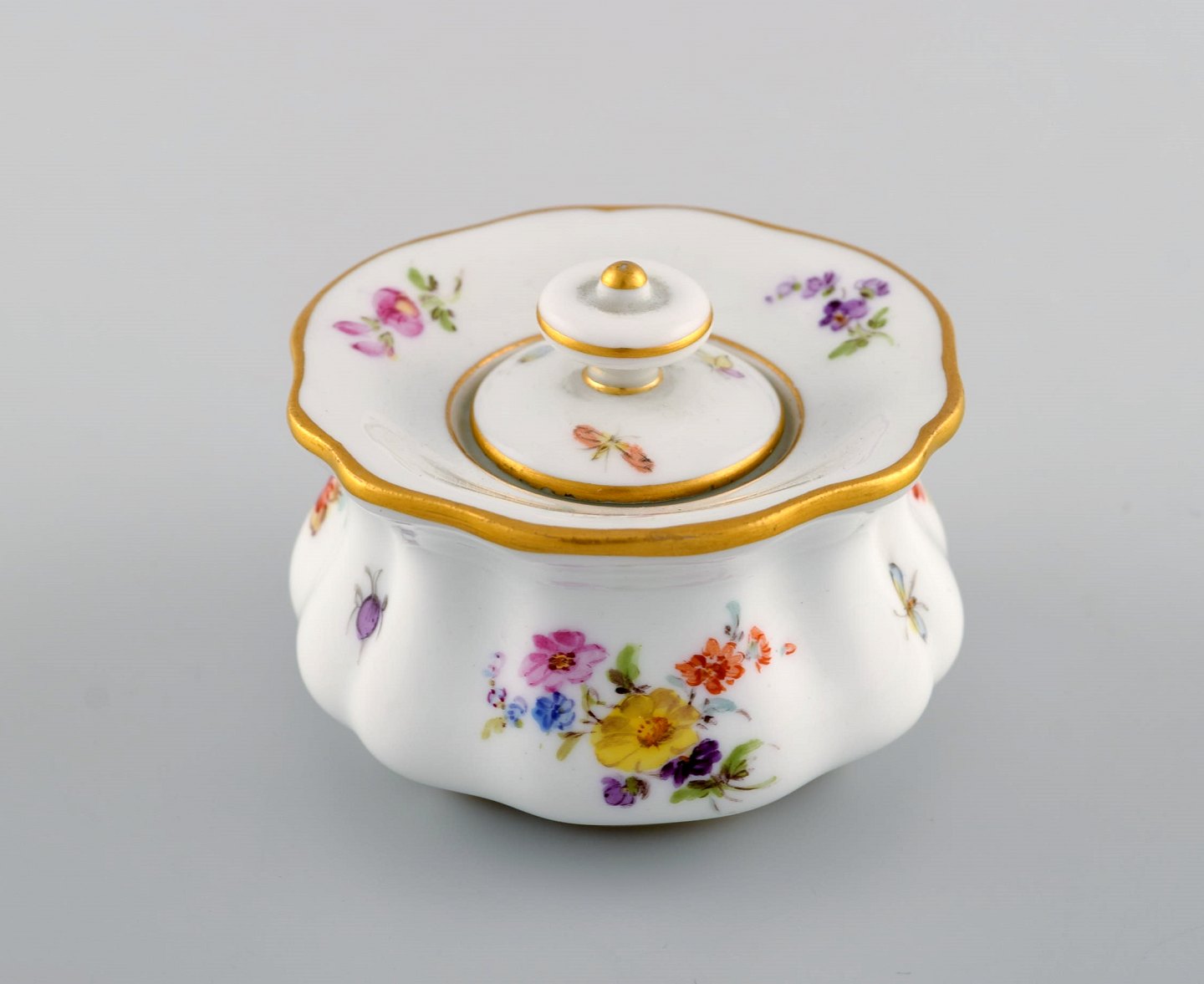 Antikt Meissen blækhus i håndmalet porcelæn med blomstermotiver og guldkant. 1800-tallet. Måler: 7,5 x 5 cm. I flot stand. Stemplet.