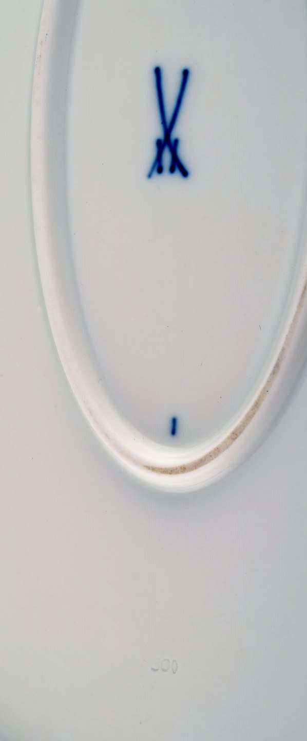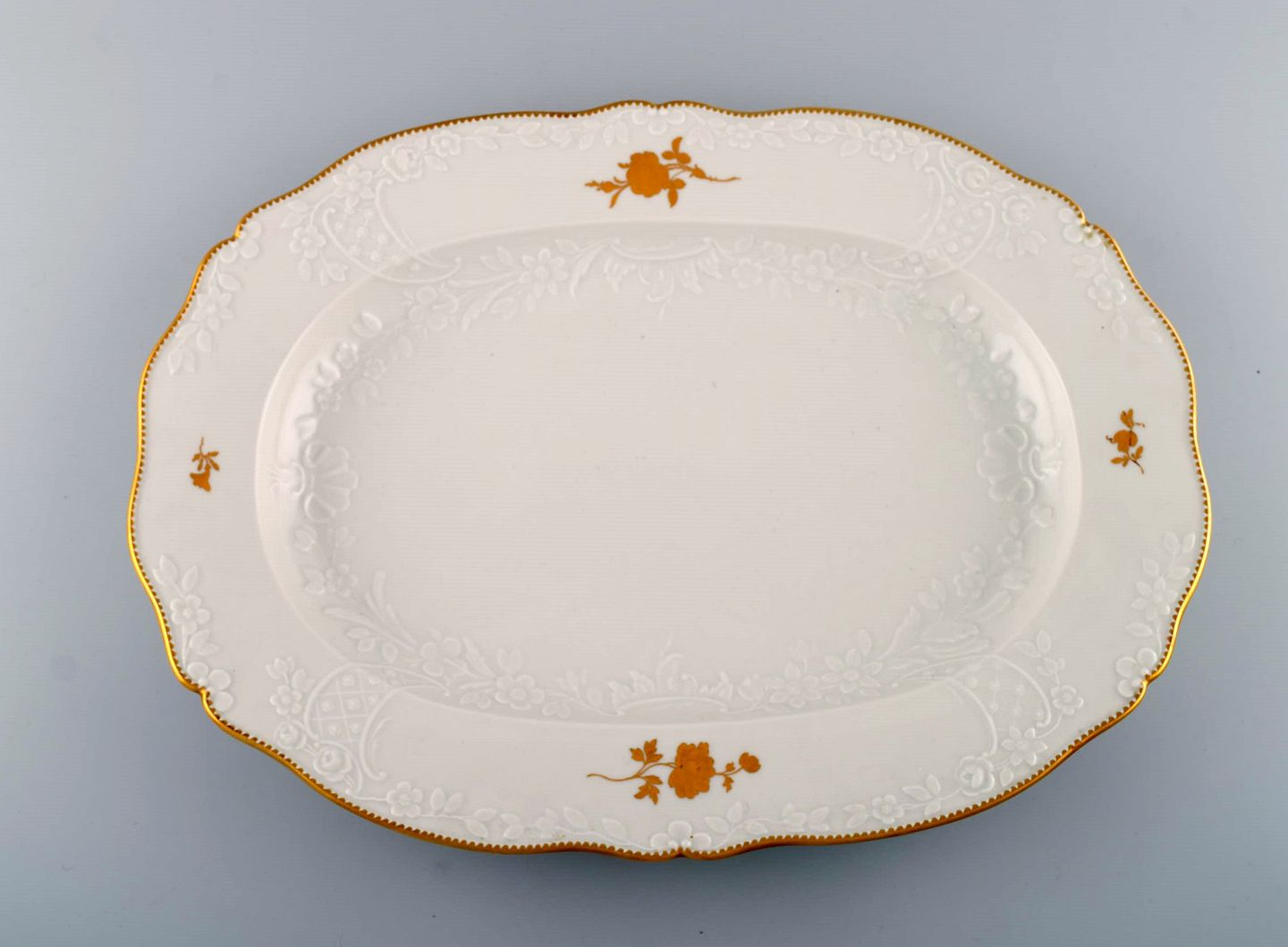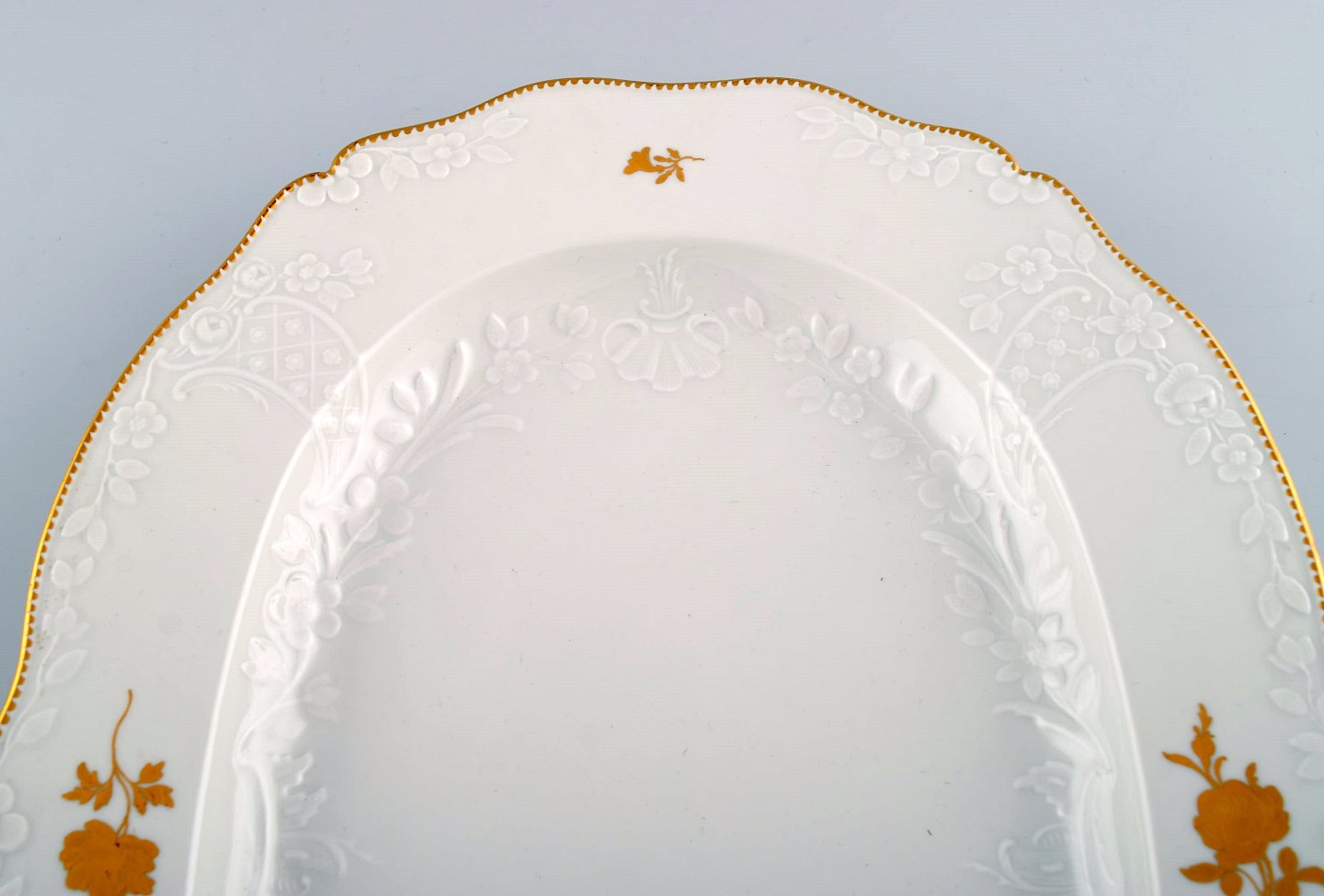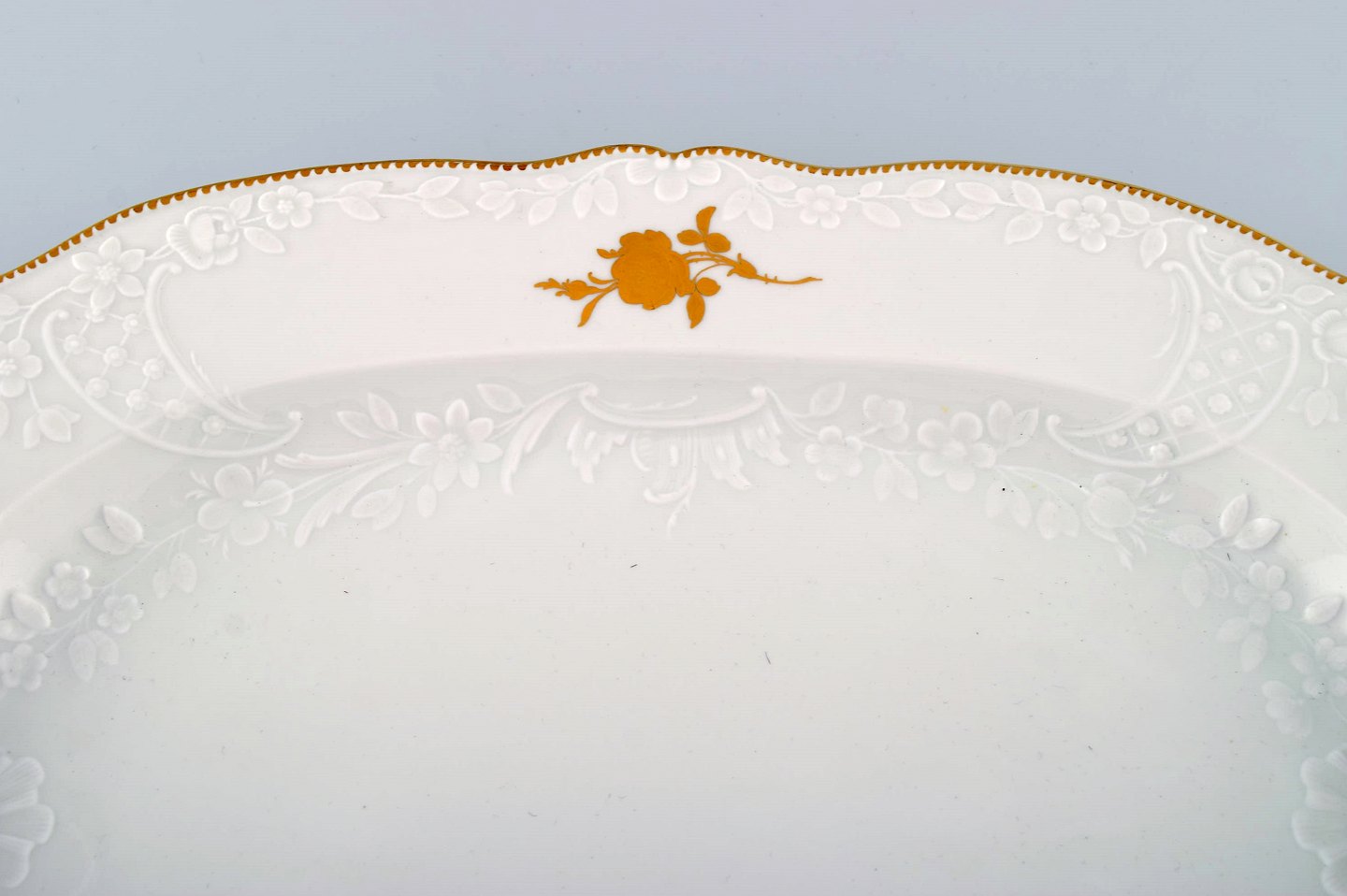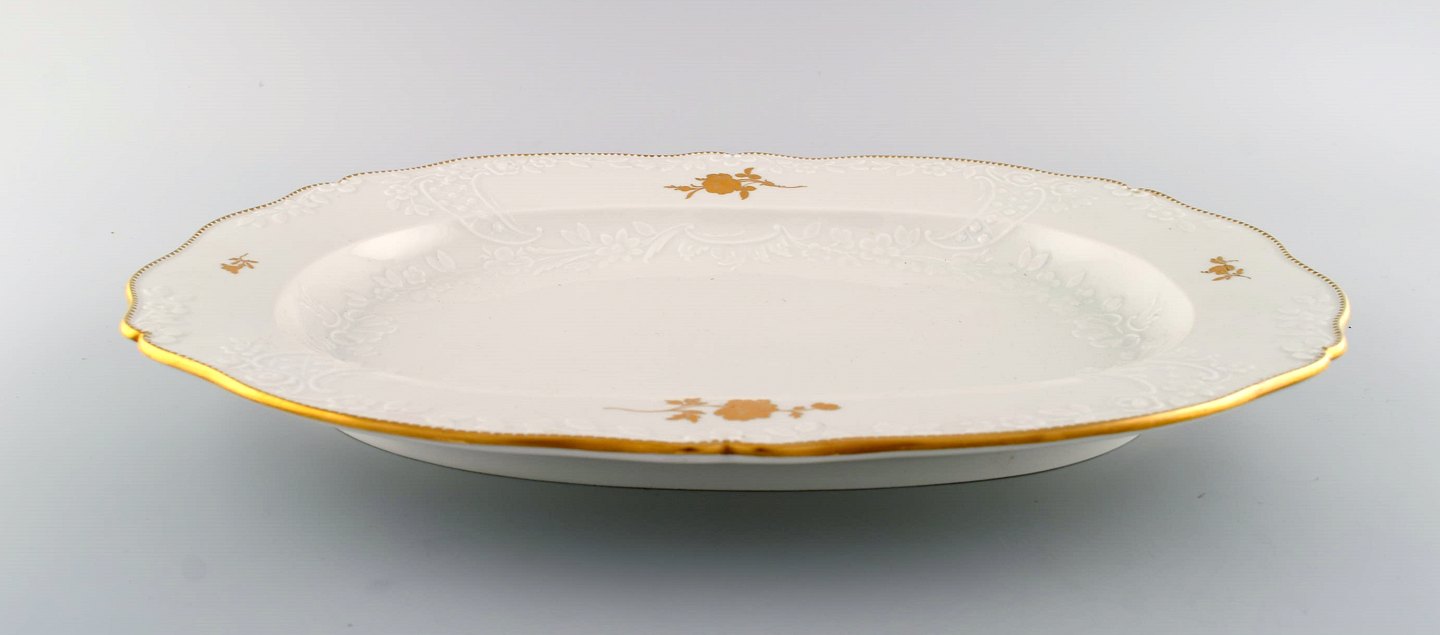 Large Meissen serving dish in porcelain with flowers and foliage in relief and gold decoration. 20th century. Measures: 40 x 31 x 4.5 cm. In good condition with small chip on the backside edge. Stamped.