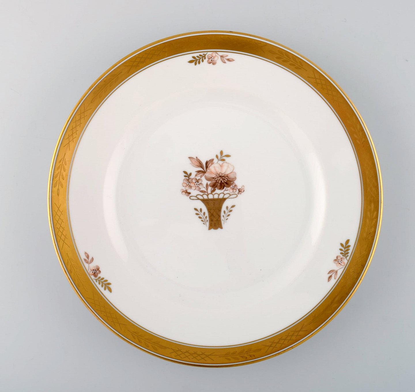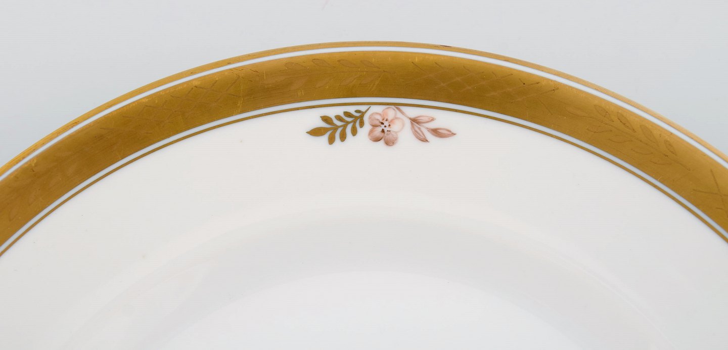 12 Royal Copenhagen "Guldkurv" middagstallerkener med guldkant. Modelnummer 9586. Midt 1900-tallet. 1. Sortering. I flot stand. Stemplet. Diameter: 25,5 cm.